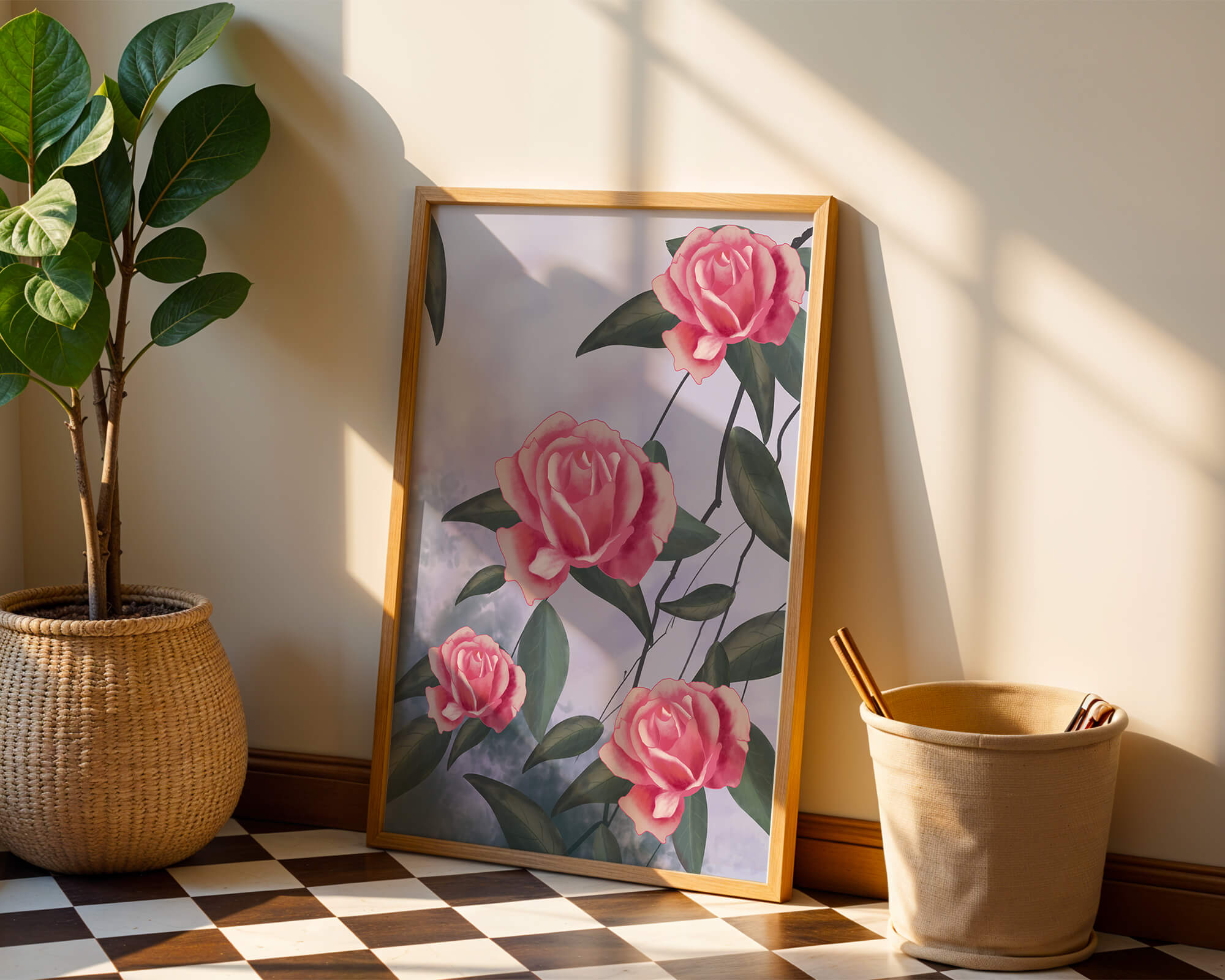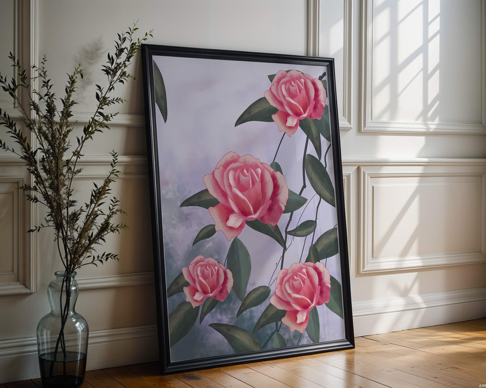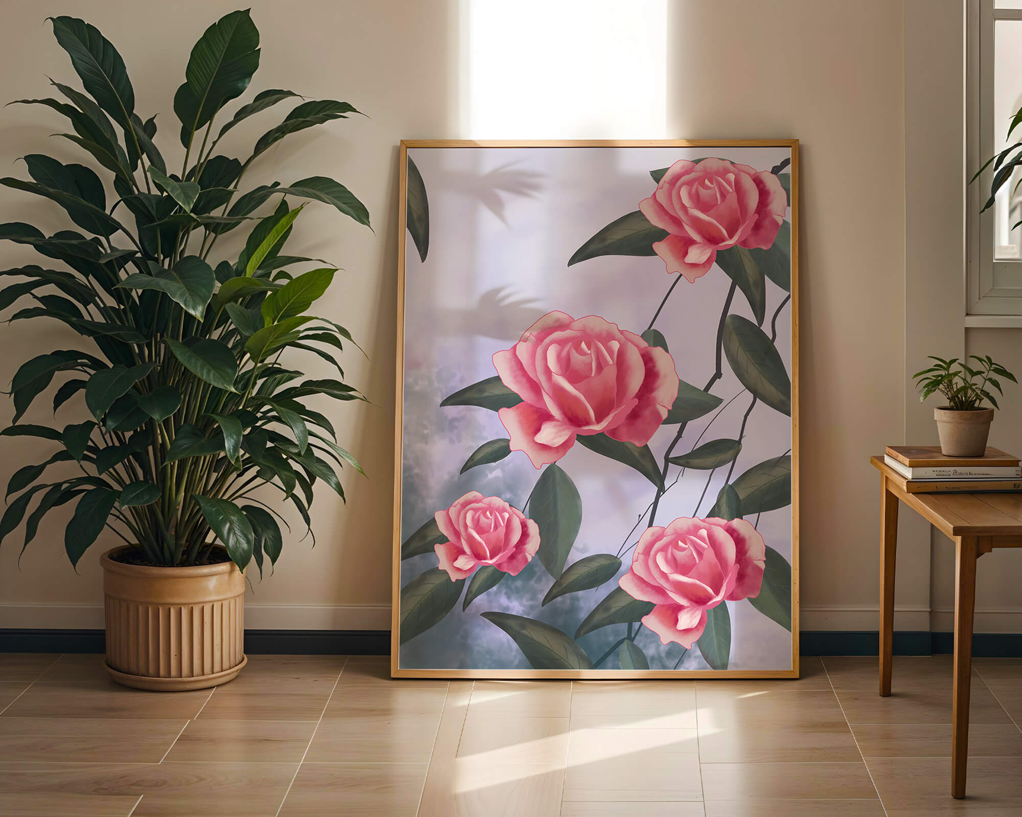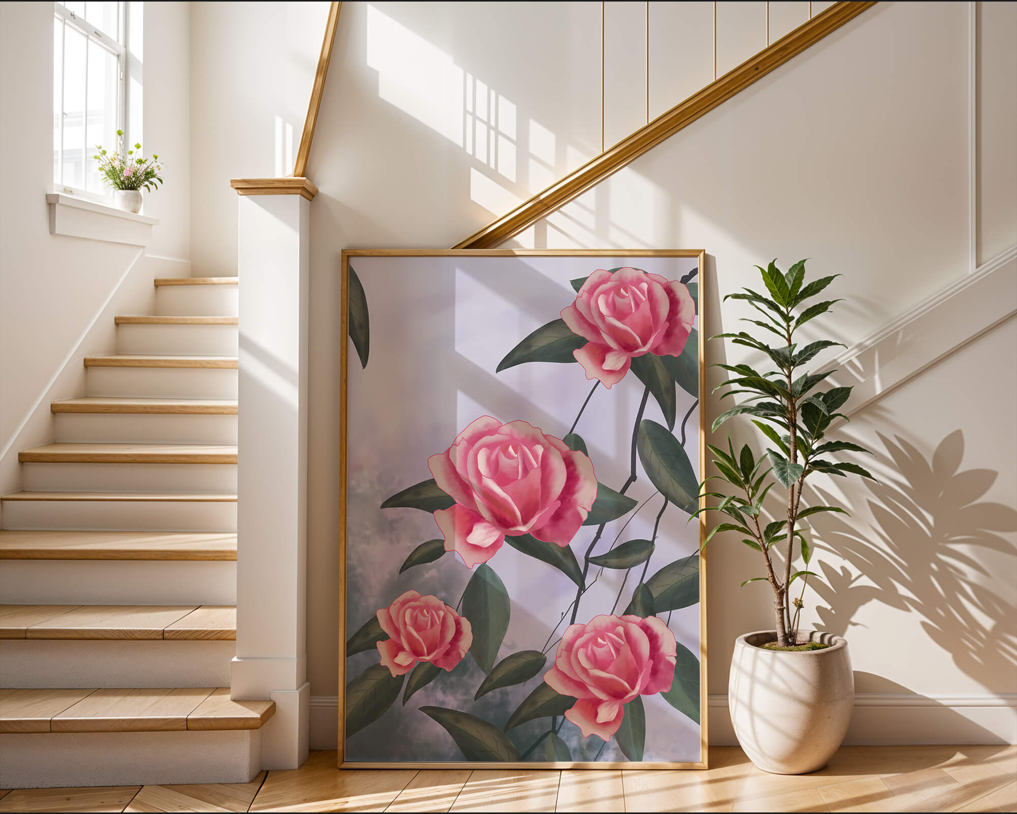 Dieses Kunstwerk zeigt drei exquisite rosa Rosen in voller Blüte, begleitet von ihren grünen Blättern. Jede Rose ist präzise dargestellt, wobei die zarten Blütenblätter und die subtilen Variationen ihrer Pastelltönen hervorgehoben werden. Der weiche Hintergrund sorgt für Kontrast und betont die natürliche Schönheit und die leuchtenden Farben der Flora. Die sanfte Verflechtung der Rosenstiele verleiht der Komposition einen Hauch von Eleganz und macht sie zur idealen Wahl für eine Vielzahl von Inneneinrichtungen. Ob gemütliches Schlafzimmer oder stilvolles Wohnzimmer – dieses anmutige Blumenarrangement wertet jeden Raum mit seinem zeitlosen Charme und seiner Ruhe auf.| Typ |