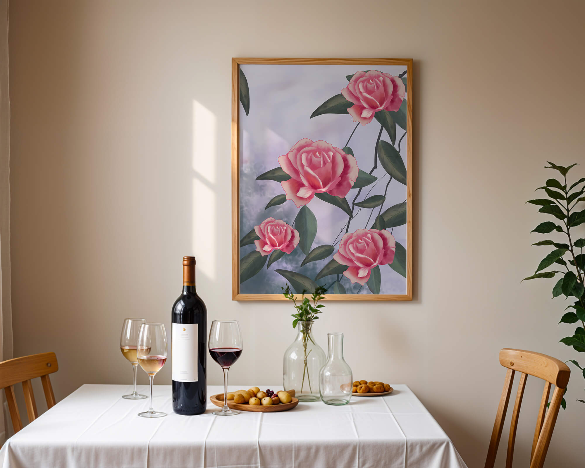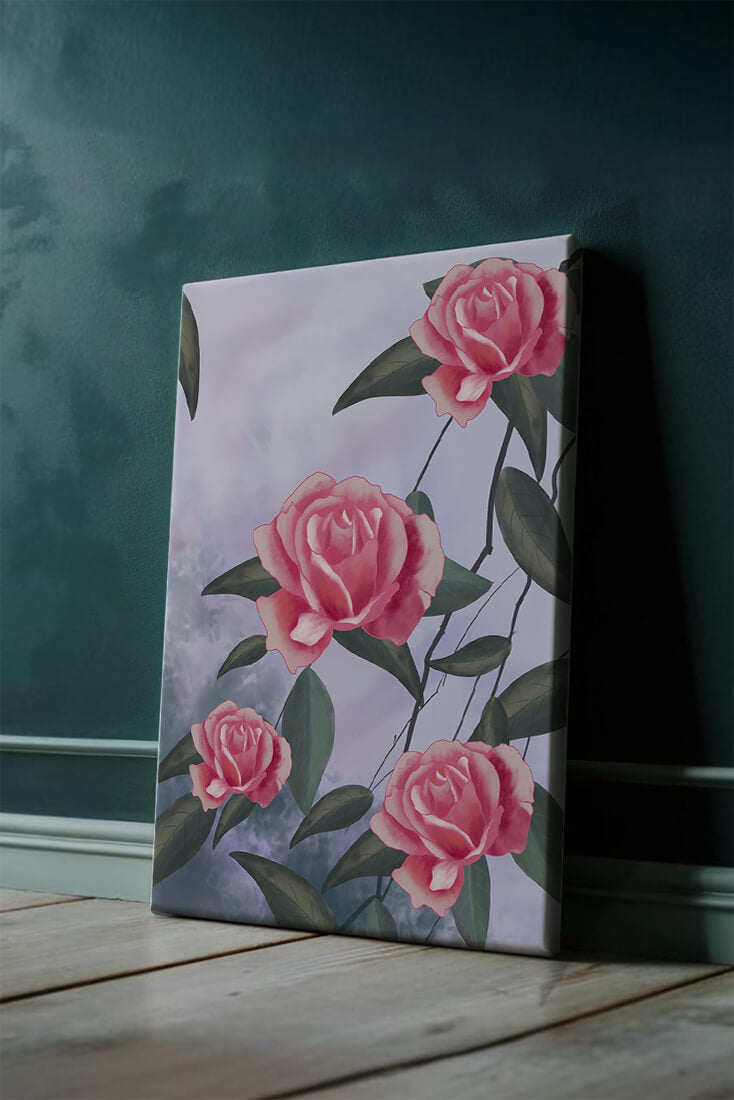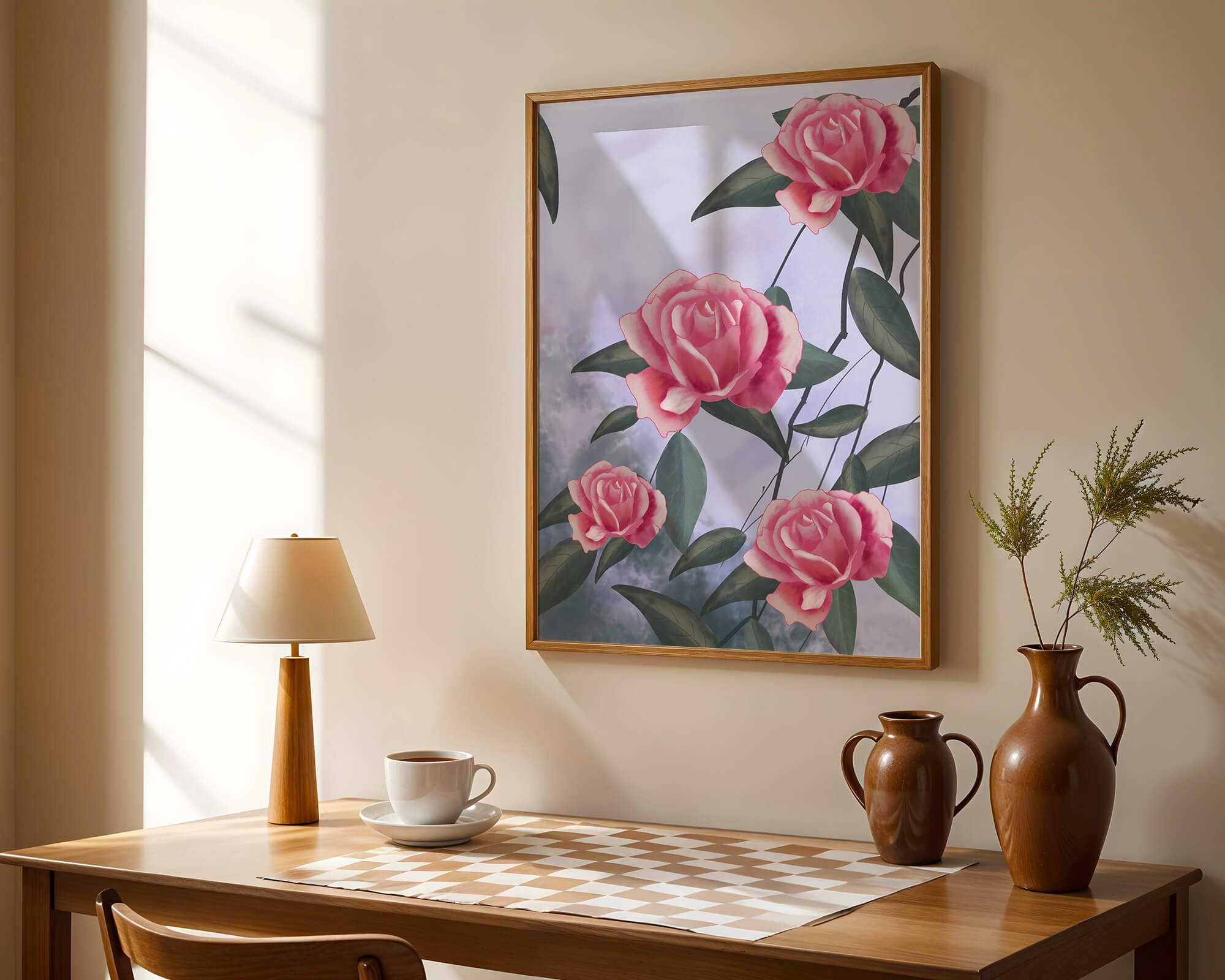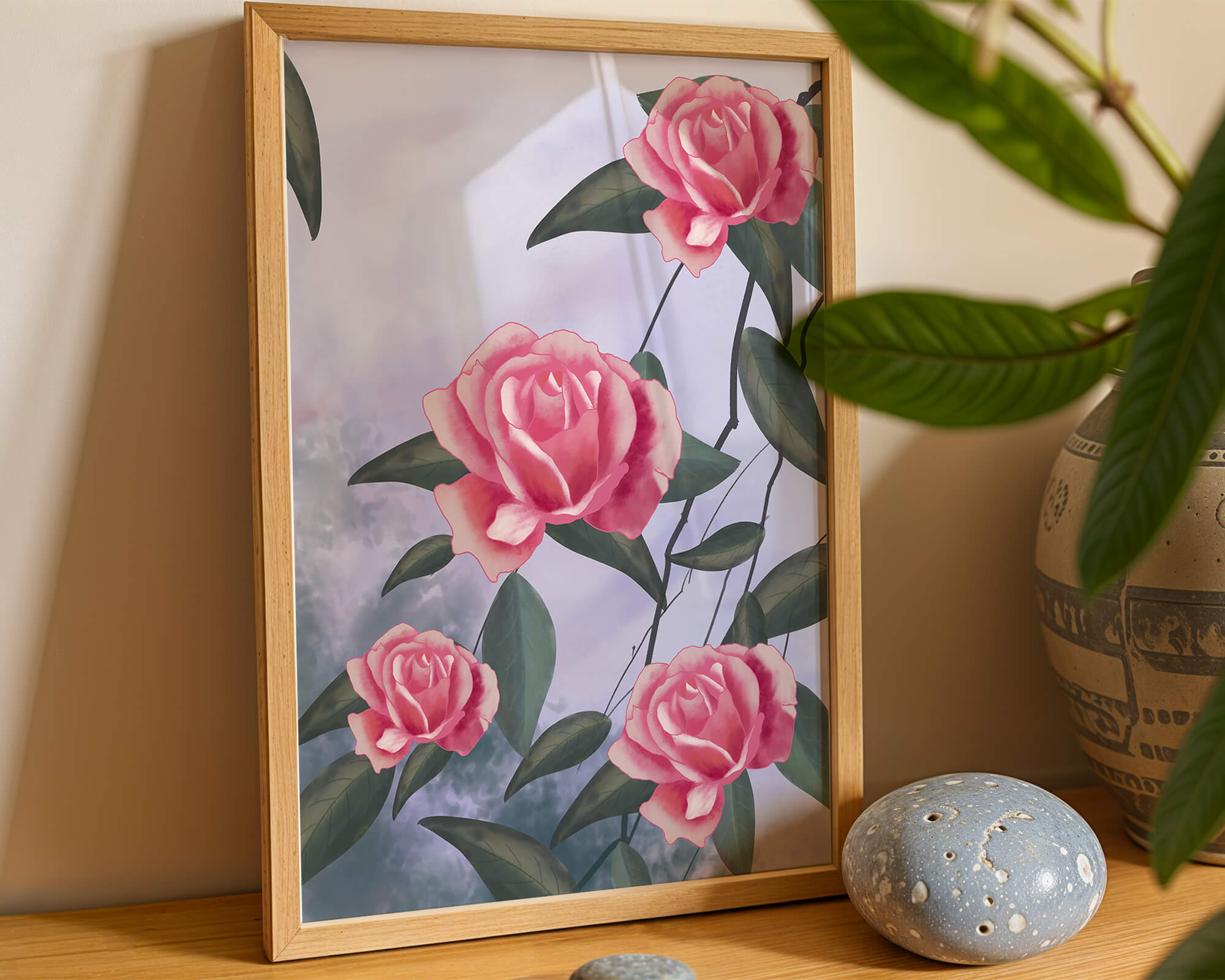 Dieses Kunstwerk zeigt drei exquisite rosa Rosen in voller Blüte, begleitet von ihren grünen Blättern. Jede Rose ist präzise dargestellt, wobei die zarten Blütenblätter und die subtilen Variationen ihrer Pastelltönen hervorgehoben werden. Der weiche Hintergrund sorgt für Kontrast und betont die natürliche Schönheit und die leuchtenden Farben der Flora. Die sanfte Verflechtung der Rosenstiele verleiht der Komposition einen Hauch von Eleganz und macht sie zur idealen Wahl für eine Vielzahl von Inneneinrichtungen. Ob gemütliches Schlafzimmer oder stilvolles Wohnzimmer – dieses anmutige Blumenarrangement wertet jeden Raum mit seinem zeitlosen Charme und seiner Ruhe auf.| Typ |