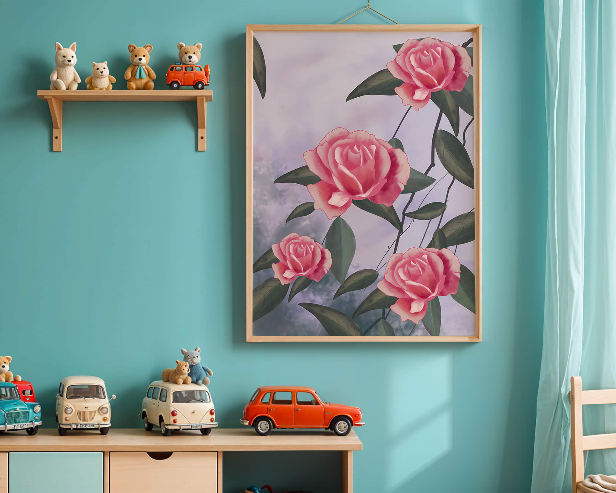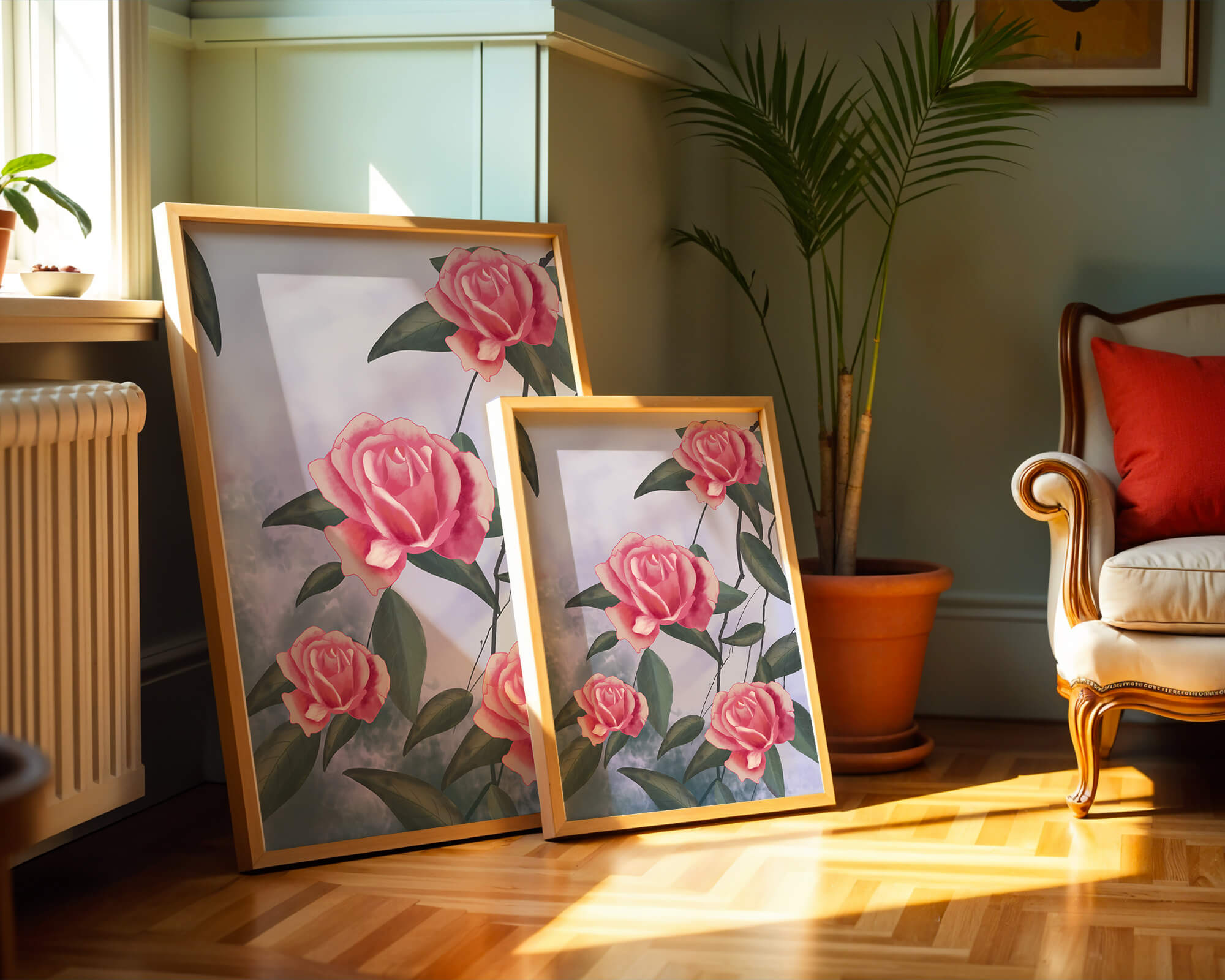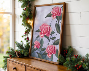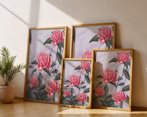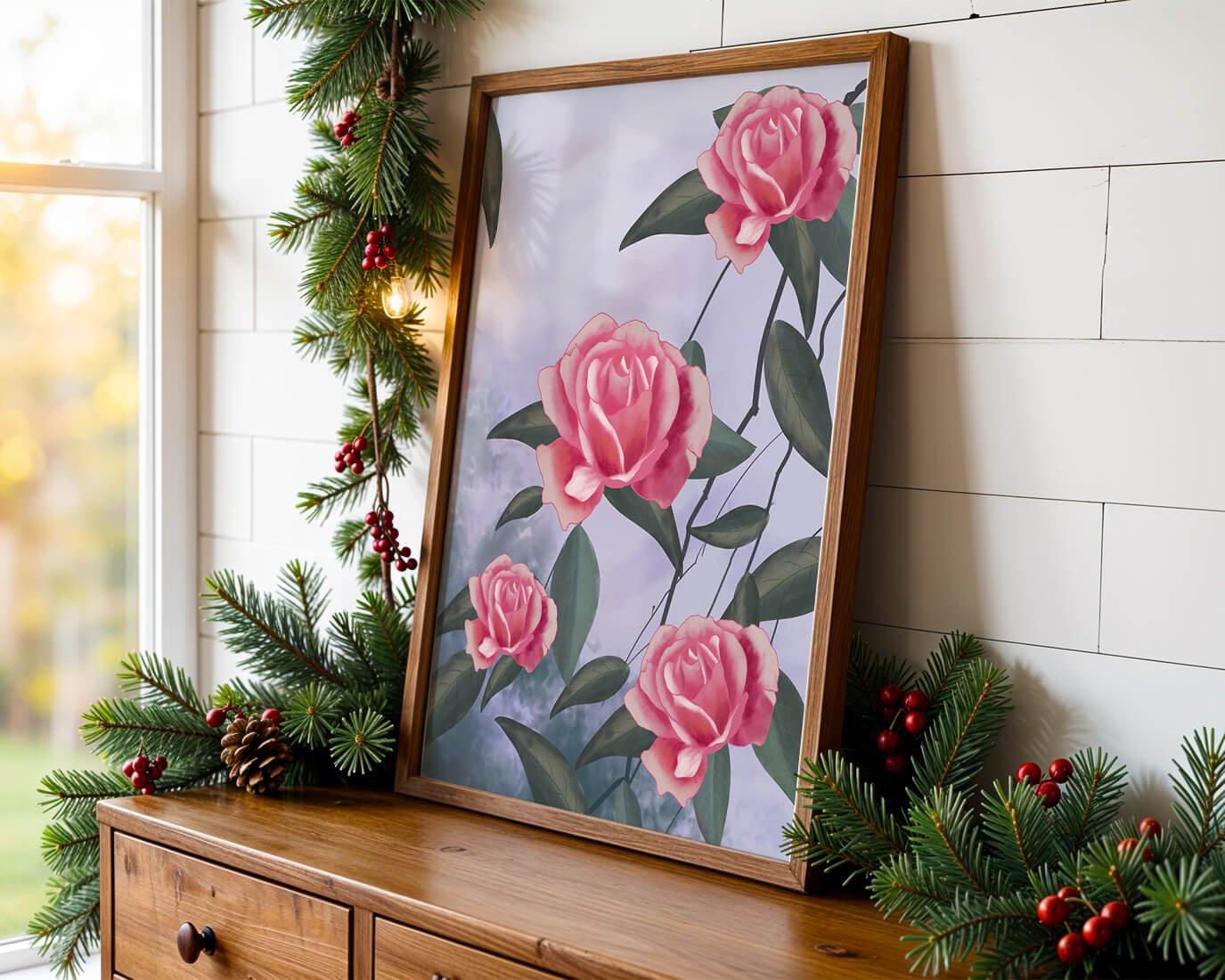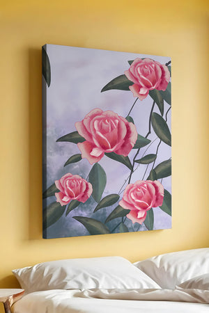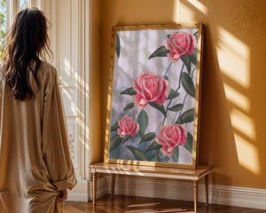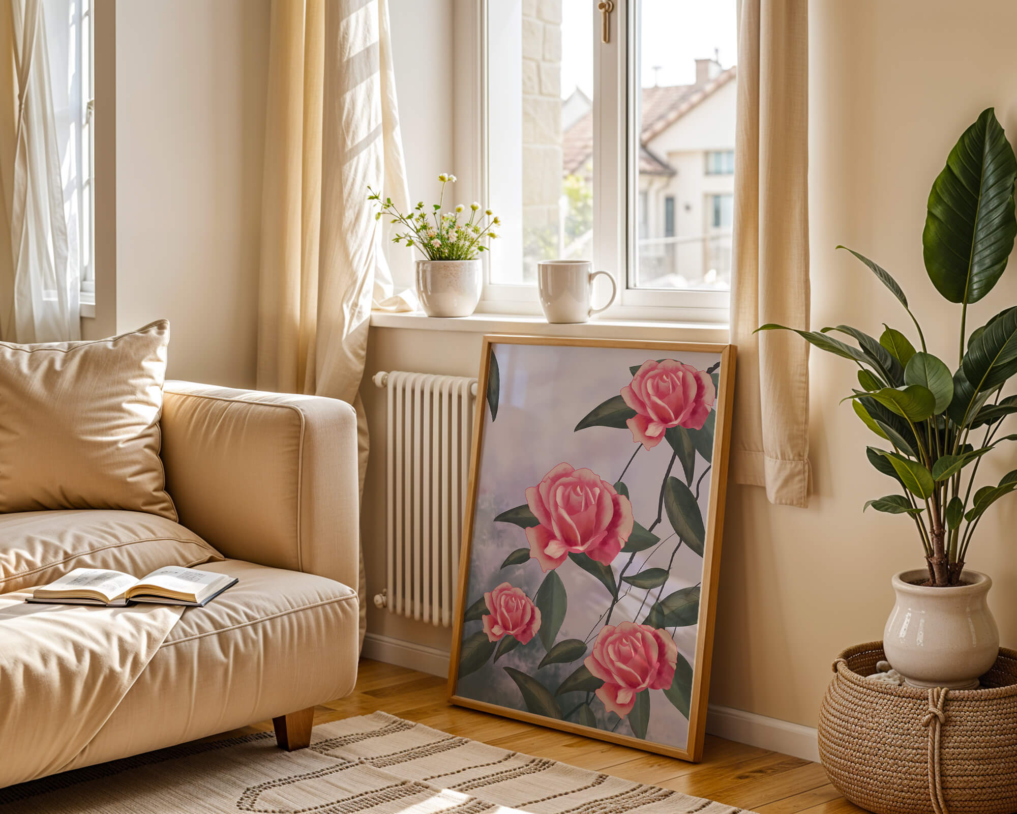 Dieses Kunstwerk zeigt drei exquisite rosa Rosen in voller Blüte, begleitet von ihren grünen Blättern. Jede Rose ist präzise dargestellt, wobei die zarten Blütenblätter und die subtilen Variationen ihrer Pastelltönen hervorgehoben werden. Der weiche Hintergrund sorgt für Kontrast und betont die natürliche Schönheit und die leuchtenden Farben der Flora. Die sanfte Verflechtung der Rosenstiele verleiht der Komposition einen Hauch von Eleganz und macht sie zur idealen Wahl für eine Vielzahl von Inneneinrichtungen. Ob gemütliches Schlafzimmer oder stilvolles Wohnzimmer – dieses anmutige Blumenarrangement wertet jeden Raum mit seinem zeitlosen Charme und seiner Ruhe auf.| Typ |