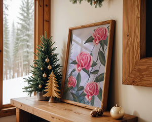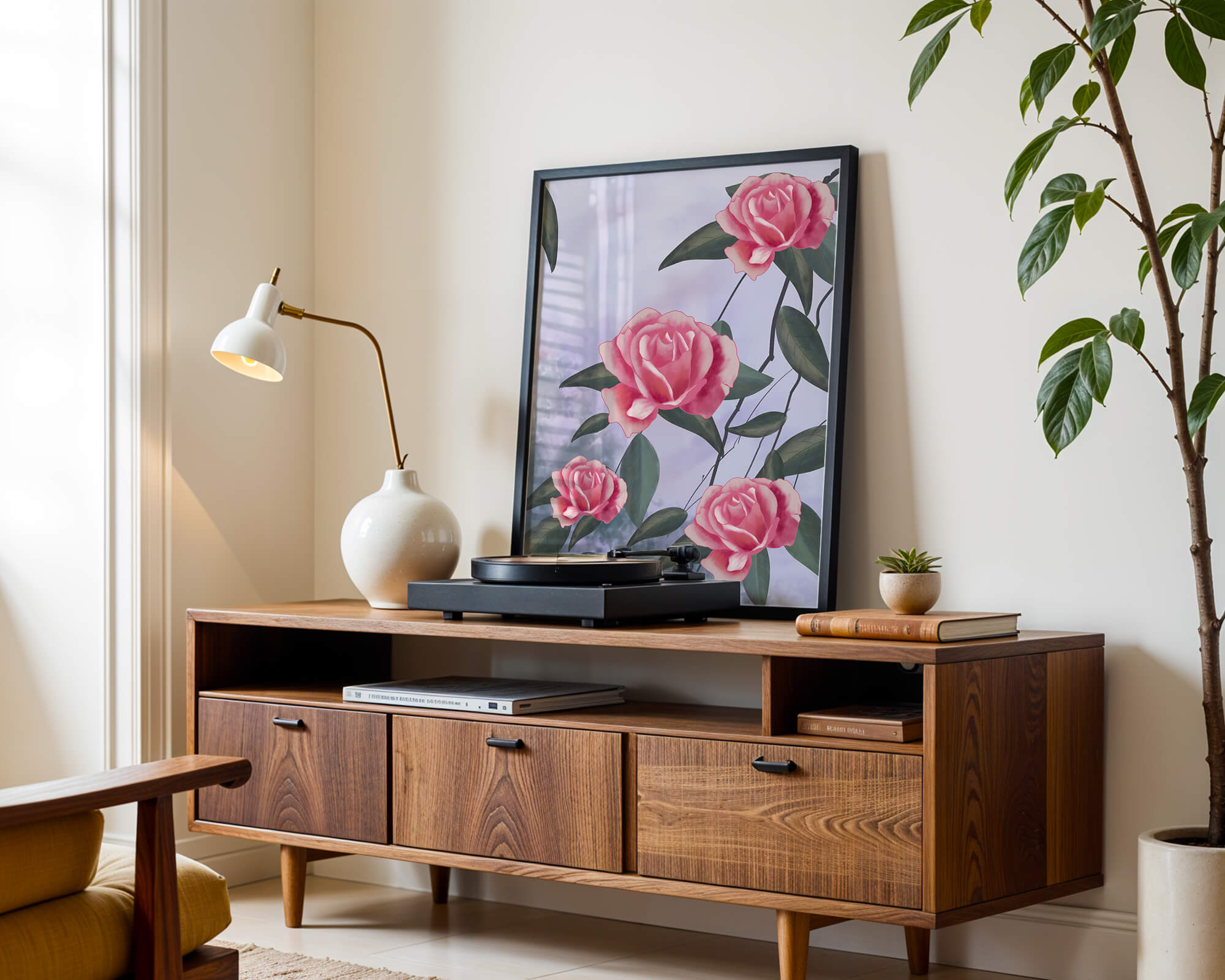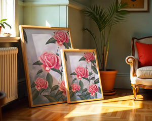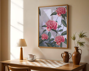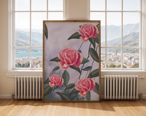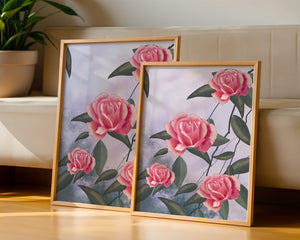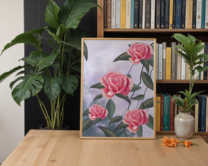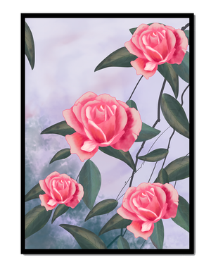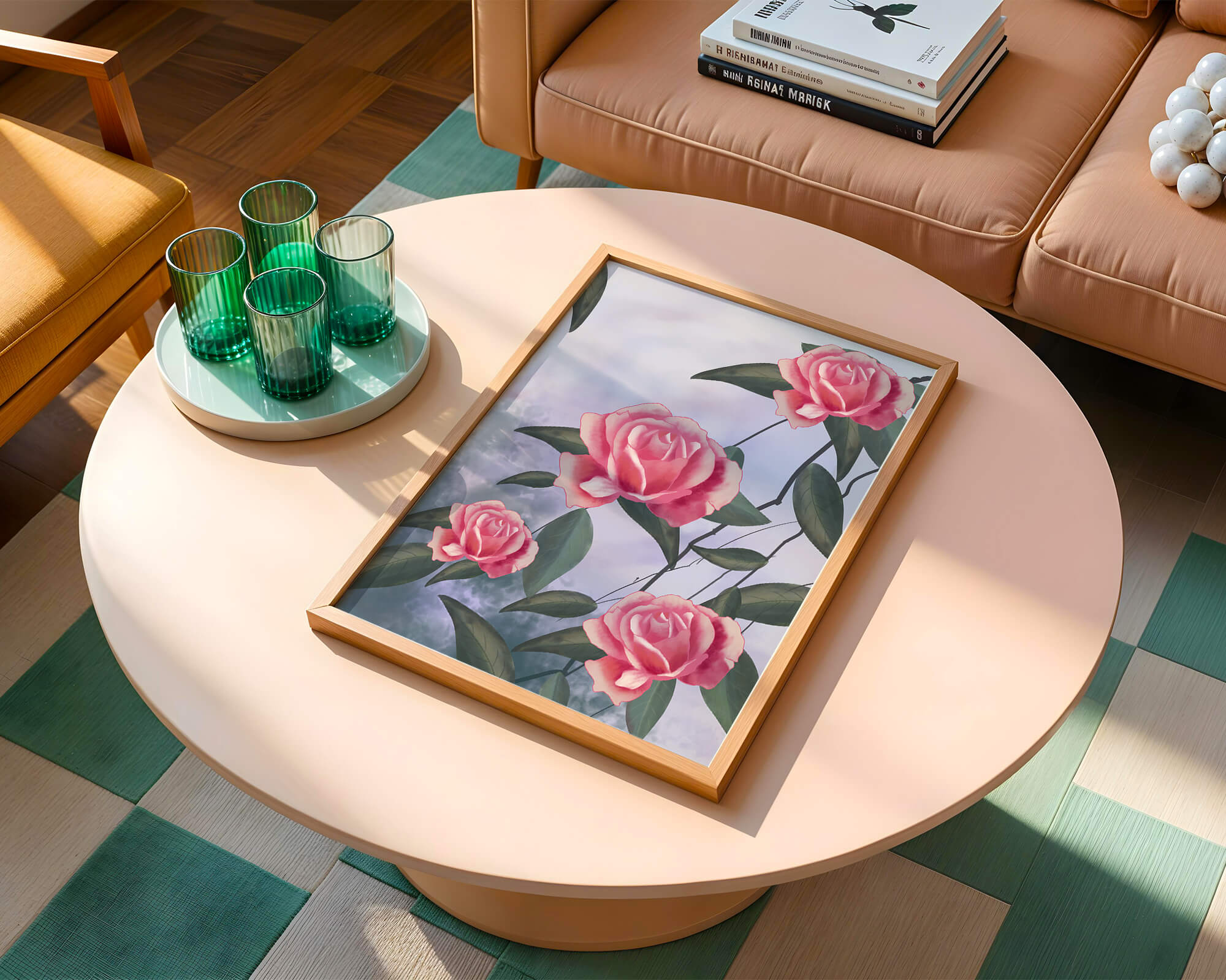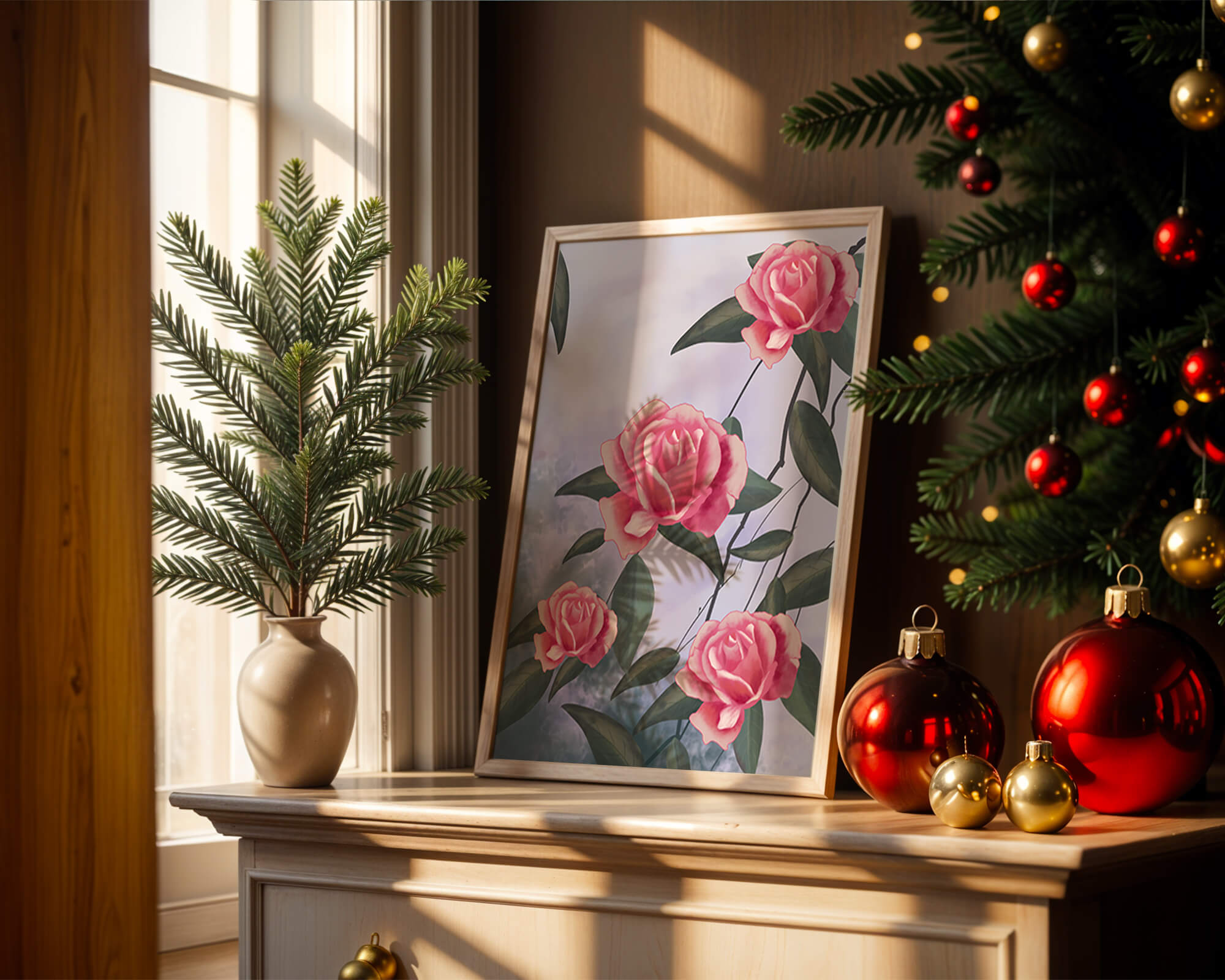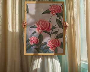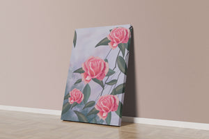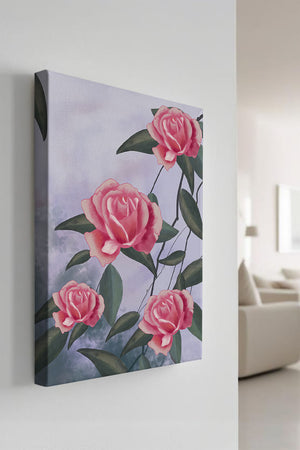 Dieses Kunstwerk zeigt drei exquisite rosa Rosen in voller Blüte, begleitet von ihren grünen Blättern. Jede Rose ist präzise dargestellt, wobei die zarten Blütenblätter und die subtilen Variationen ihrer Pastelltönen hervorgehoben werden. Der weiche Hintergrund sorgt für Kontrast und betont die natürliche Schönheit und die leuchtenden Farben der Flora. Die sanfte Verflechtung der Rosenstiele verleiht der Komposition einen Hauch von Eleganz und macht sie zur idealen Wahl für eine Vielzahl von Inneneinrichtungen. Ob gemütliches Schlafzimmer oder stilvolles Wohnzimmer – dieses anmutige Blumenarrangement wertet jeden Raum mit seinem zeitlosen Charme und seiner Ruhe auf.| Typ |