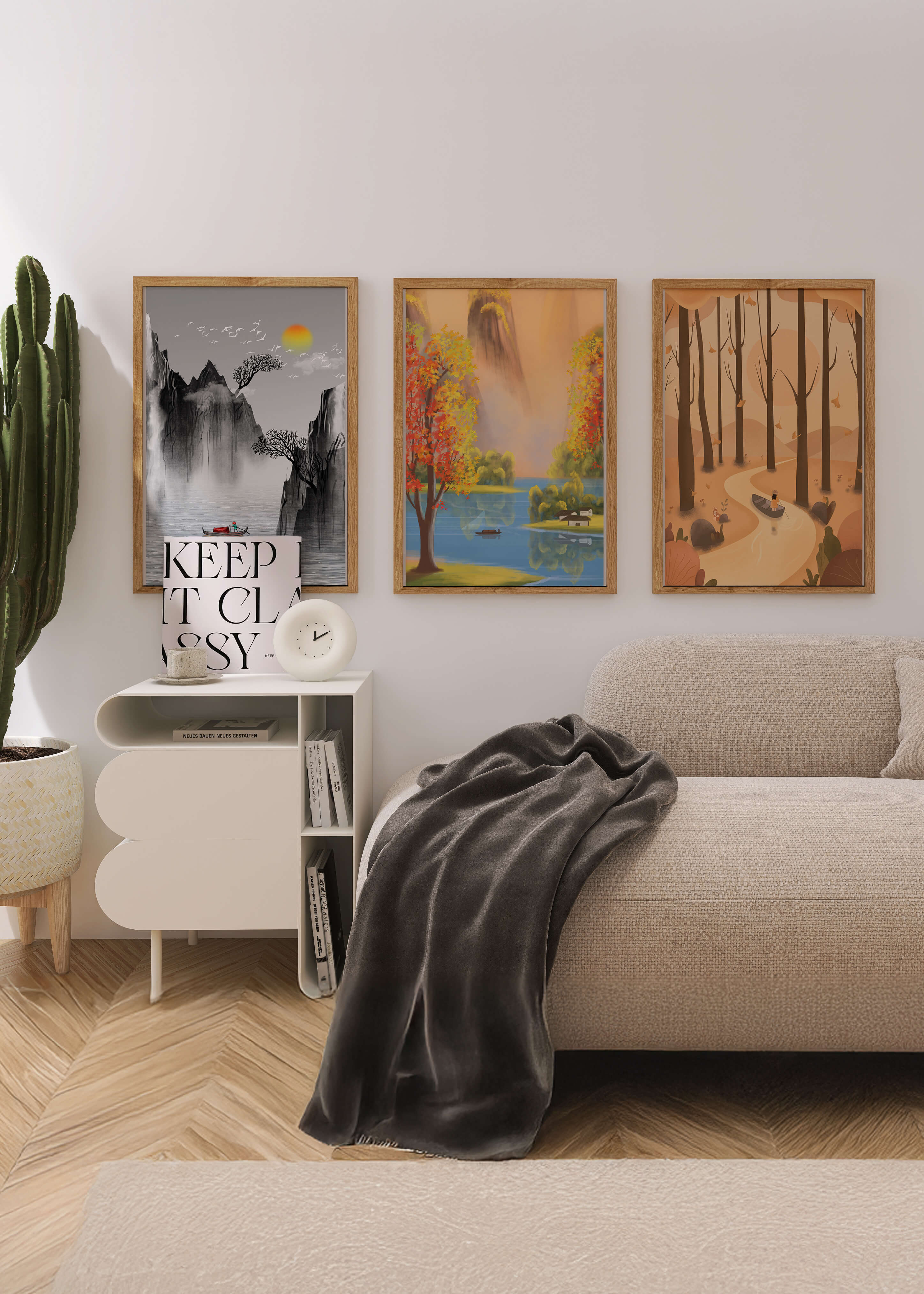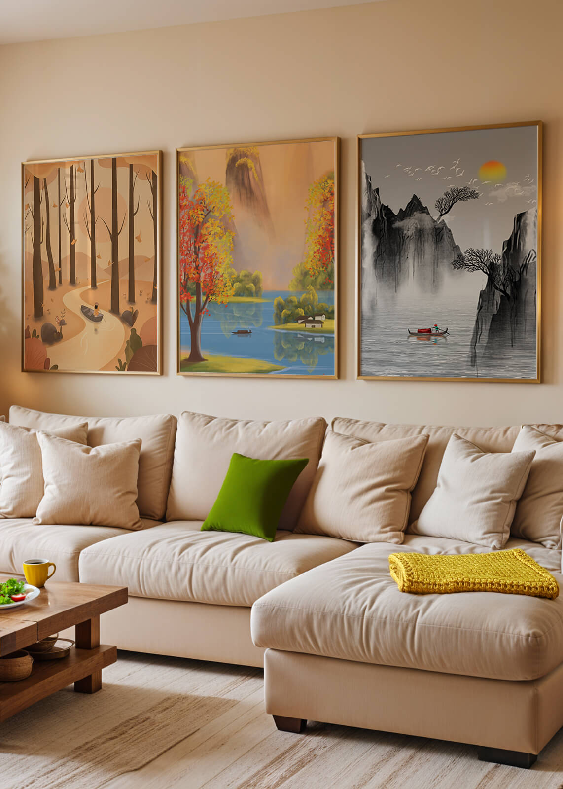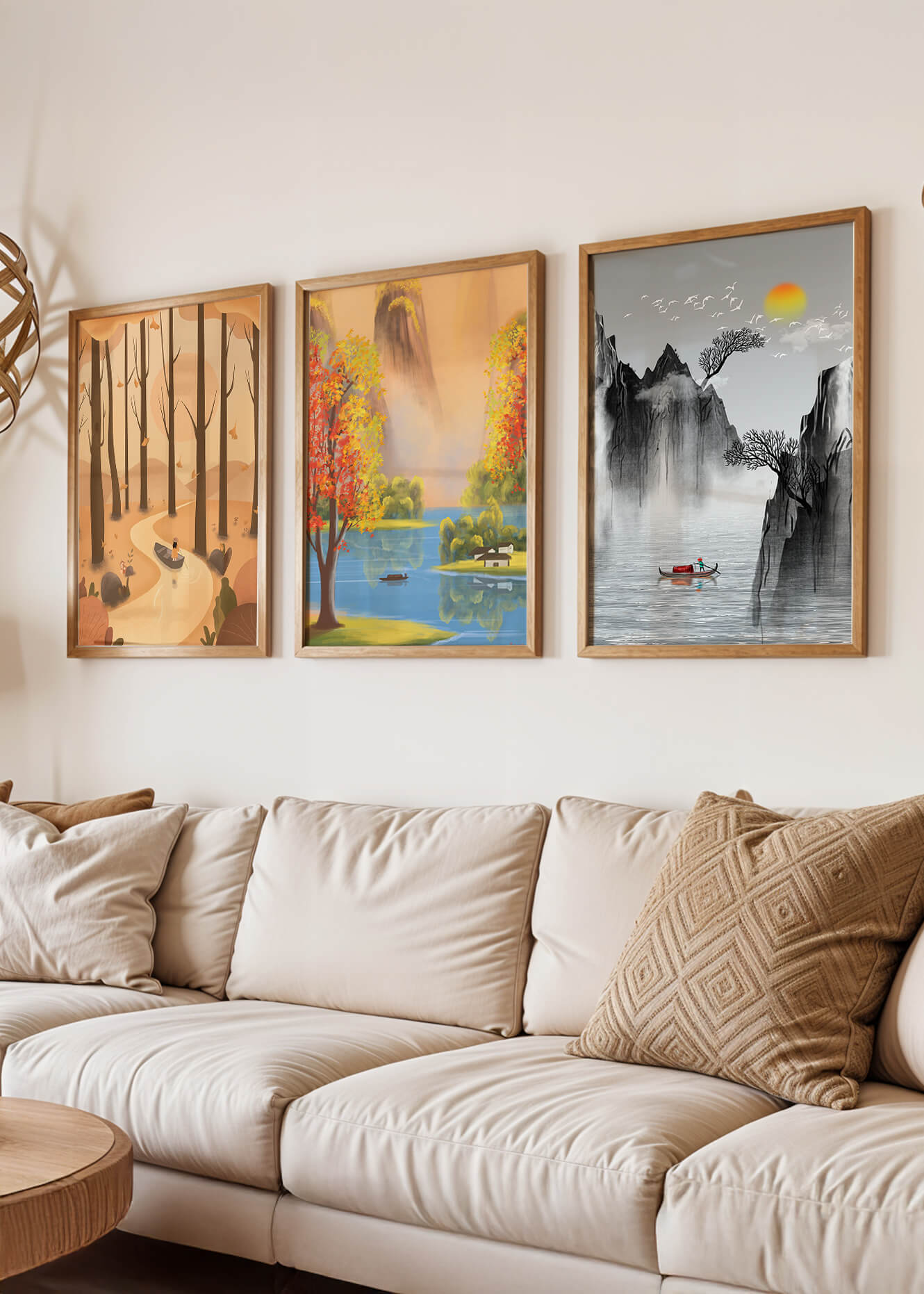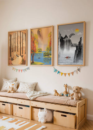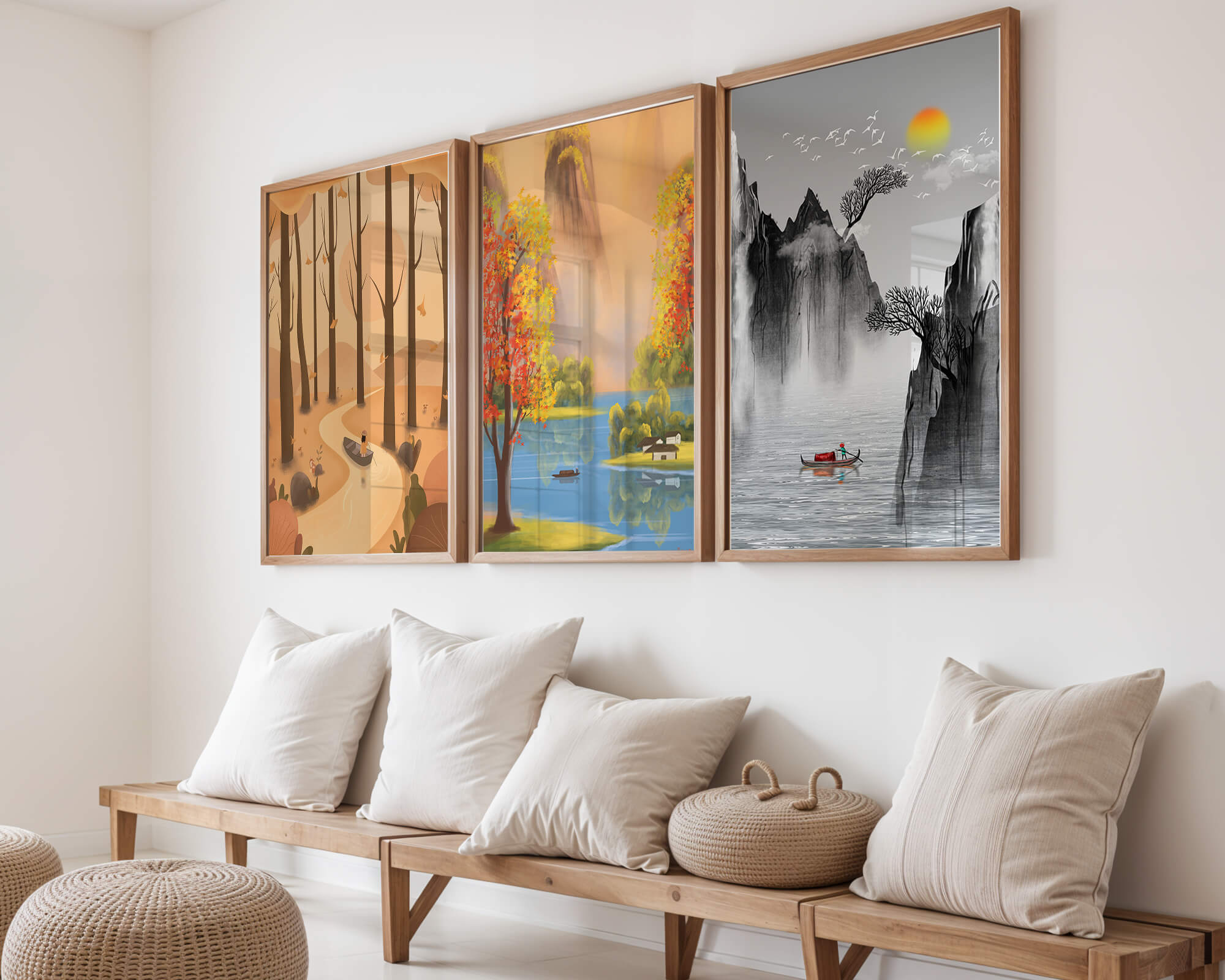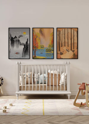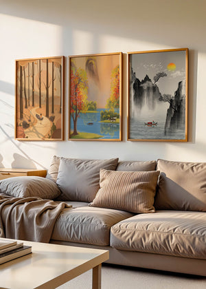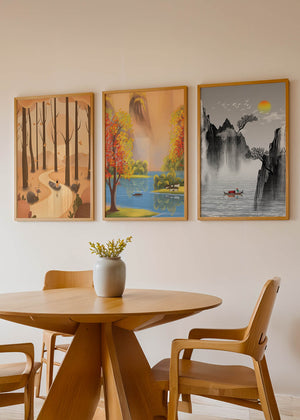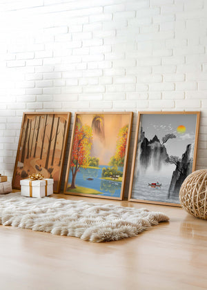 El primer cuadro muestra un sendero en un bosque otoñal, con hojas cayendo suavemente de los árboles altos. La imagen central retrata un paisaje brillante con un lago sereno, rodeado de árboles coloridos y una cascada en el fondo. El tercer cuadro representa un paisaje asiático en tonos monocromáticos, con montañas escarpadas, un río tranquilo y una pequeña barca con un pescador, destacando la sutileza del arte oriental. Estas impresiones de alta calidad son ideales para agregar un toque de naturaleza y serenidad a cualquier espacio en el hogar, como la sala de estar o el estudio. Su estilo sin marco permite integrarlas fácilmente a la decoración existente.| Type |