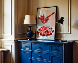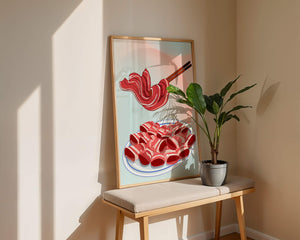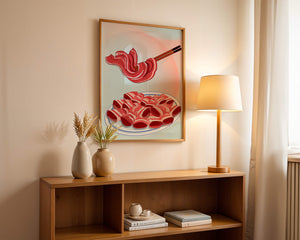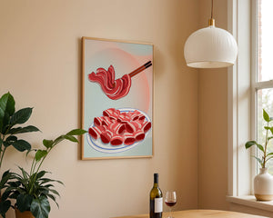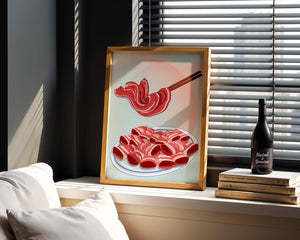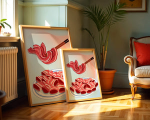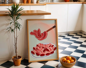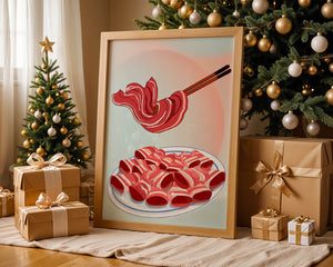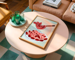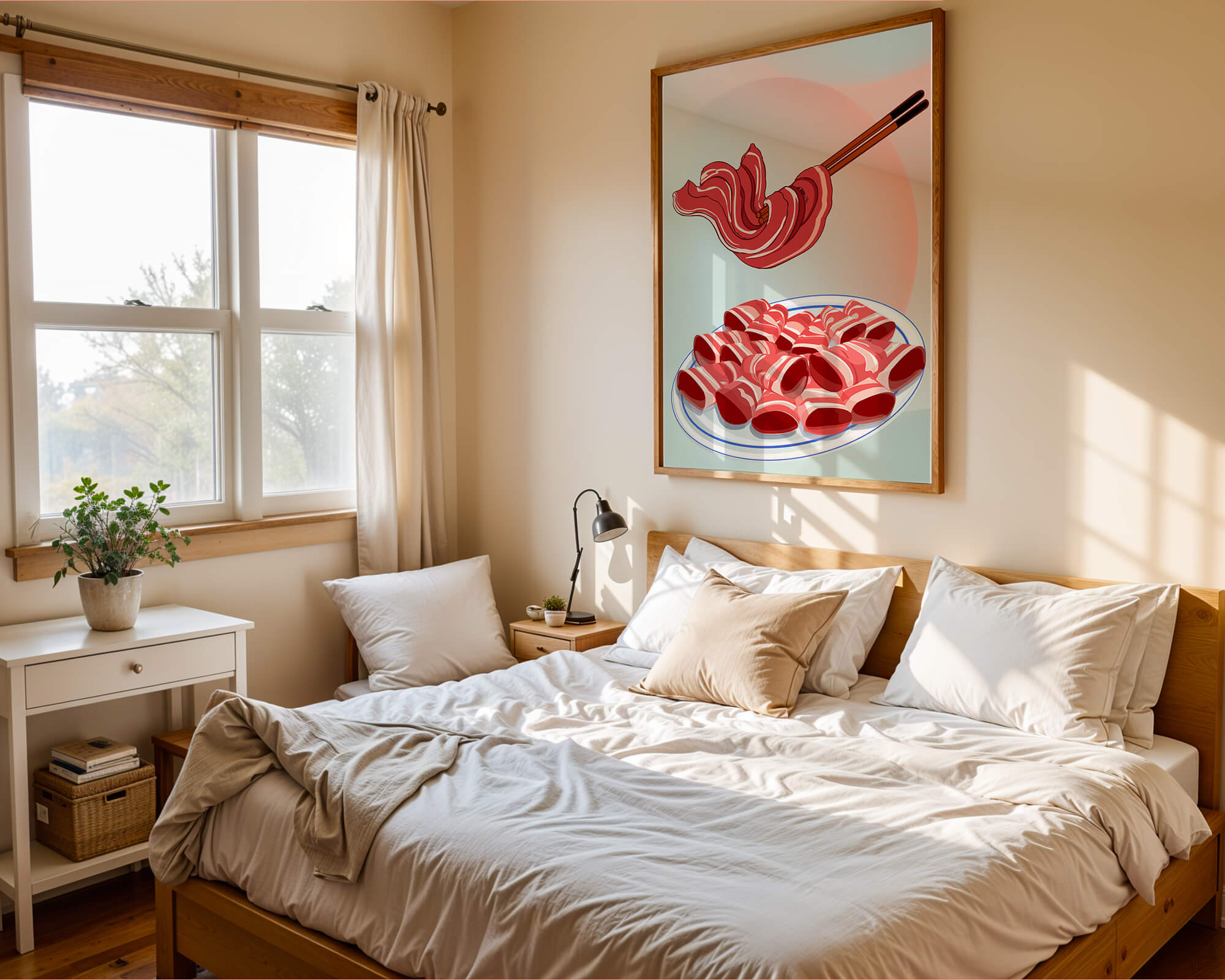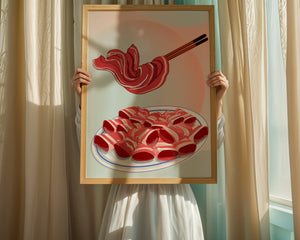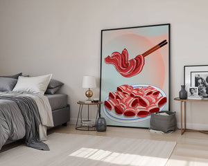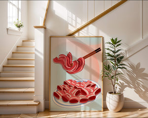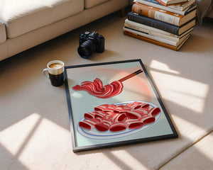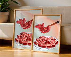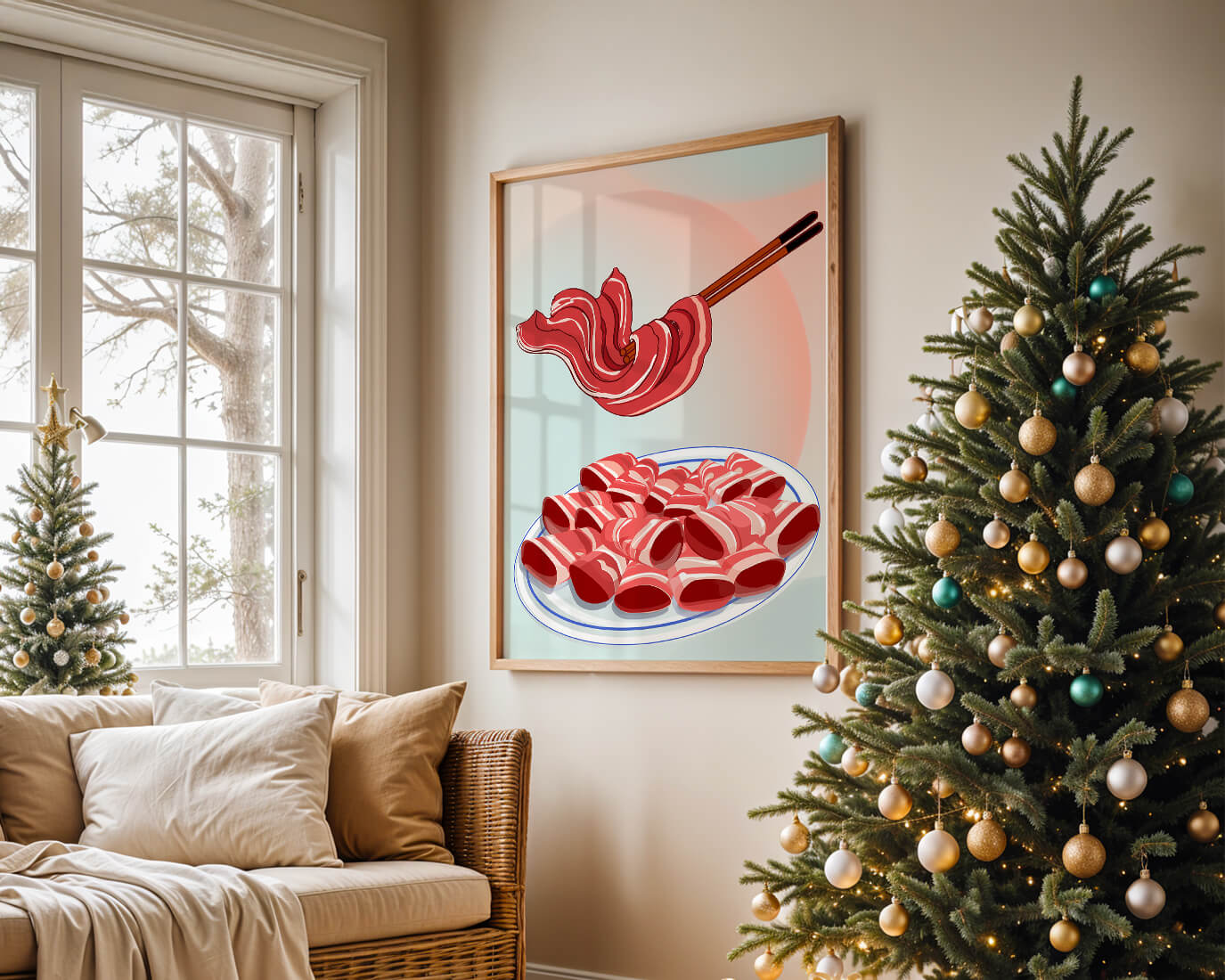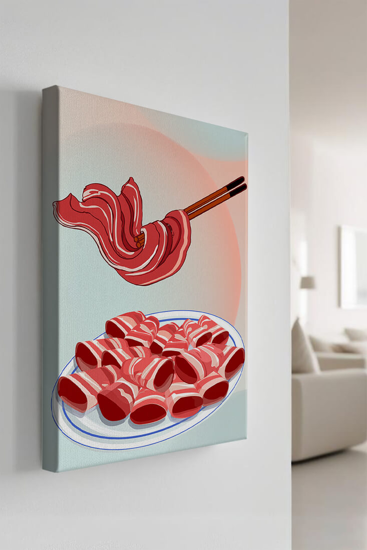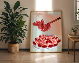 Das Bild fängt die Essenz der Kochkunst durch die lebendige Darstellung von rohem Fleisch ein. Die Scheiben sind sorgfältig auf einem weißen Teller mit blauem Rand angerichtet, wodurch ihre marmorierte Textur und die satte rote Farbe hervorgehoben werden. Die Szene suggeriert einen Moment der Zubereitung, in dem jede Scheibe darauf wartet, in ein Gourmetgericht verwandelt zu werden. Die Stäbchen, die eine einzelne Scheibe in die Luft halten, verleihen dem Bild Tiefe und Bewegung und schaffen so einen Blickfang, der den Blick des Betrachters auf sich zieht. Diese künstlerische Darstellung betont nicht nur die Qualität des Fleisches, sondern auch die kulturellen Aspekte seiner Zubereitung und seines Genusses. Das Bild ist perfekt für alle, die sich für Küche und kulinarische Präsentationen interessieren – ein schönes und appetitanregendes Bild.| Typ |