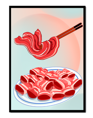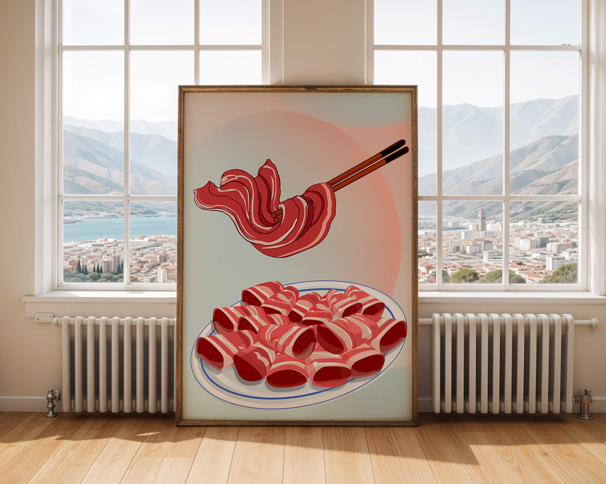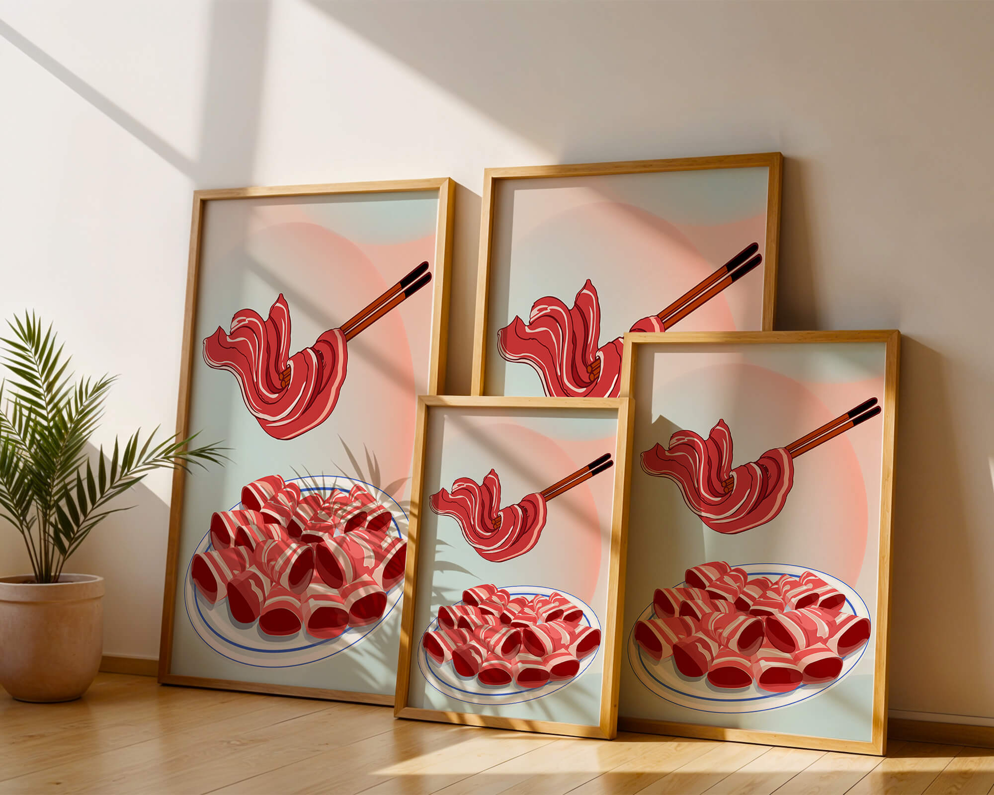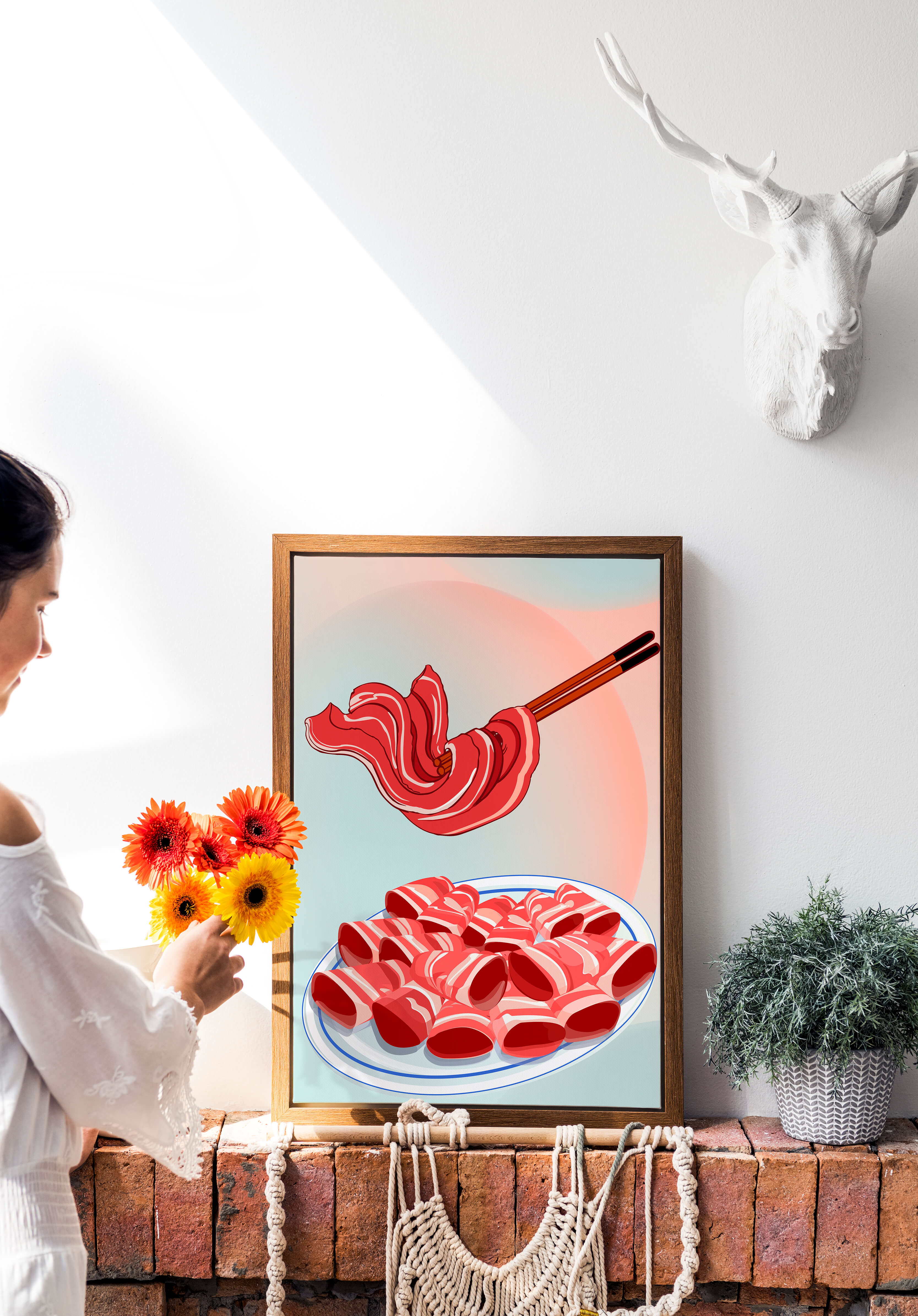 Diese lebendige Illustration zeigt einen Teller voller frischer, roher Fleischscheiben, kunstvoll angerichtet und bereit für die kulinarische Zubereitung. Über dem Teller hält ein Paar Essstäbchen elegant eine Scheibe und verleiht der Komposition eine dynamische Note.