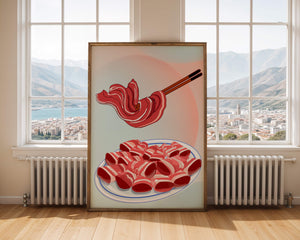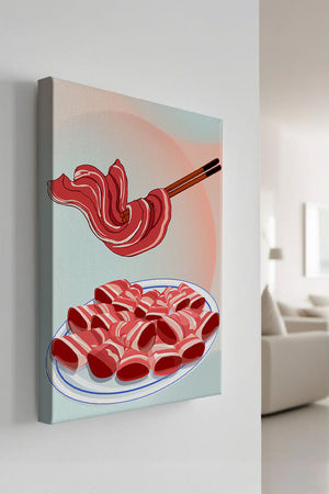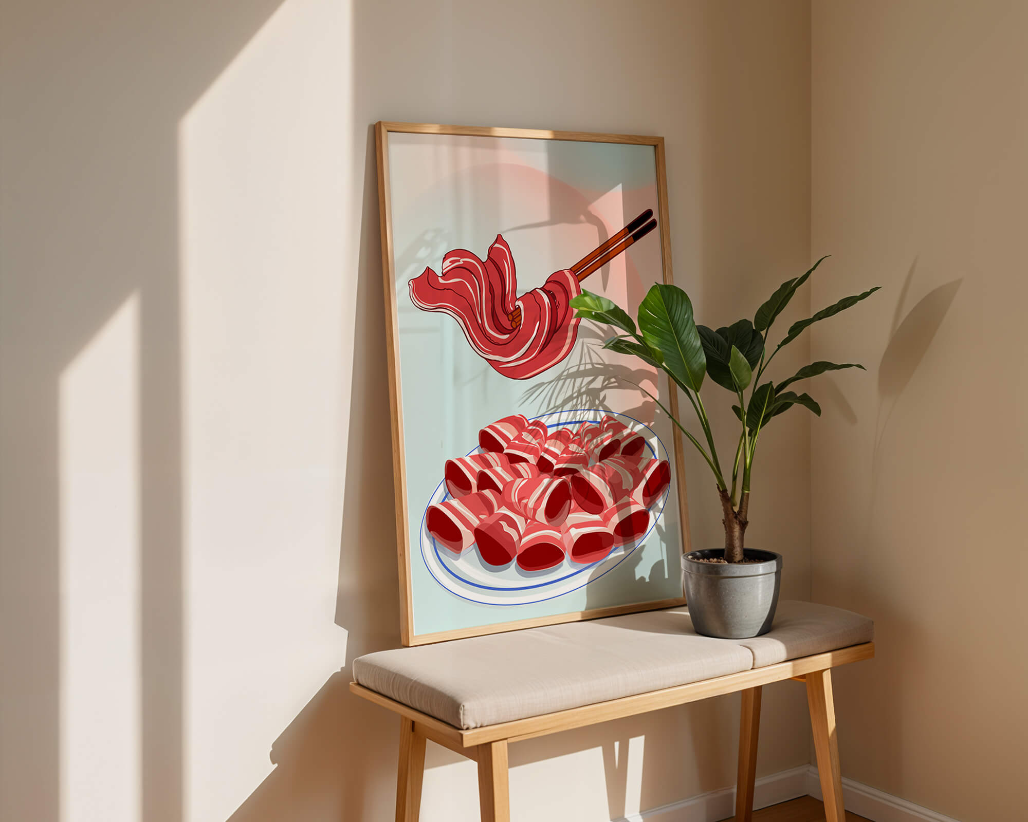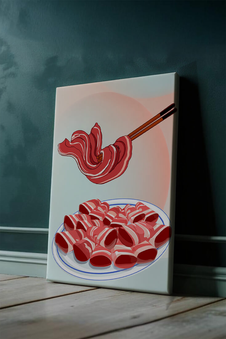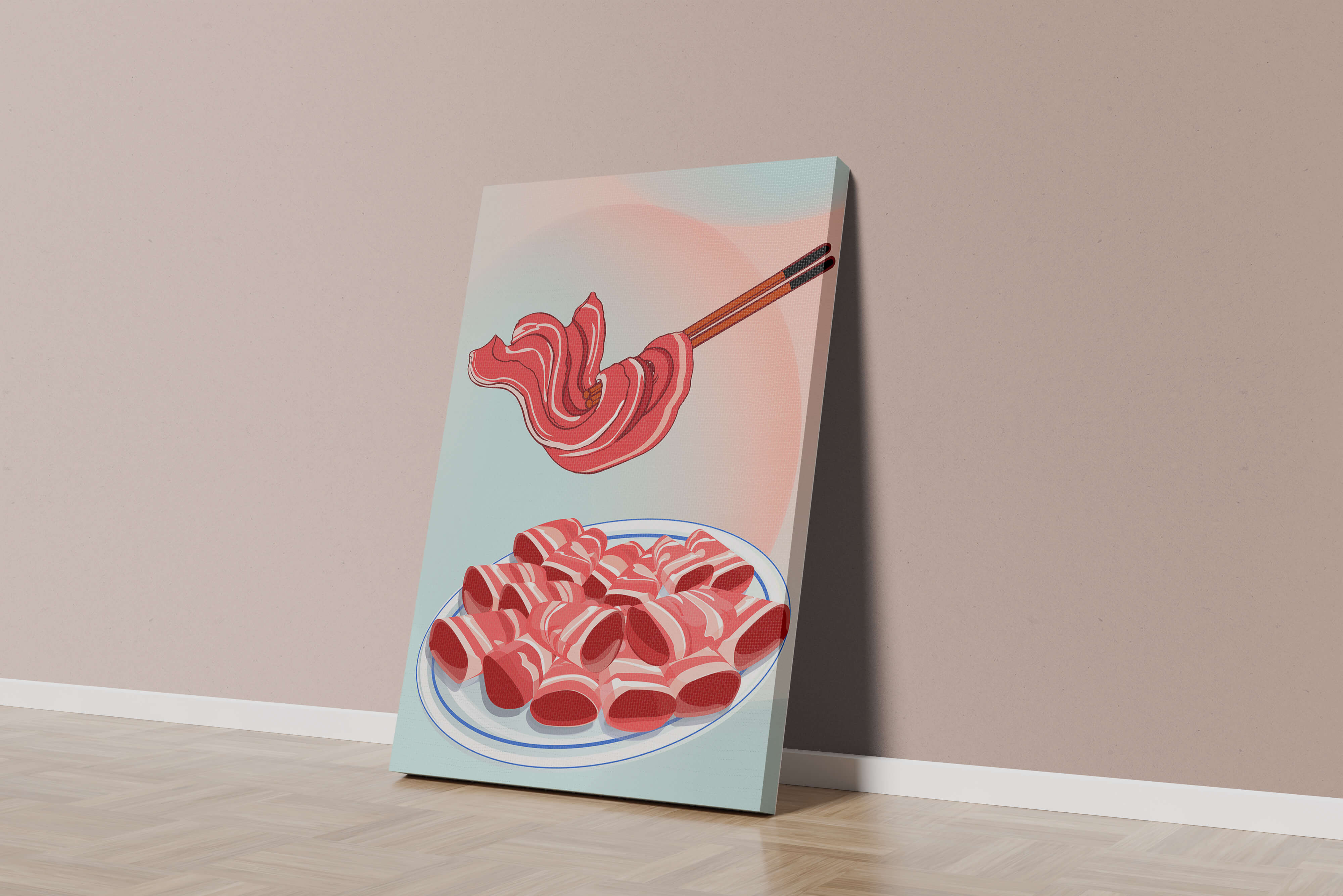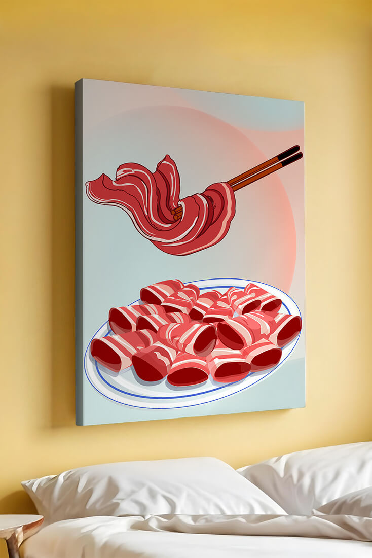 Diese lebendige Illustration zeigt einen Teller voller frischer, roher Fleischscheiben, kunstvoll angerichtet und bereit für die kulinarische Zubereitung. Über dem Teller hält ein Paar Essstäbchen elegant eine Scheibe und verleiht der Komposition eine dynamische Note.