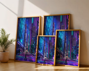 Das Bild zeigt eine lebendige und futuristische Stadtstraße, die unter einem regnerischen Nachthimmel von Neonlichtern erleuchtet wird. Wolkenkratzer ragen empor und erzeugen mit ihrer Mischung aus Blau- und Lilatönen eine faszinierende Atmosphäre.