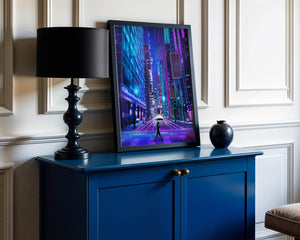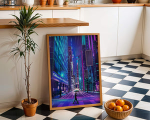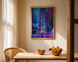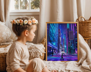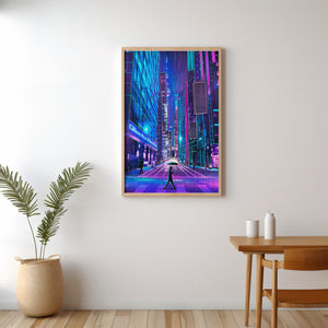 In dieser Szene überquert eine einsame Gestalt mit einem Regenschirm einen Zebrastreifen und verkörpert damit einen Moment stillen Kontrasts zu den geschäftigen Lichtern der Stadt. Die umliegenden Wolkenkratzer reflektieren eine Palette von Neonfarben und vermitteln ein Gefühl von Modernität und digitalem Reiz. Sanft herabprasselnder Regen lässt die Reflexionen auf dem Bürgersteig tanzen und verstärkt die urbane Mystik. Die digitale Kunst betont das Zusammenspiel von Licht und Schatten und verwandelt die Stadtlandschaft in eine futuristische Vision. Die dynamischen Winkel der Gebäude und das atmosphärische Leuchten schaffen ein immersives Erlebnis und verleiten den Betrachter, die Tiefen dieser modernen Metropole zu erkunden.| Typ |