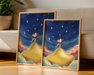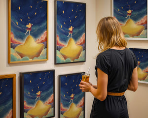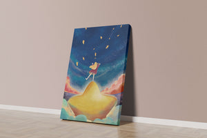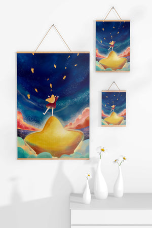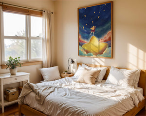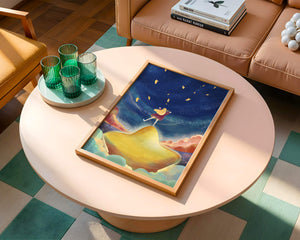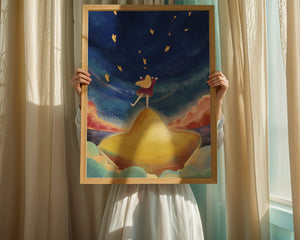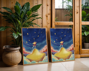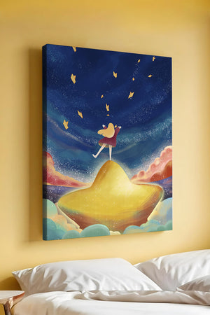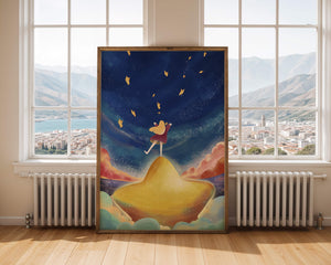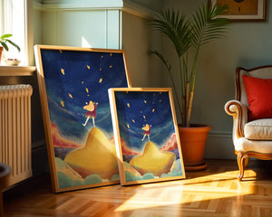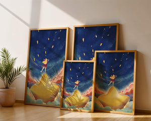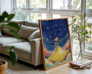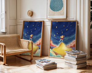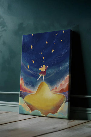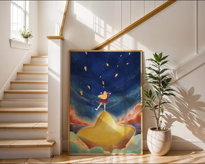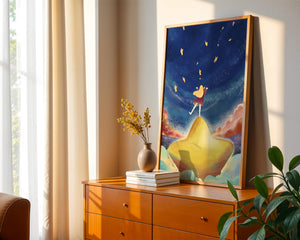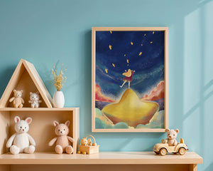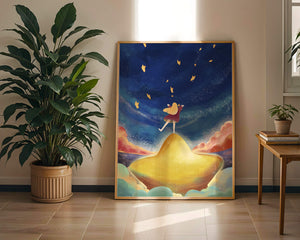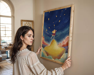 In diesem bezaubernden Kunstwerk erstreckt sich der Nachthimmel endlos, gesprenkelt mit funkelnden Sternen, die über die Leinwand tanzen. Das Mädchen mit ihren langen blonden Haaren steht auf einem schimmernden Hügel, der selbst fast wie ein Stern wirkt und einen sanften, goldenen Schein ausstrahlt. Um sie herum tragen flauschige Wolken in Pastellfarben zur verträumten Atmosphäre dieser himmlischen Szene bei. Die Verwendung lebendiger Farben und magischer Elemente weckt ein Gefühl von Abenteuer und Neugier. Der heitere Gesichtsausdruck des Mädchens suggeriert eine Verbindung zum Kosmos, voller Möglichkeiten und Träume, die darauf warten, erkundet zu werden. Dieses Kunstwerk eignet sich perfekt, um die Fantasie im Kinderzimmer anzuregen oder jedem Raum einen Hauch von Verspieltheit zu verleihen.| Typ |