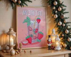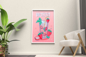 Illustration eines Erdbeer-Mojito mit leuchtend rosa Hintergrund und verspieltem Design