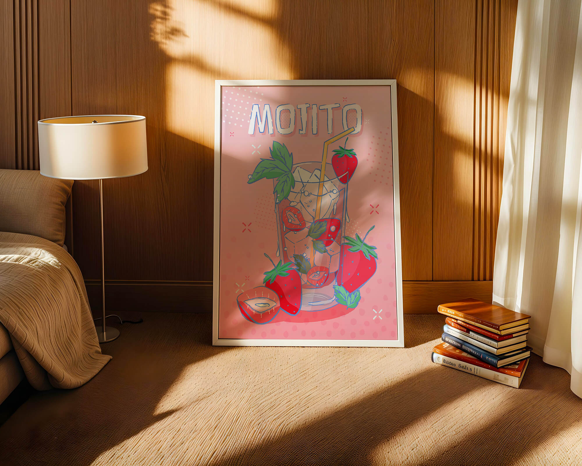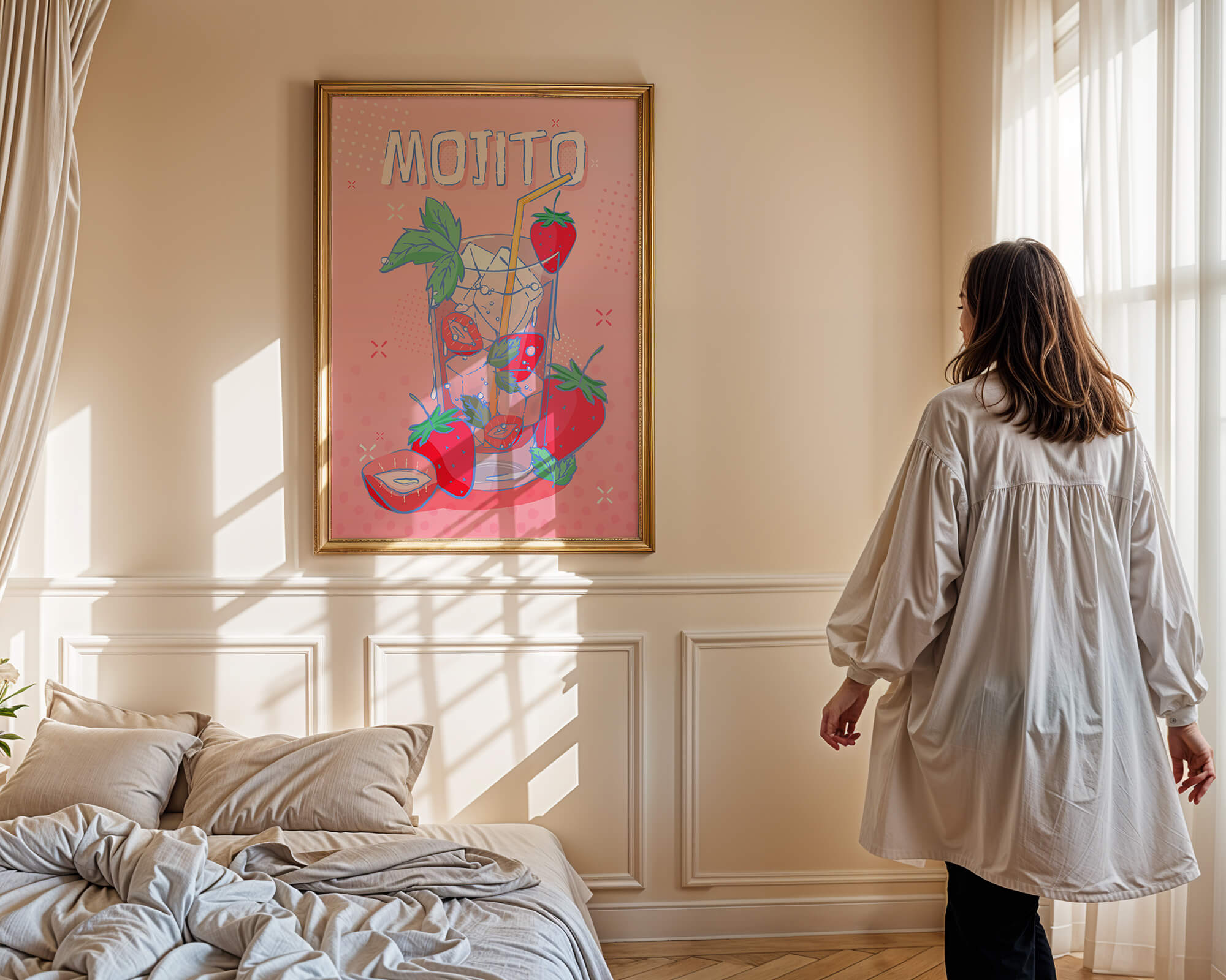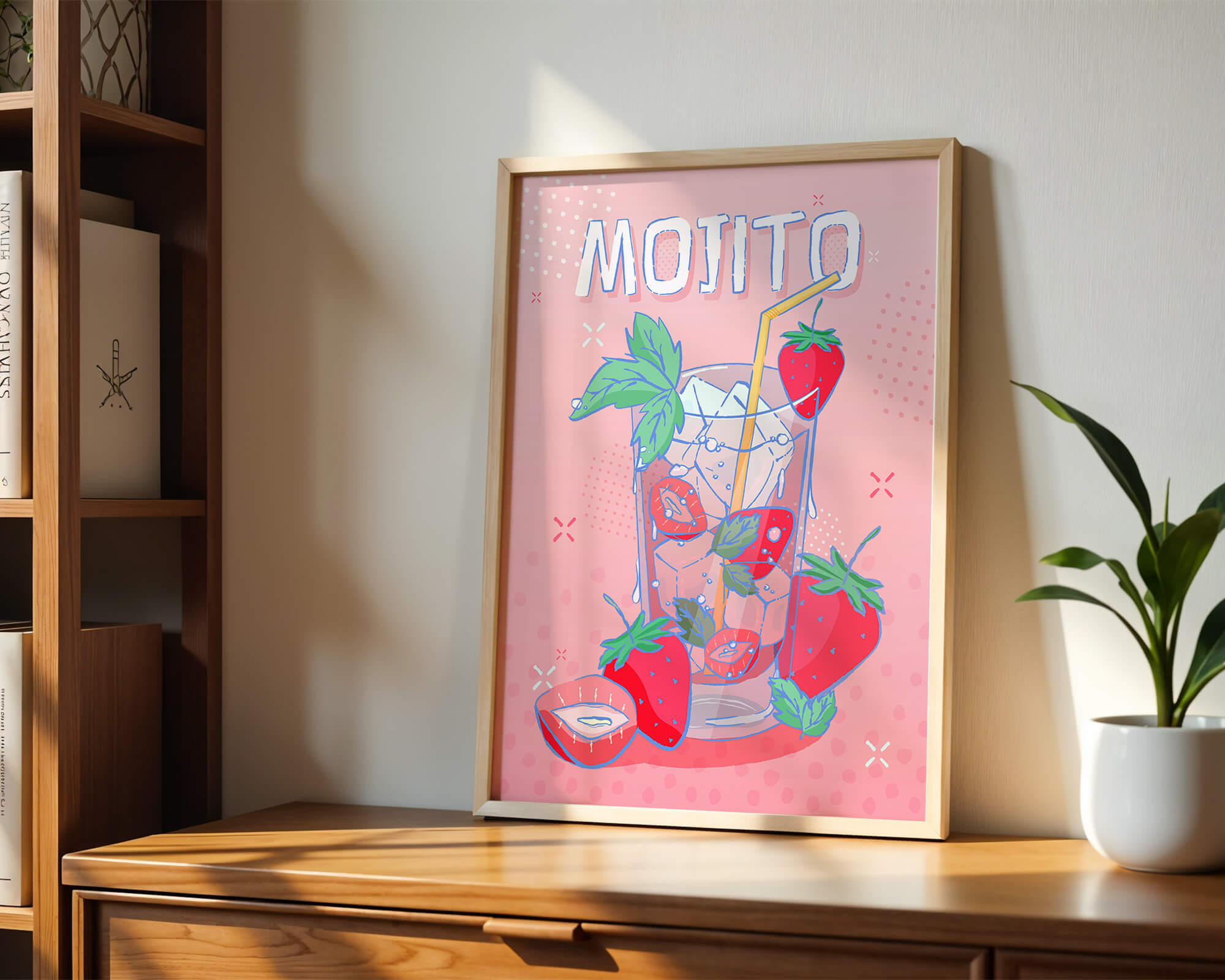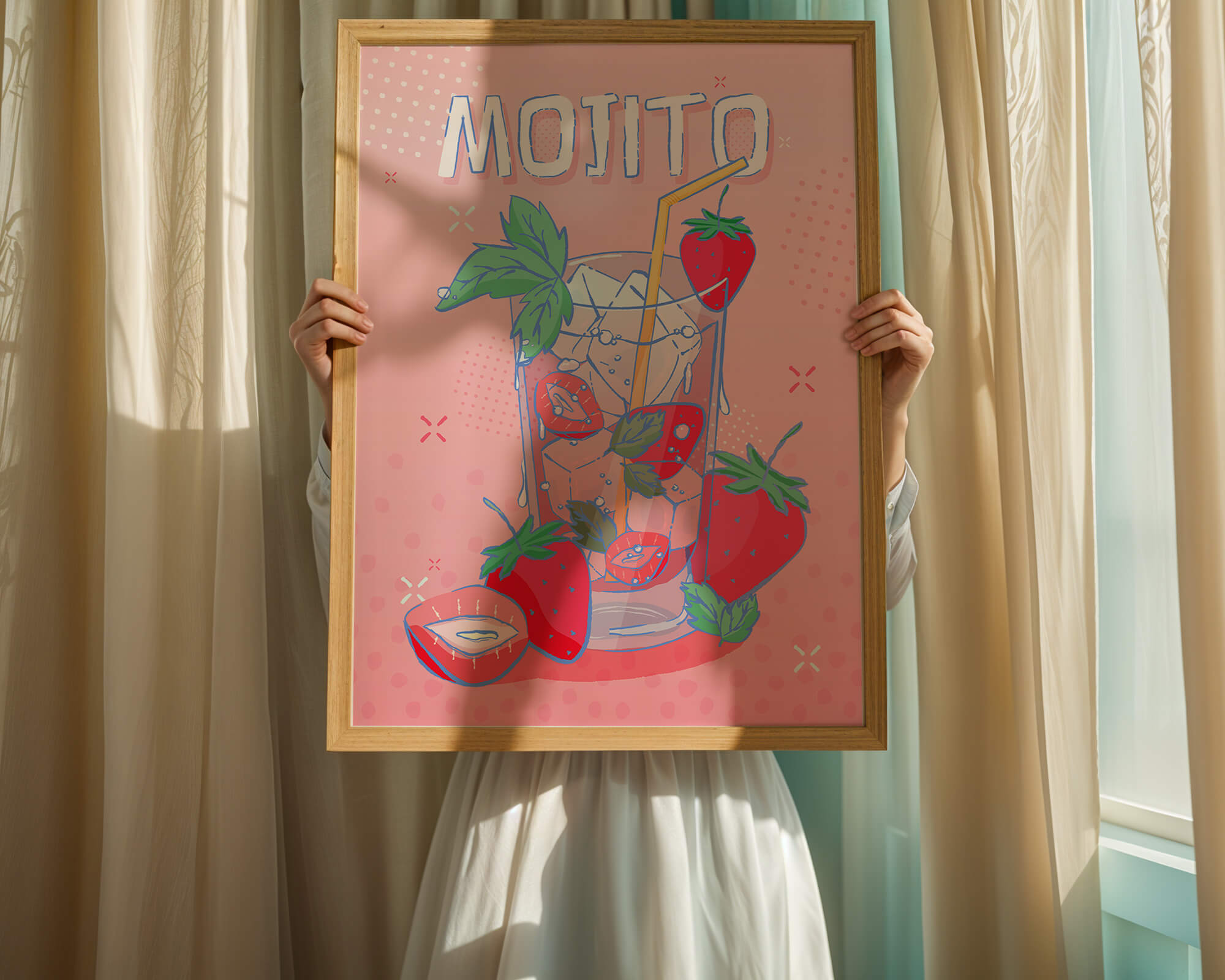Diese leuchtende und lebendige Illustration fängt mit der Darstellung eines erfrischenden Erdbeer-Mojitos die Essenz des Sommers ein. Vor einem leuchtend rosa Hintergrund wirkt das Bild verspielt und einladend – perfekt für alle, die sowohl Stil als auch subtile Eleganz lieben.