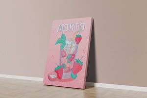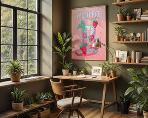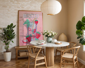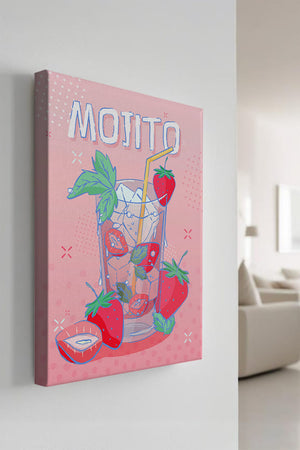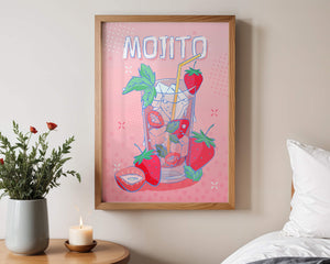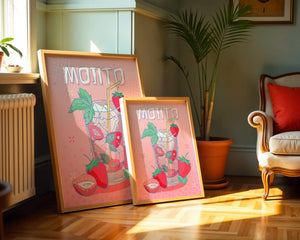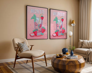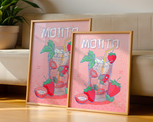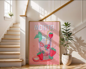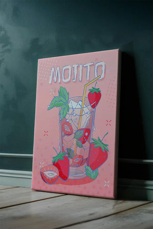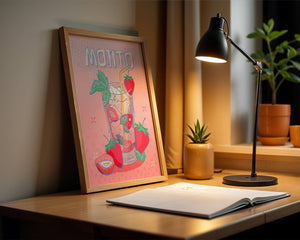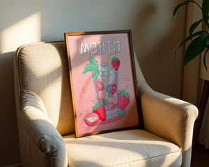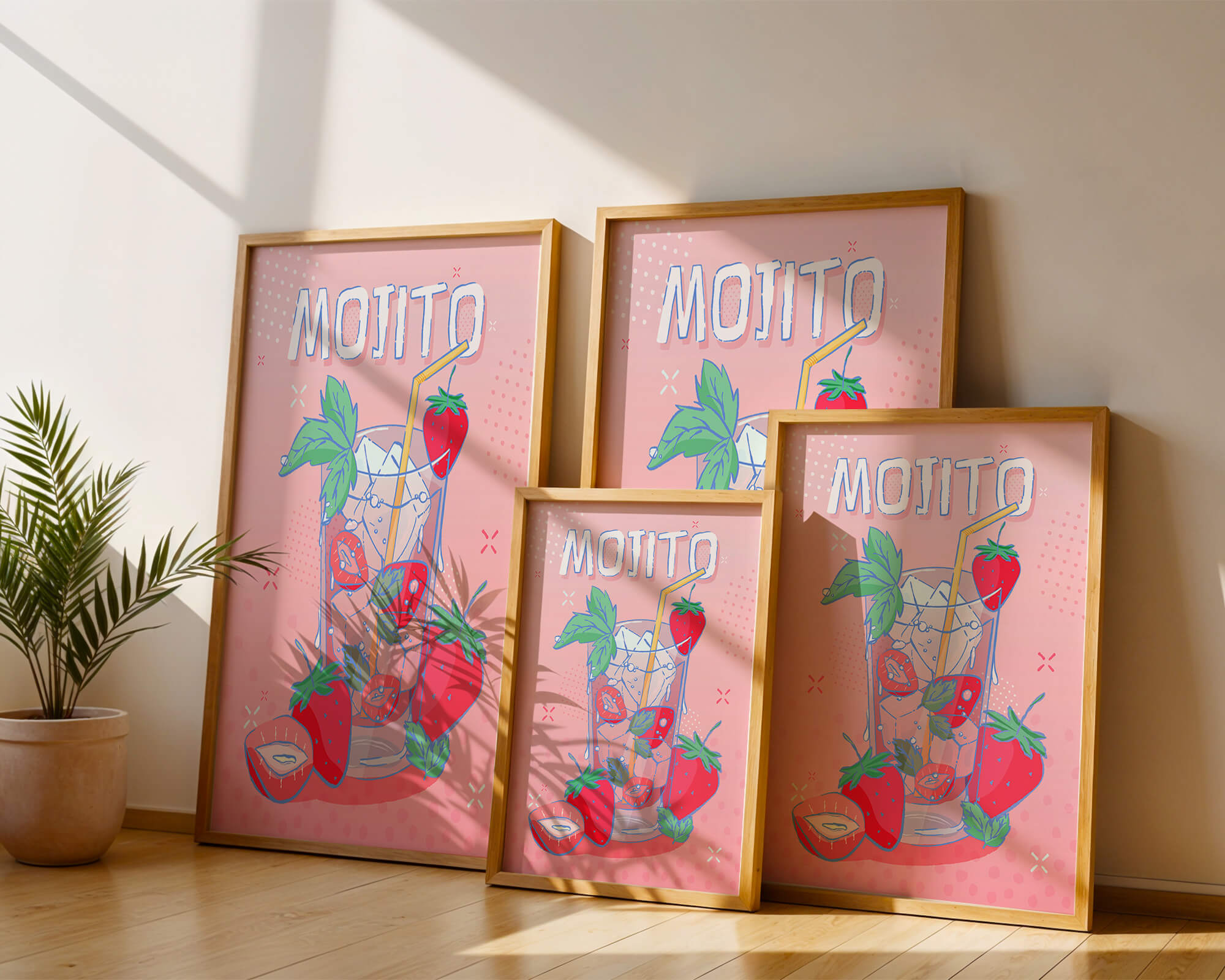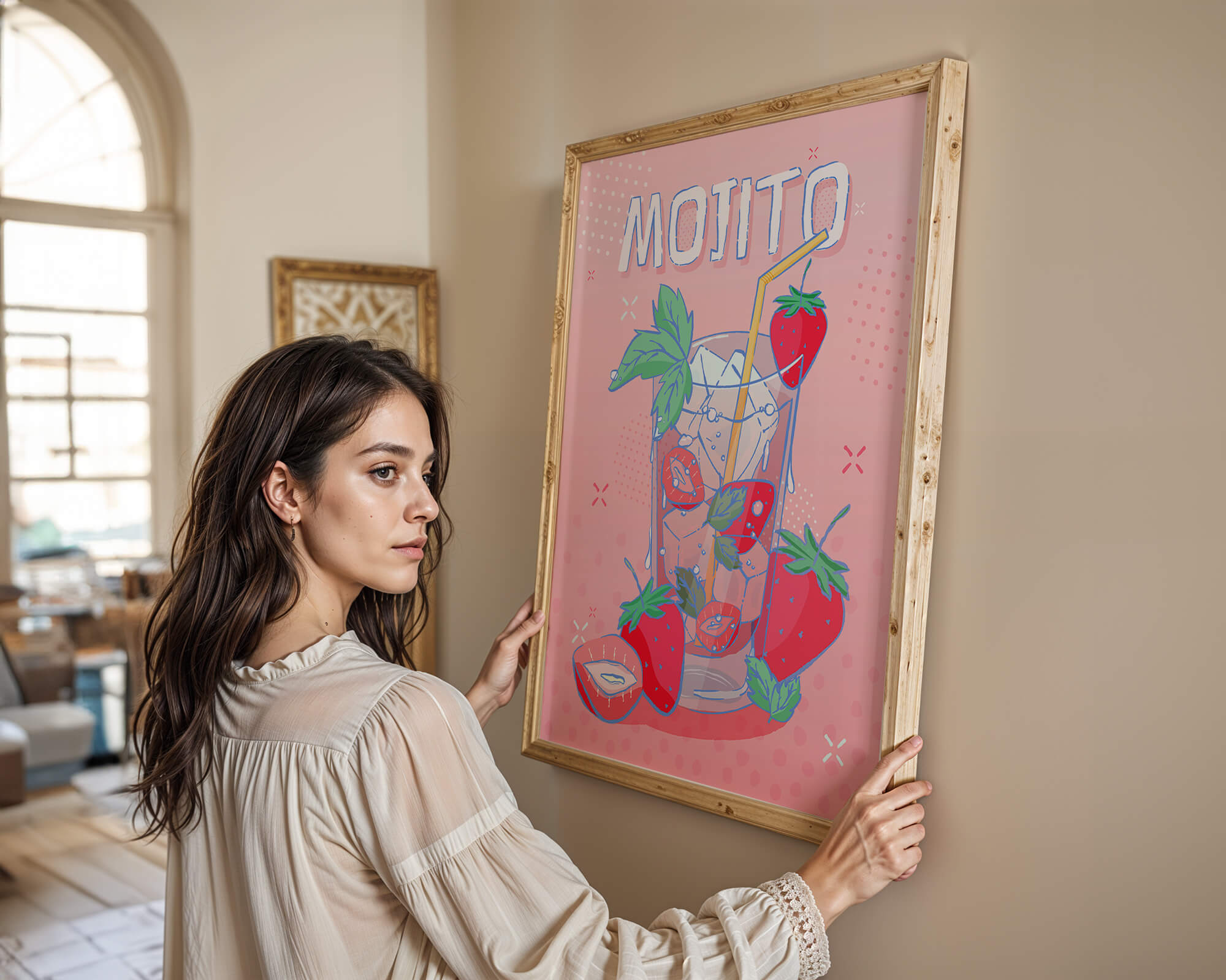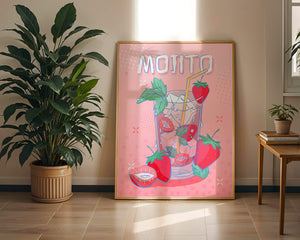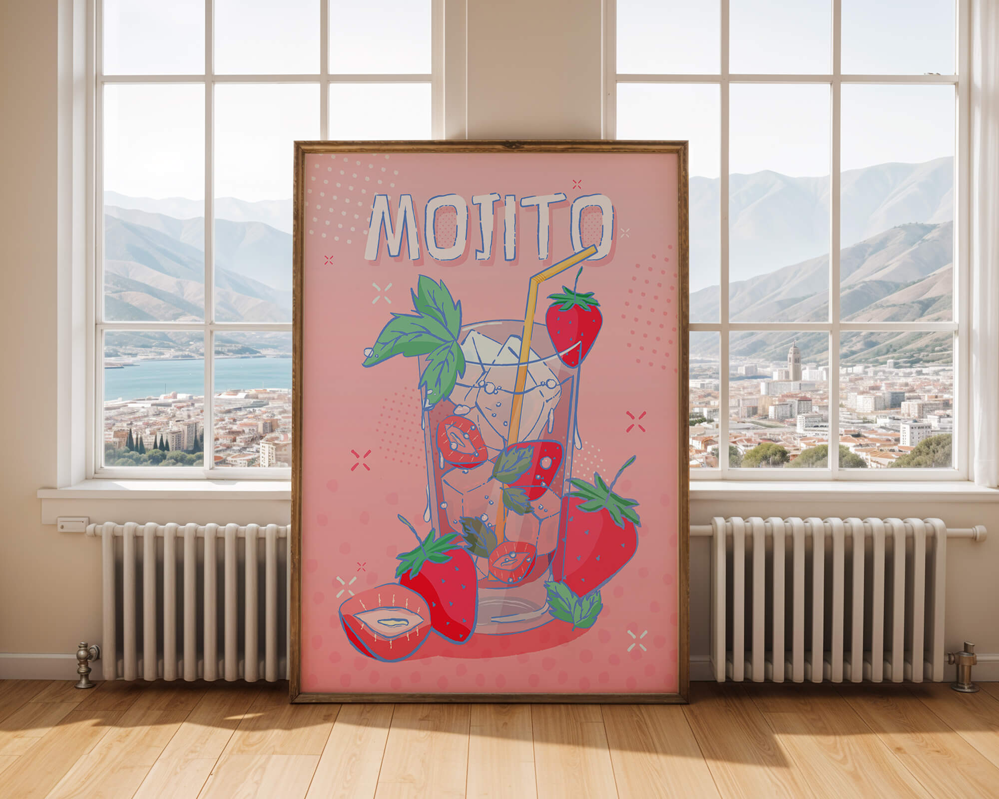 Diese leuchtende und lebendige Illustration fängt mit der Darstellung eines erfrischenden Erdbeer-Mojitos die Essenz des Sommers ein. Vor einem leuchtend rosa Hintergrund wirkt das Bild verspielt und einladend – perfekt für alle, die sowohl Stil als auch subtile Eleganz lieben.