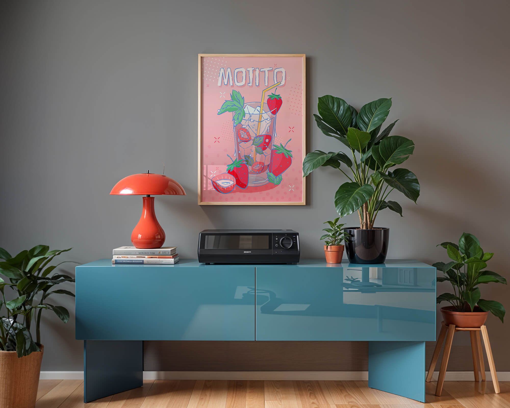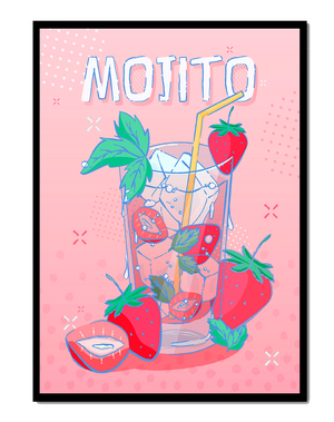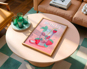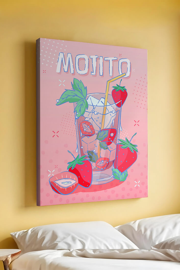Ein hohes Glas gefüllt mit Erdbeeren, Minzblättern und Eiswürfeln steht im Mittelpunkt dieses charmanten Designs. Die erfrischenden Elemente eines klassischen Mojitos werden durch einen Farbtupfer zum Leben erweckt, der durch die verspielten Kritzeleien und den strukturierten Hintergrund noch verstärkt wird. Die Gesamtästhetik ist modern und erinnert an Retro-Design. Ideal für Küchen oder Essbereiche, denen ein Hauch von Spaß und Farbe verliehen werden soll. Dieses Kunstwerk erhellt nicht nur den Raum, sondern fesselt den Betrachter auch durch seine dynamische Komposition. Die Verwendung von Pastelltönen und kräftigen Illustrationen sorgt für ein trendiges Gefühl, das sowohl unbeschwert als auch raffiniert wirkt. Perfekt für Kunstliebhaber, Cocktail-Enthusiasten oder alle, die ein bisschen Sommerflair in ihr| Typ |