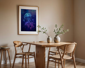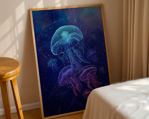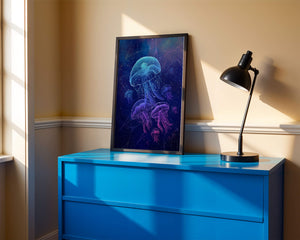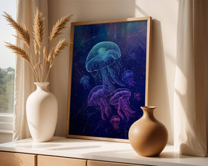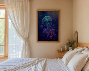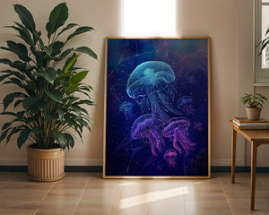 Das Kunstwerk zeigt eine faszinierende Quallenschau, deren durchscheinende Formen unter dem nächtlichen Meer leuchten. Diese Wasserwelt wird durch leuchtende Farben und komplexe Muster zum Leben erweckt und schafft eine ätherische Atmosphäre, die Staunen und Ruhe ausstrahlt. Das Spiel von Licht und Schatten im Bild verstärkt die fantastische Atmosphäre und lädt den Betrachter ein, tief in die geheimnisvolle Schönheit des Ozeans einzutauchen. Perfekt, um jedem Raum einen Hauch von Magie und Ruhe zu verleihen, fängt dieses Werk den zarten Tanz der bezauberndsten Kreaturen der Natur ein.| Typ |