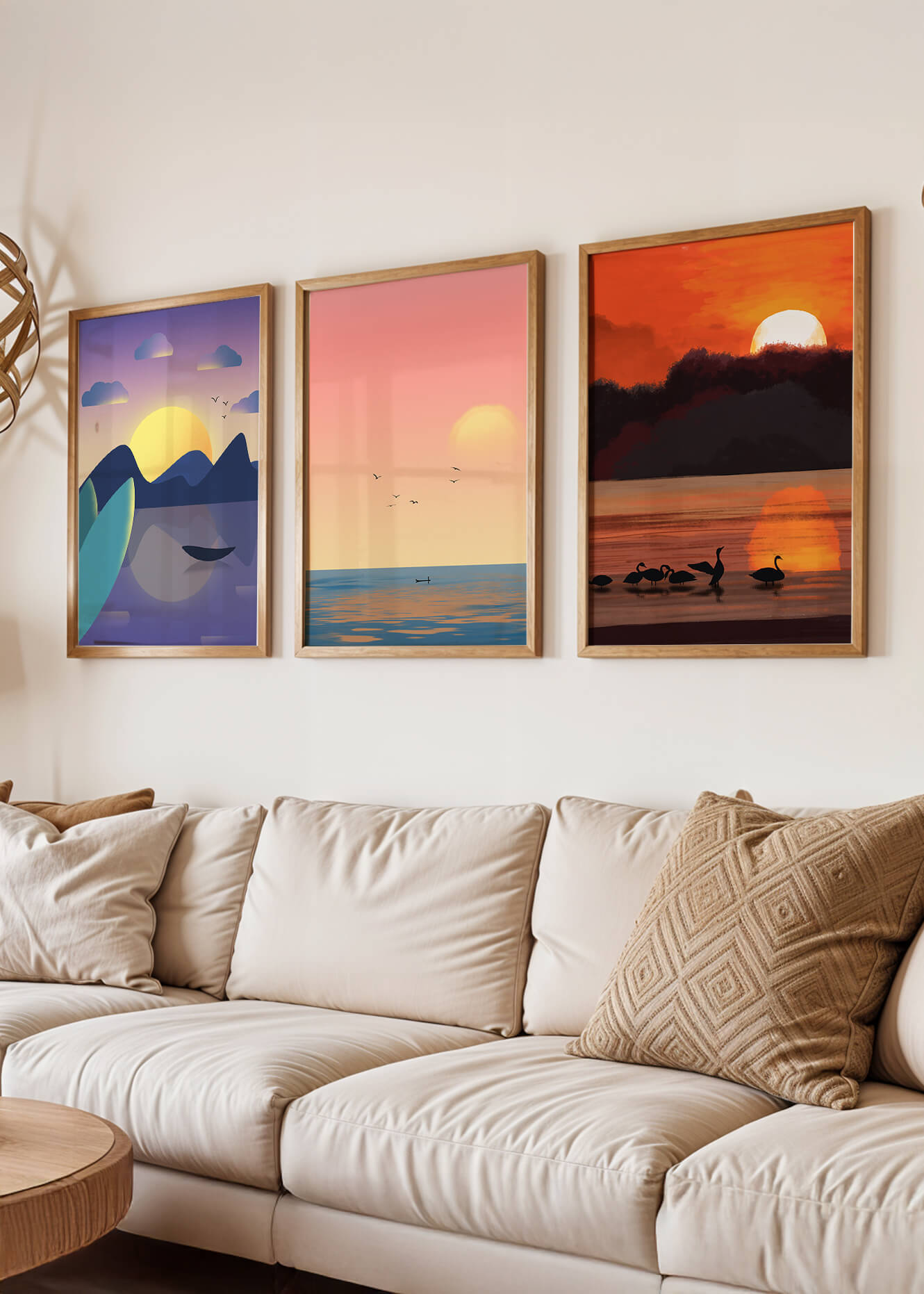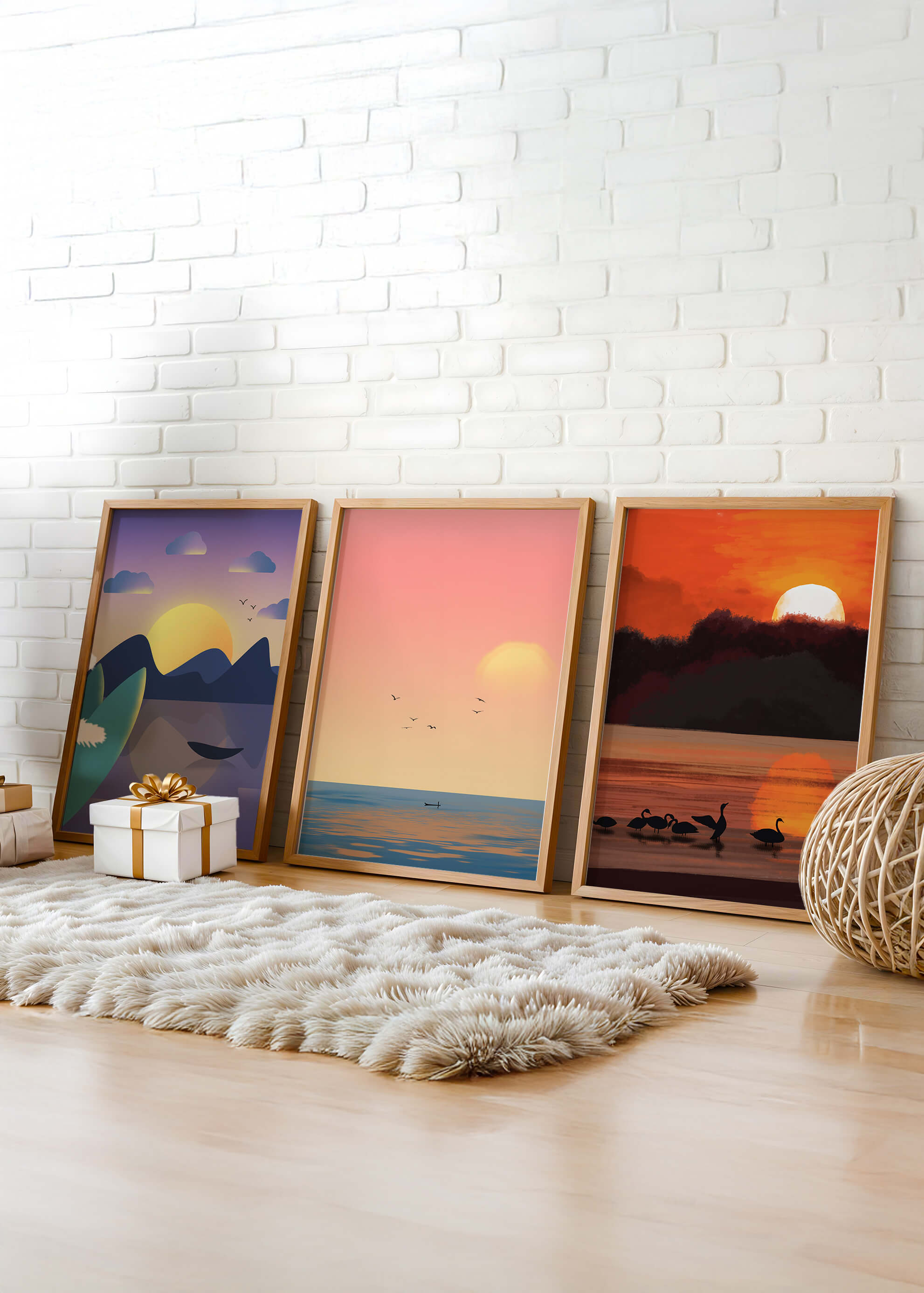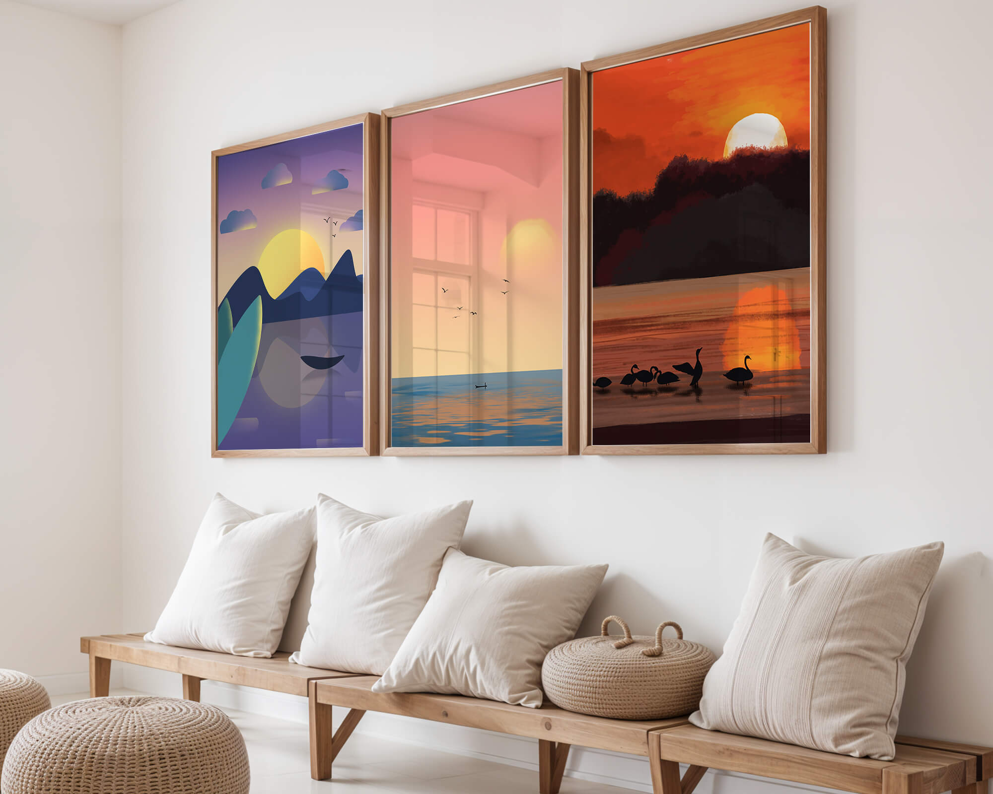 El primer cuadro presenta un amanecer sobre montañas estilizadas en tonos azules y amarillos. Este diseño vibrante captura la esencia de un paisaje montañoso al despertar el día. El segundo cuadro ofrece una representación serena del océano, con tonos cálidos de un atardecer, donde el cielo se mezcla con el mar en una delicada armonía de colores. El tercer cuadro muestra una puesta de sol sobre un lago, con un fondo anaranjado profundo y figuras de aves acuáticas, evocando una escena tranquila y nostálgica. Estas impresiones son ideales para decorar espacios modernos con un toque de naturaleza abstracta.