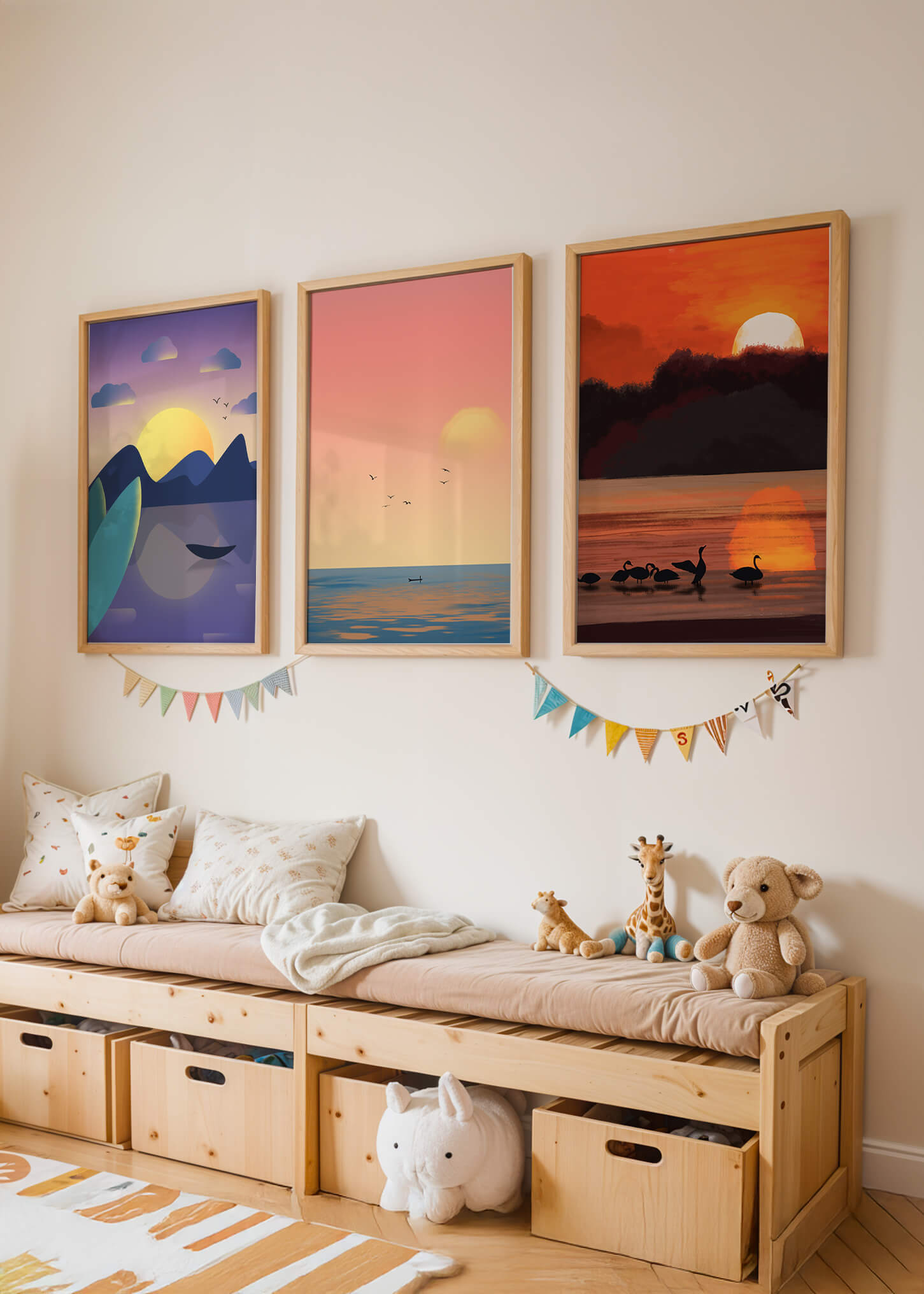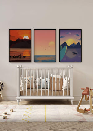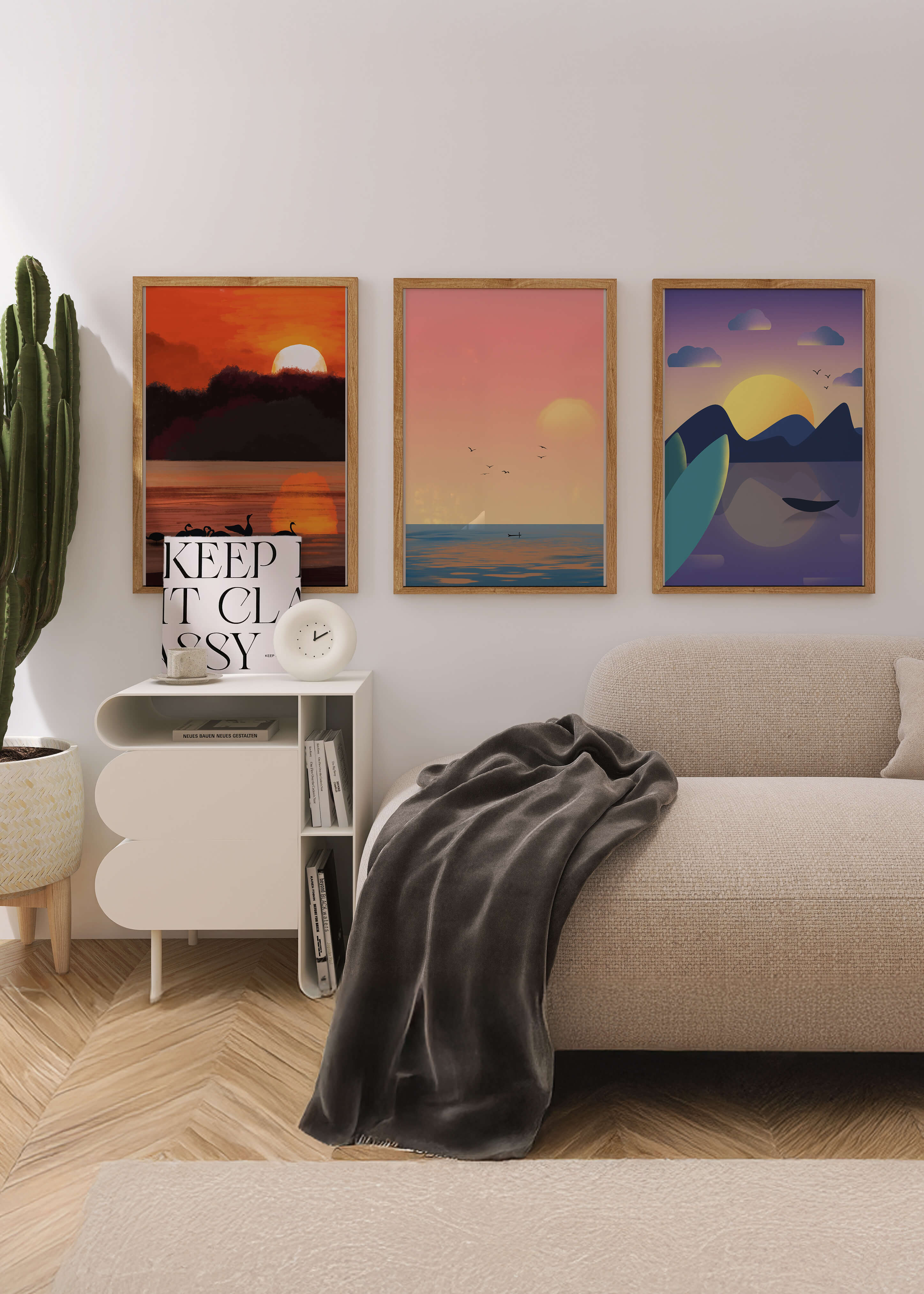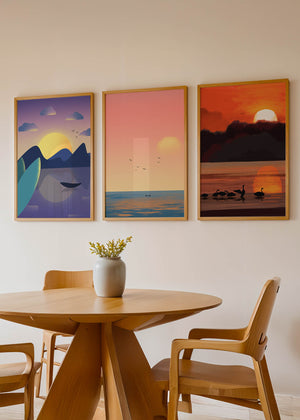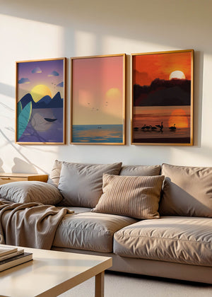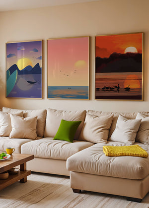 El primer cuadro presenta un amanecer sobre montañas estilizadas en tonos azules y amarillos. Este diseño vibrante captura la esencia de un paisaje montañoso al despertar el día. El segundo cuadro ofrece una representación serena del océano, con tonos cálidos de un atardecer, donde el cielo se mezcla con el mar en una delicada armonía de colores. El tercer cuadro muestra una puesta de sol sobre un lago, con un fondo anaranjado profundo y figuras de aves acuáticas, evocando una escena tranquila y nostálgica. Estas impresiones son ideales para decorar espacios modernos con un toque de naturaleza abstracta.