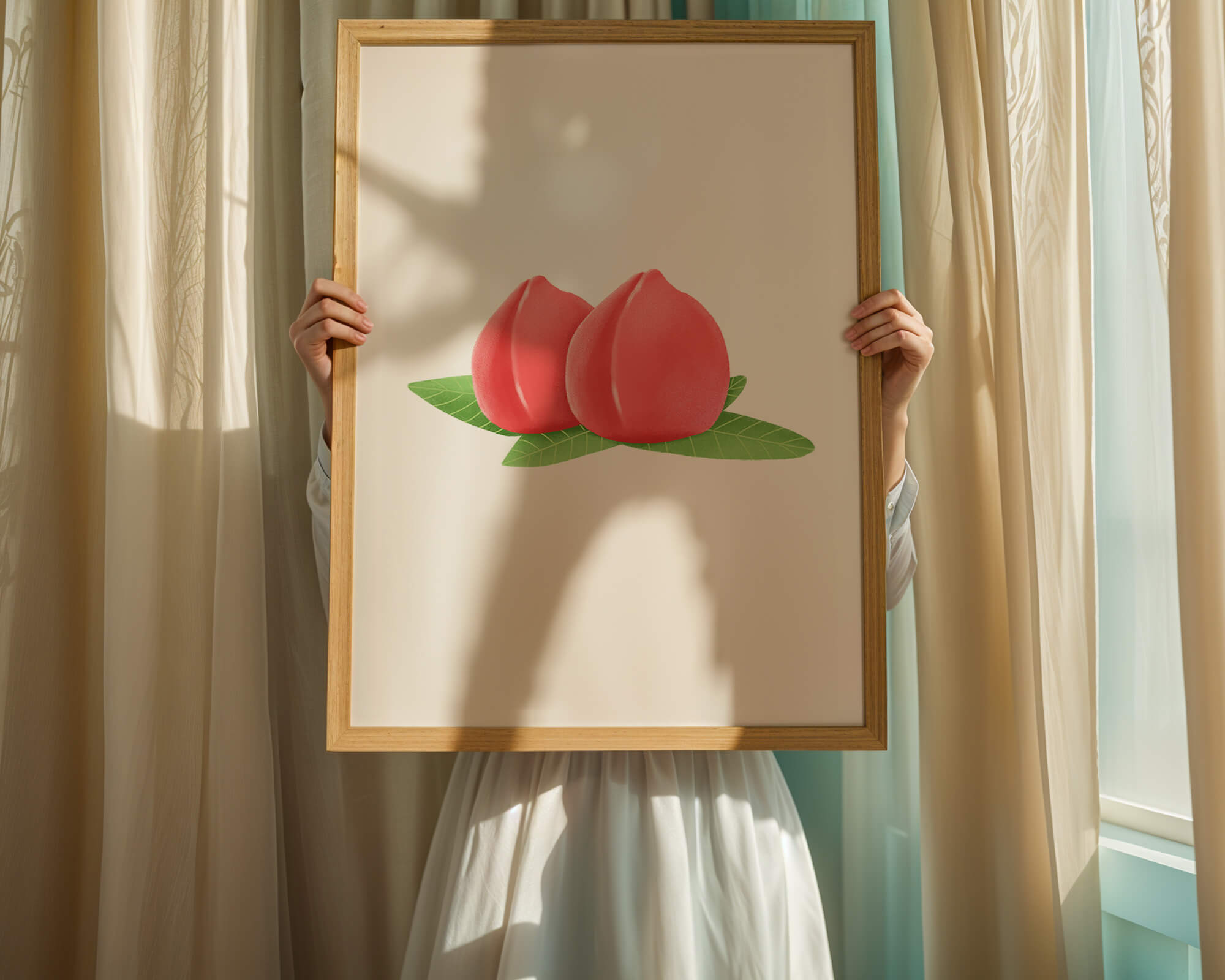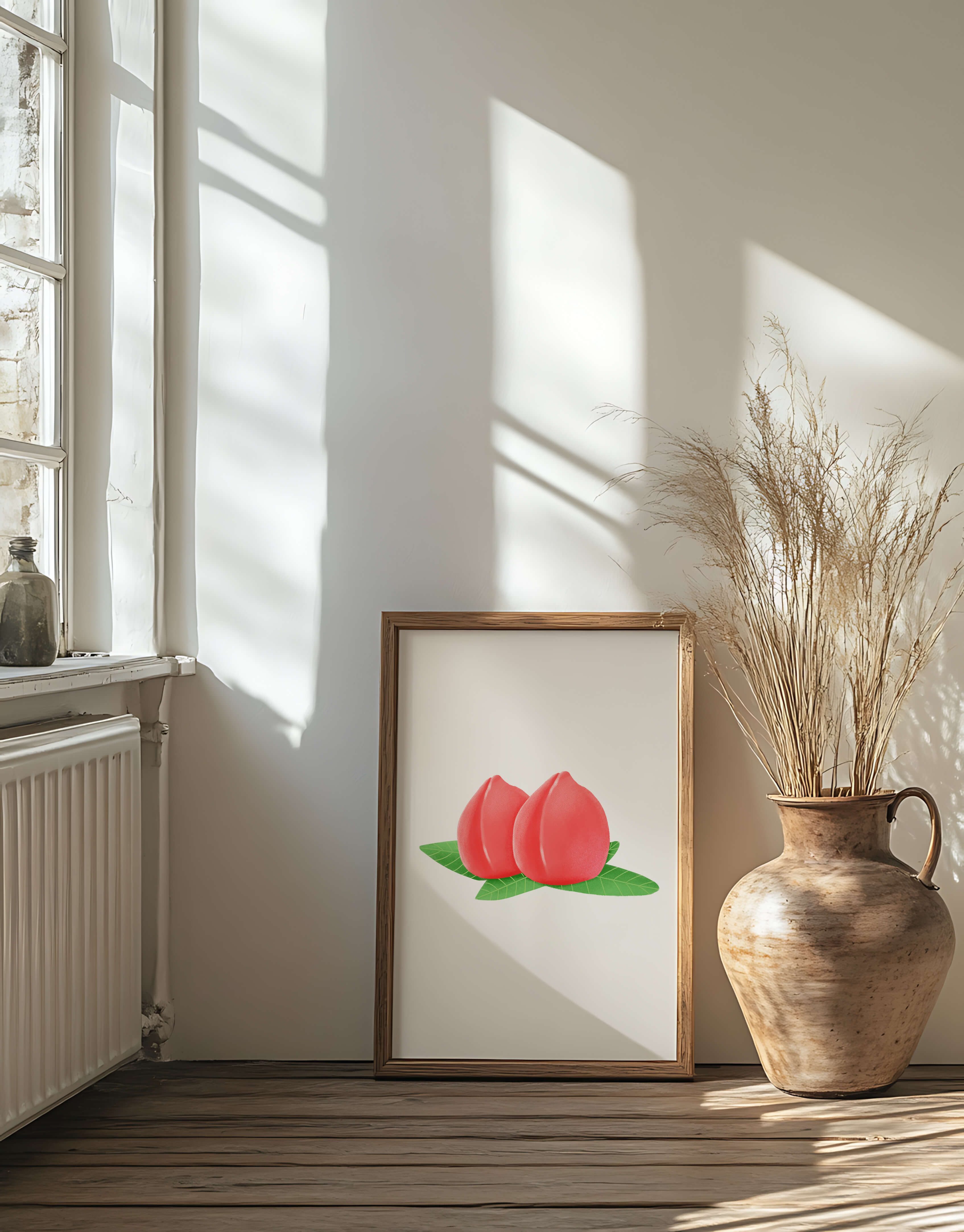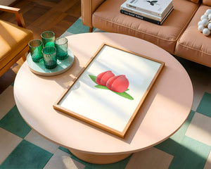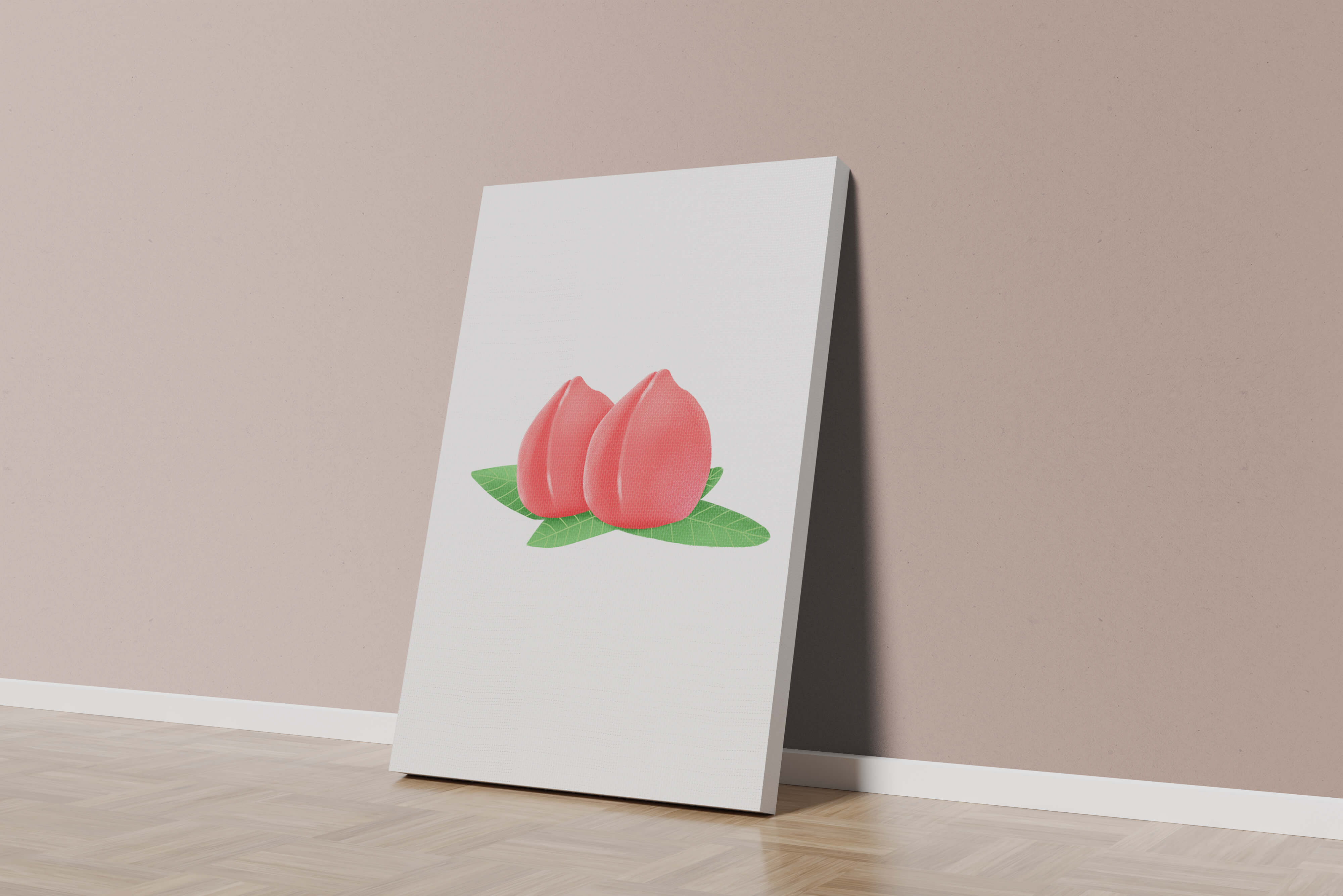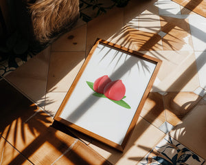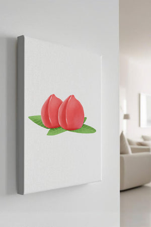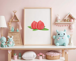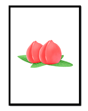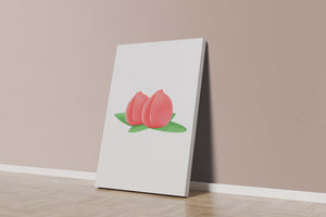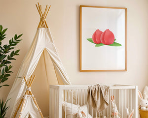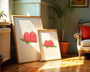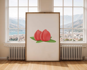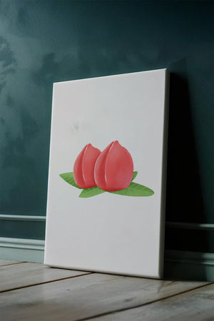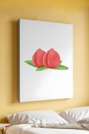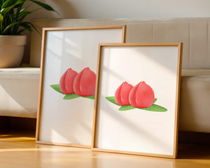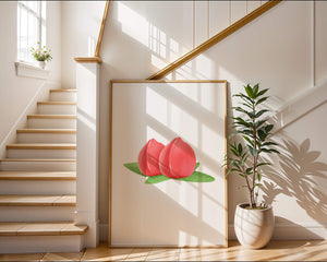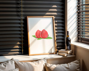 Die farbenfrohe und detailreiche Illustration unterstreicht die saftige Natur der Pfirsiche. Die grünen Blätter bilden einen schönen Kontrast zu den warmen Tönen der Frucht und schaffen ein harmonisches und erfrischendes visuelles Erlebnis. Perfekt, um jedem Raum einen Hauch von Sommerstimmung zu verleihen. Die naturgetreuen Pfirsiche sind mit viel Liebe zum Detail dargestellt, wodurch ihre pralle und saftige Form betont wird. Die Schlichtheit und Eleganz der Komposition machen sie vielseitig einsetzbar und bringen einen Hauch von Natur ins Haus.| Typ |