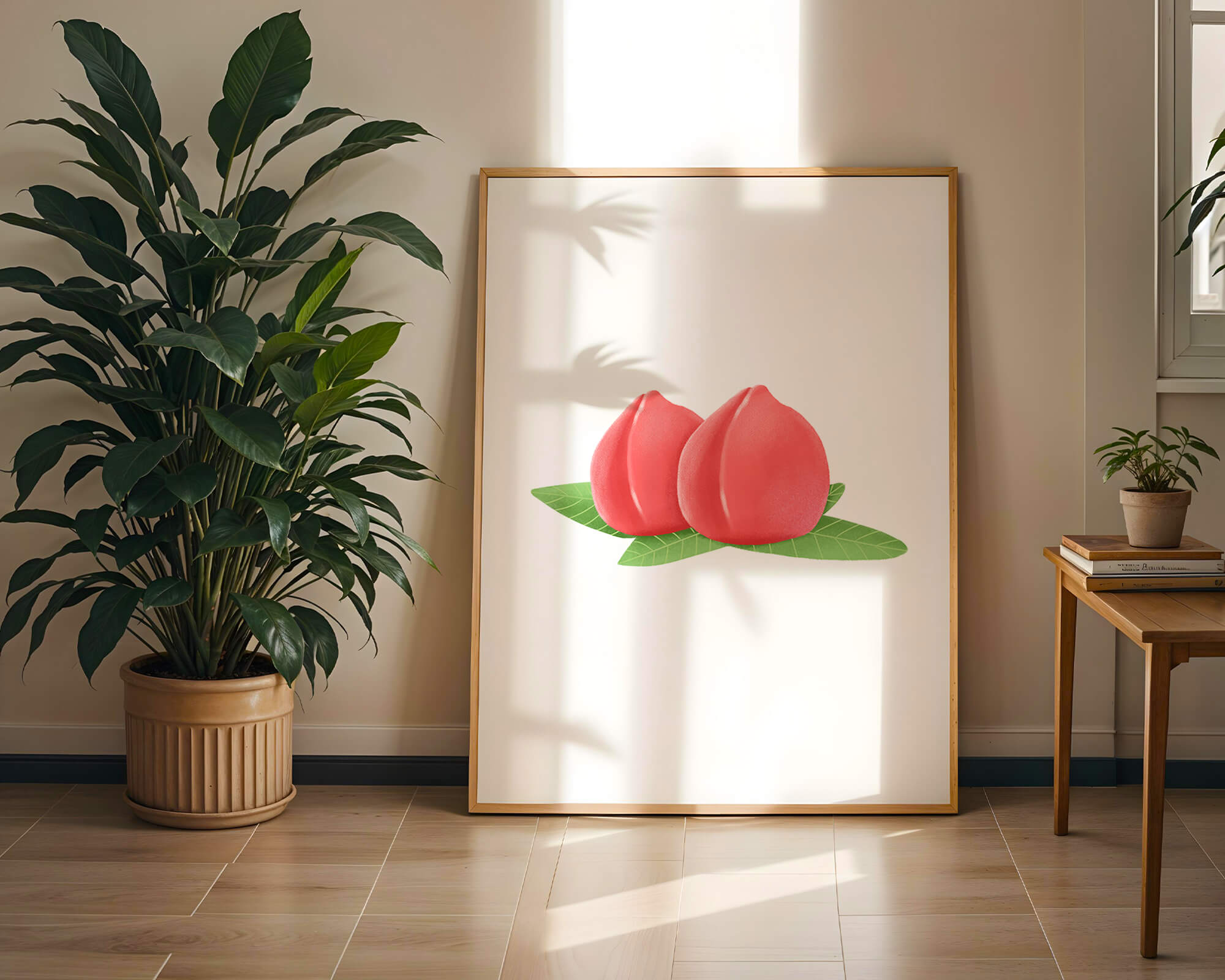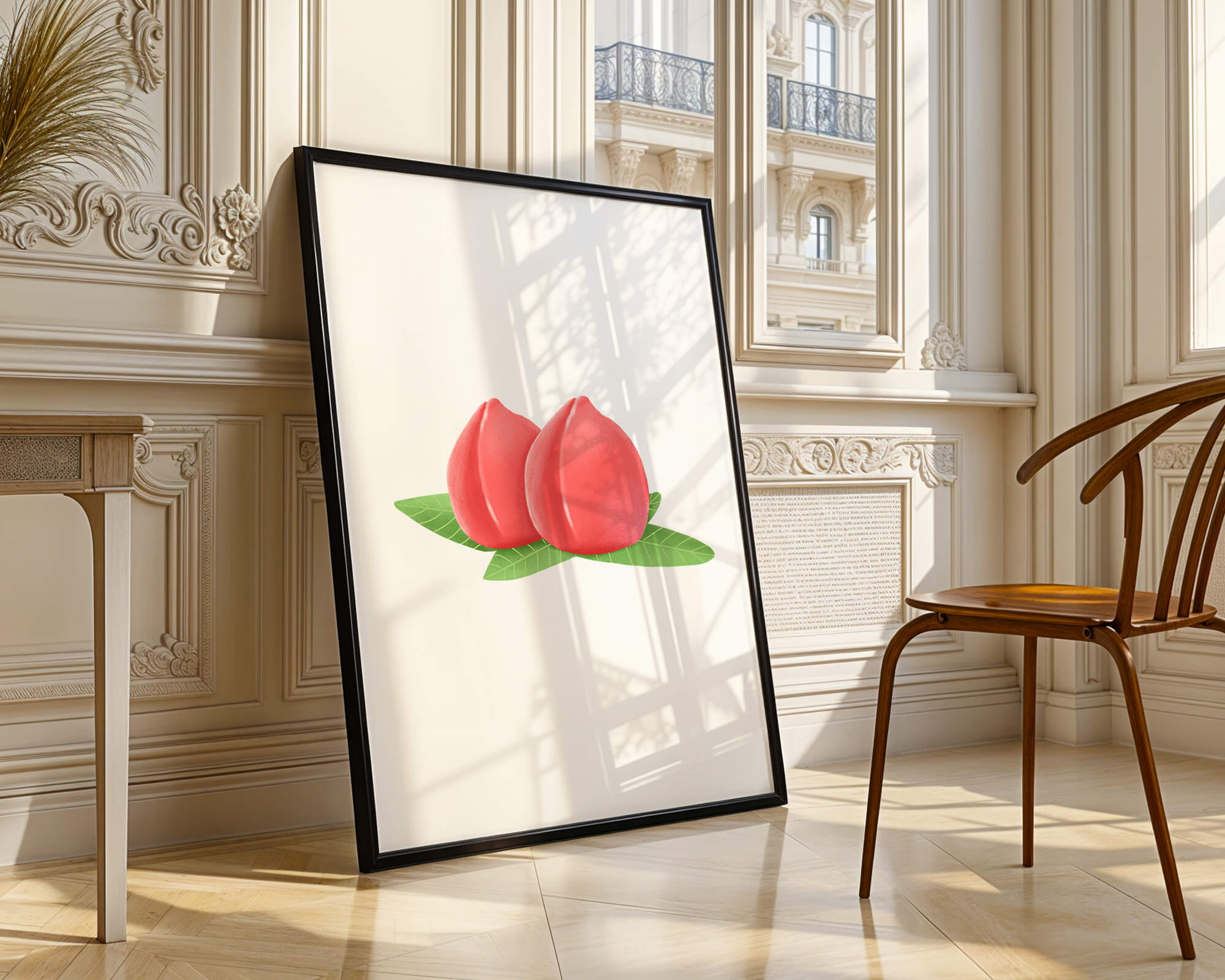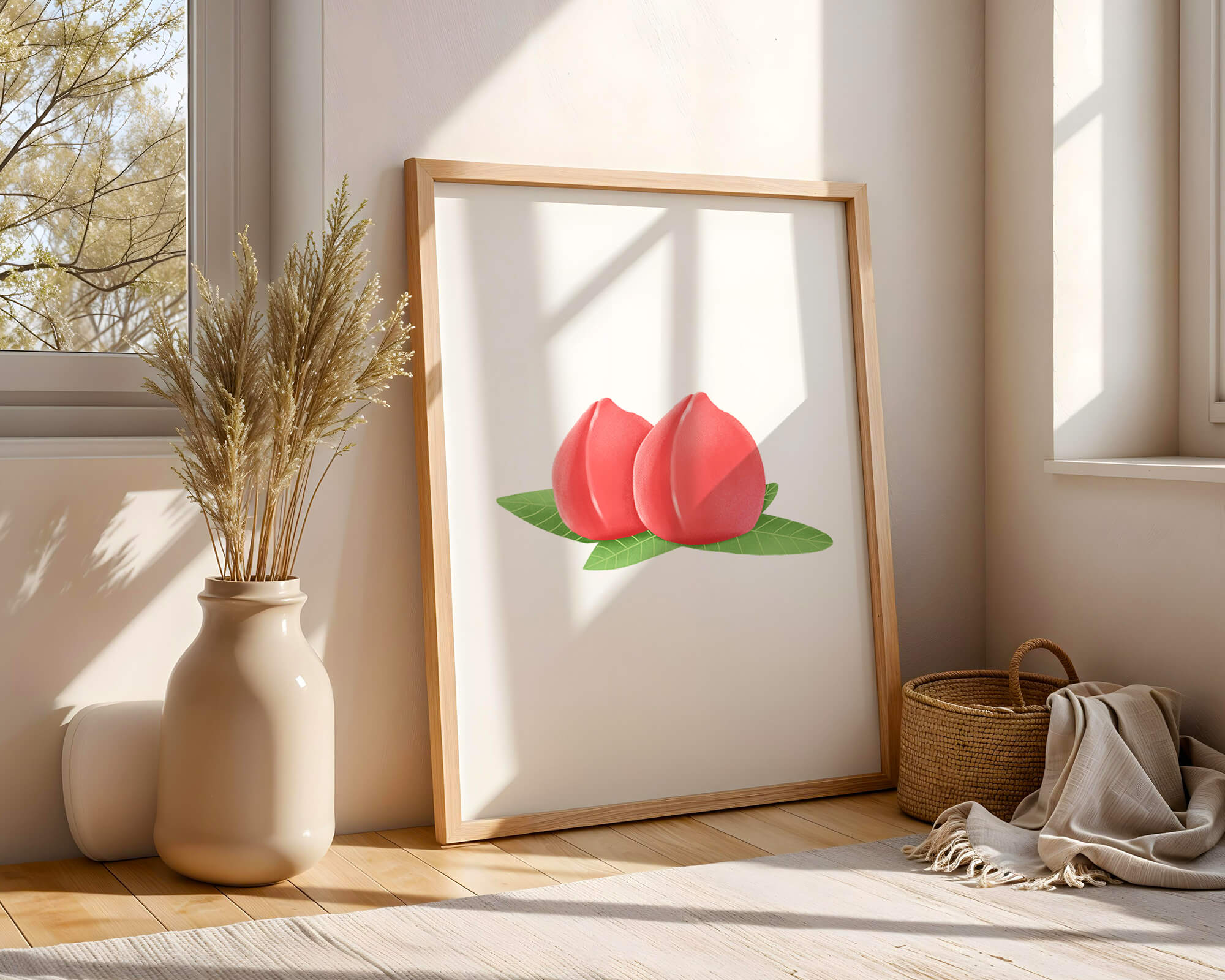 Die farbenfrohe und detailreiche Illustration unterstreicht die saftige Natur der Pfirsiche. Die grünen Blätter bilden einen schönen Kontrast zu den warmen Tönen der Frucht und schaffen ein harmonisches und erfrischendes visuelles Erlebnis. Perfekt, um jedem Raum einen Hauch von Sommerstimmung zu verleihen. Die naturgetreuen Pfirsiche sind mit viel Liebe zum Detail dargestellt, wodurch ihre pralle und saftige Form betont wird. Die Schlichtheit und Eleganz der Komposition machen sie vielseitig einsetzbar und bringen einen Hauch von Natur ins Haus.| Typ |