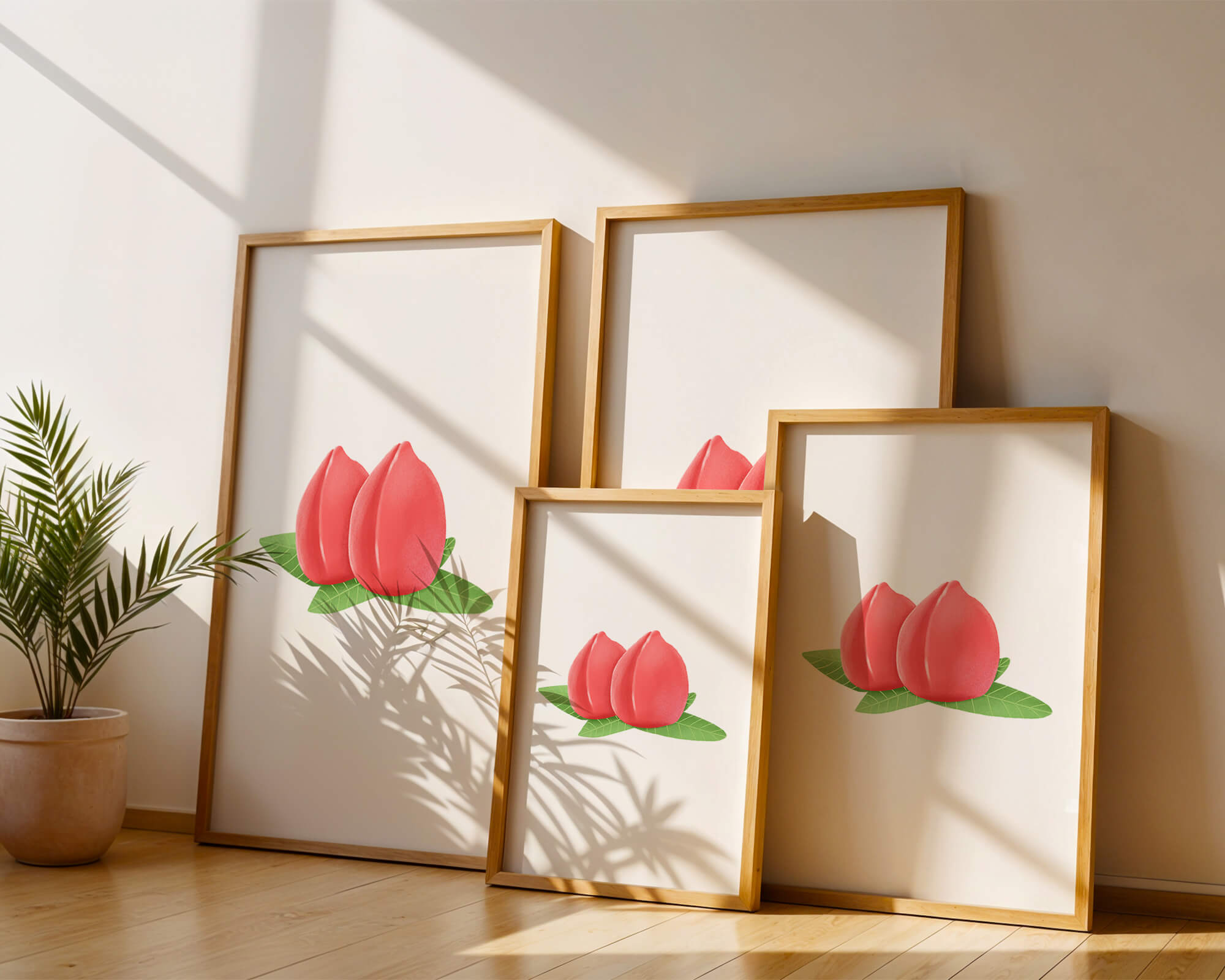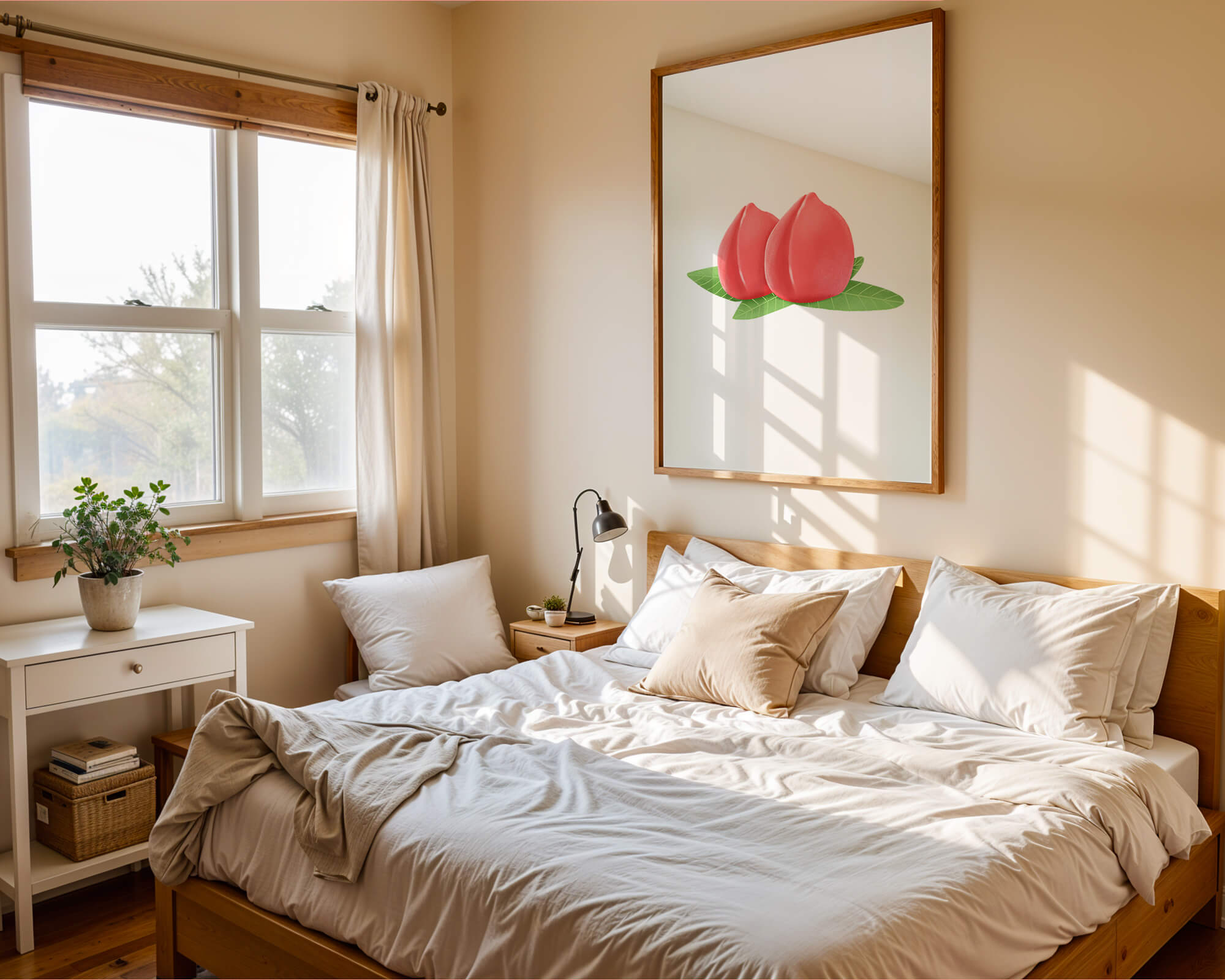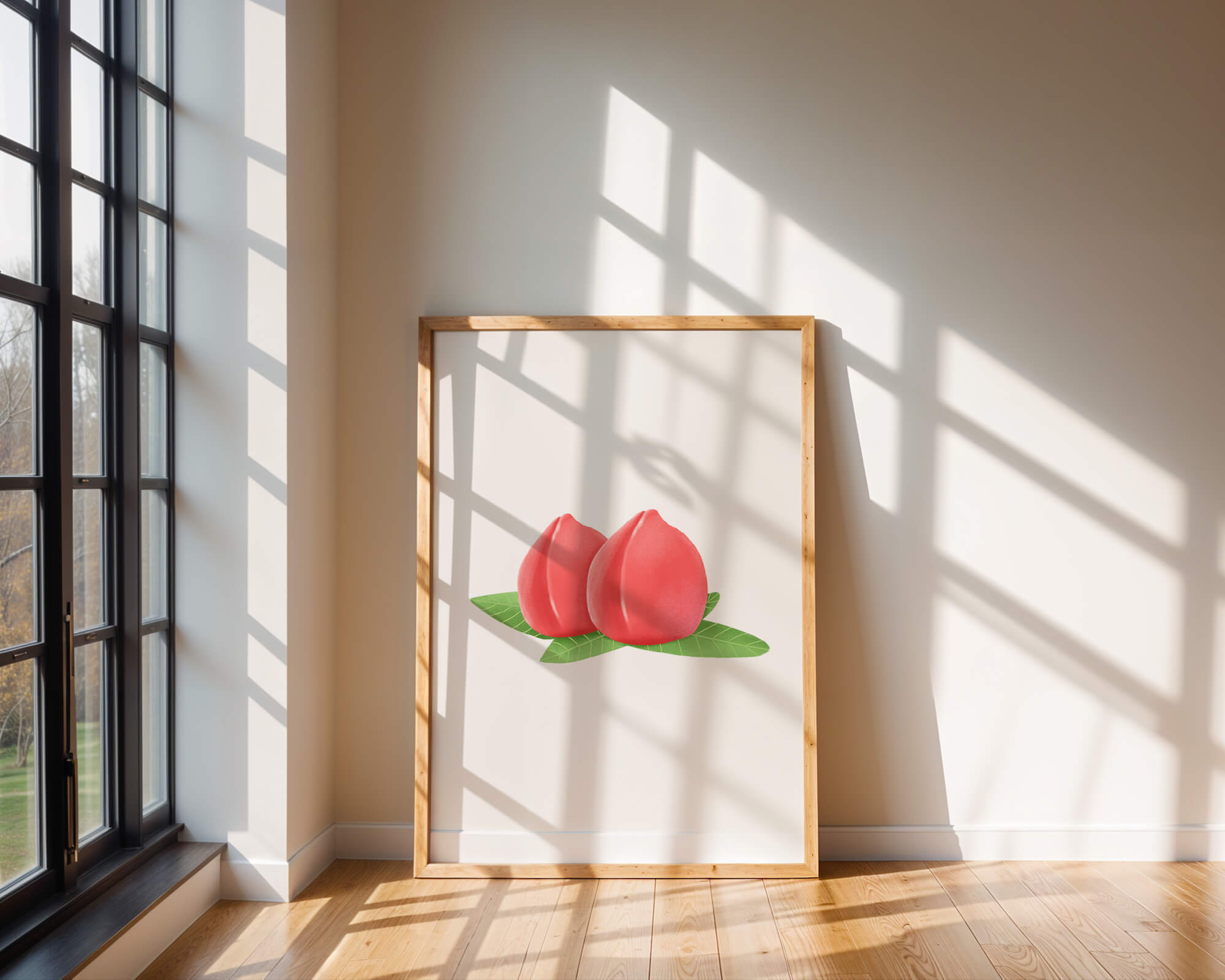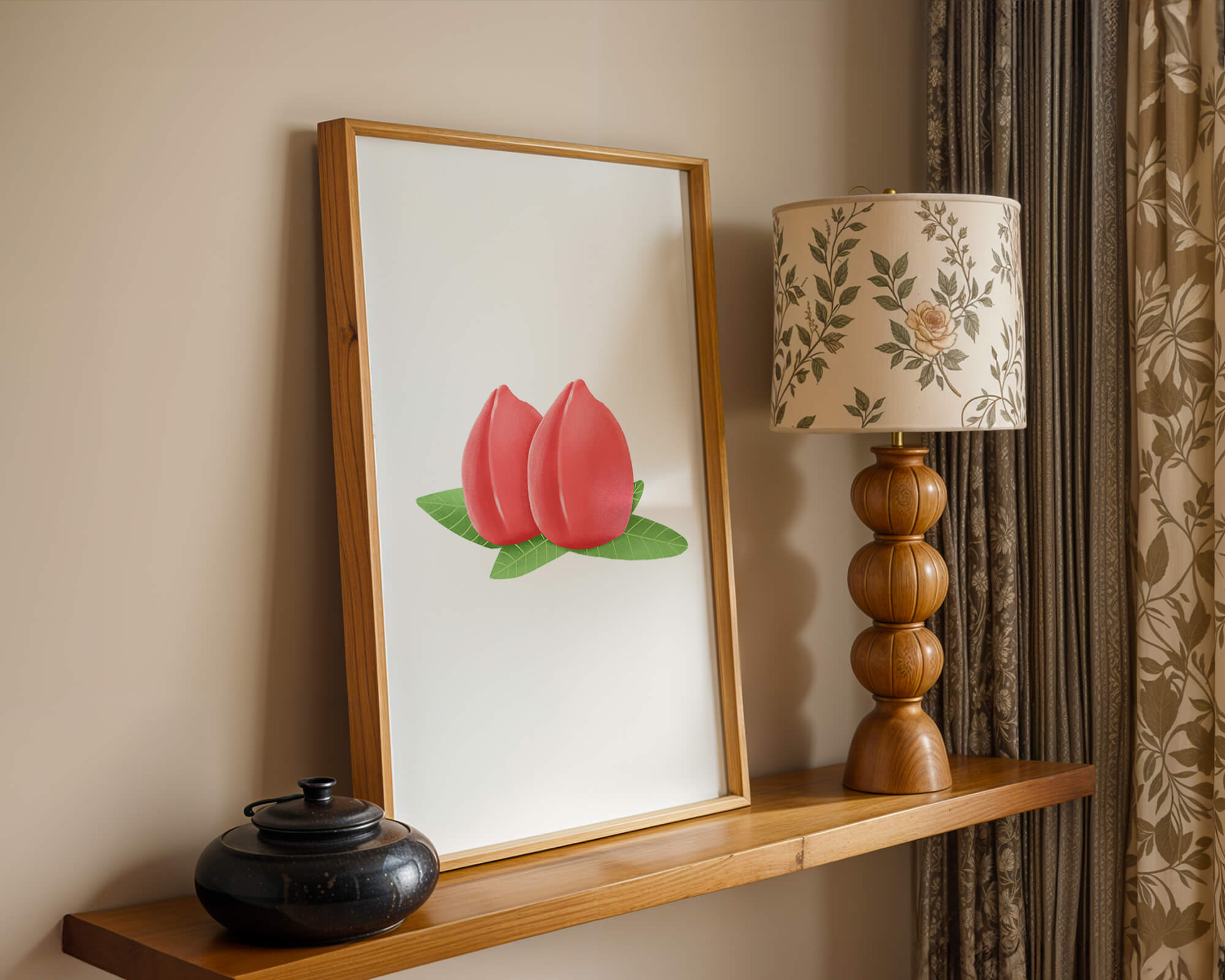 Die farbenfrohe und detailreiche Illustration unterstreicht die saftige Natur der Pfirsiche. Die grünen Blätter bilden einen schönen Kontrast zu den warmen Tönen der Frucht und schaffen ein harmonisches und erfrischendes visuelles Erlebnis. Perfekt, um jedem Raum einen Hauch von Sommerstimmung zu verleihen. Die naturgetreuen Pfirsiche sind mit viel Liebe zum Detail dargestellt, wodurch ihre pralle und saftige Form betont wird. Die Schlichtheit und Eleganz der Komposition machen sie vielseitig einsetzbar und bringen einen Hauch von Natur ins Haus.| Typ |