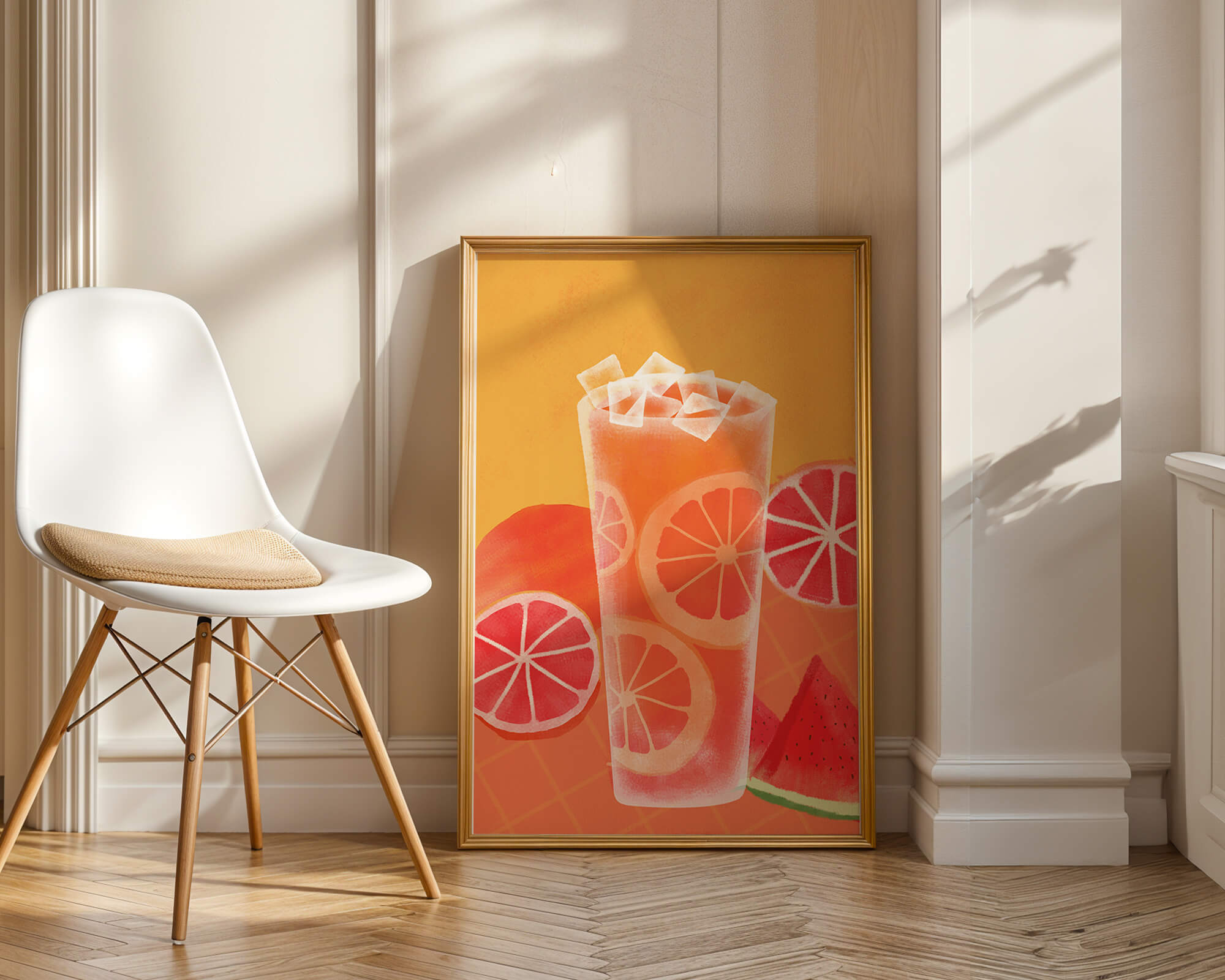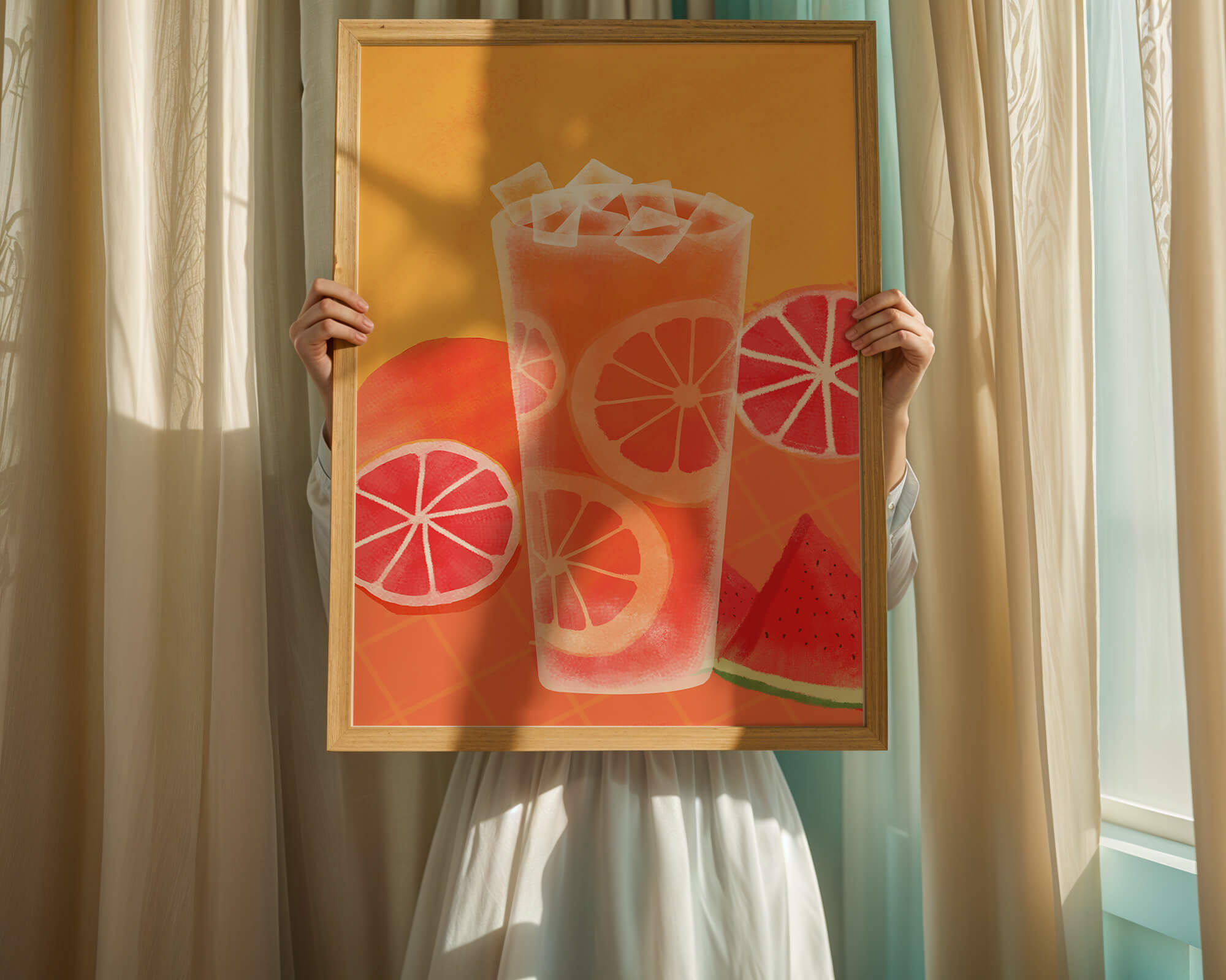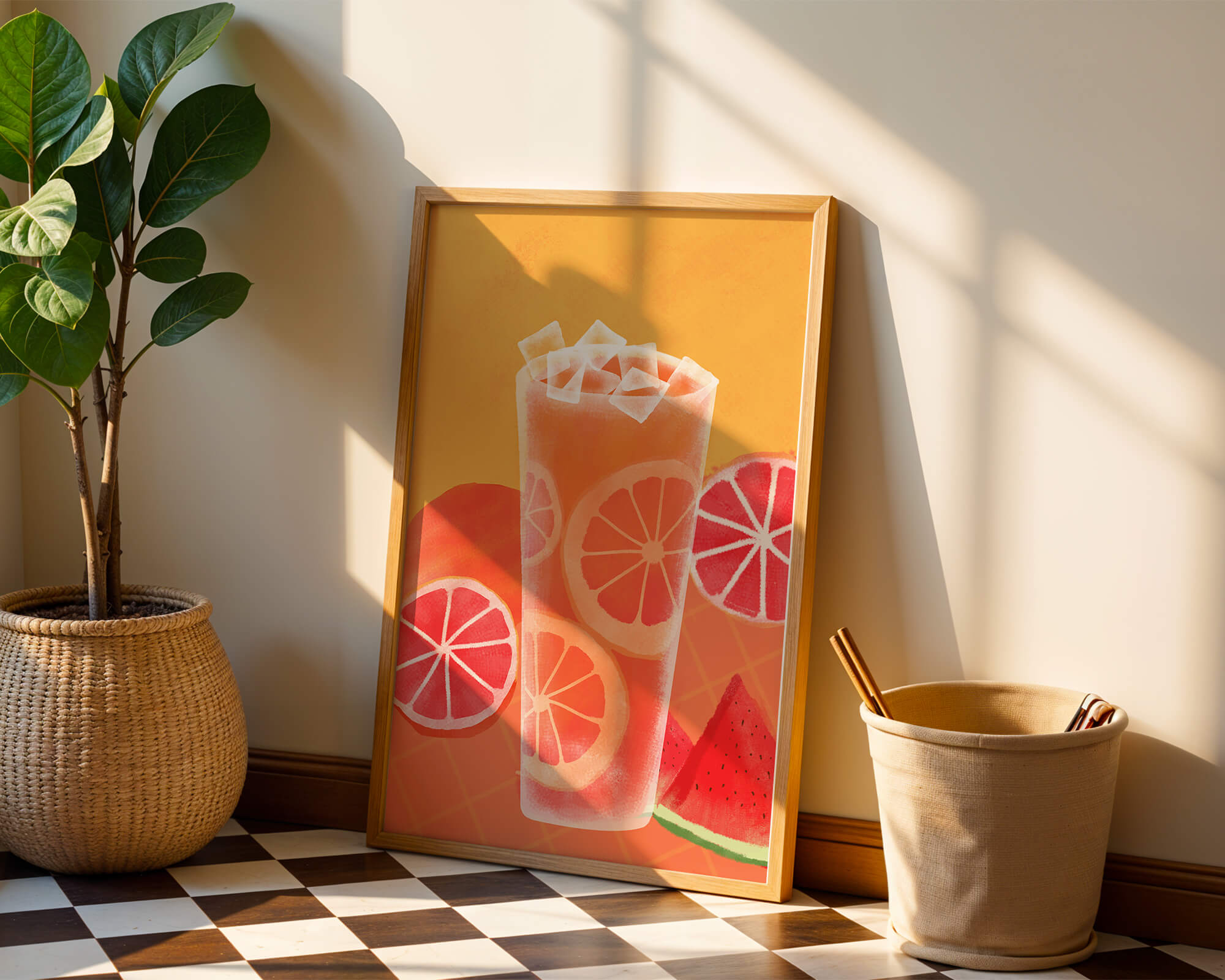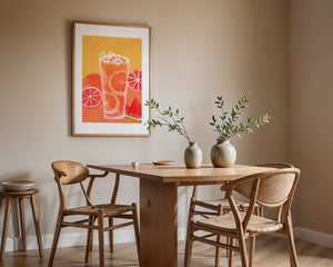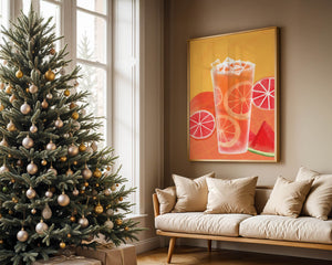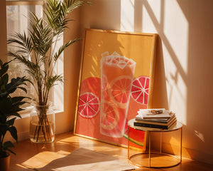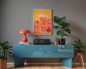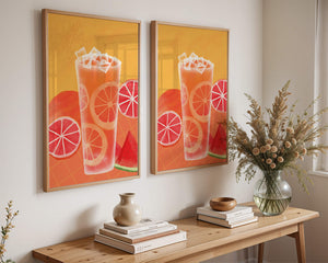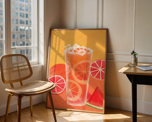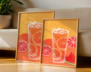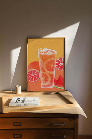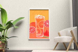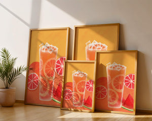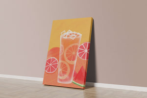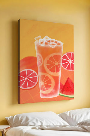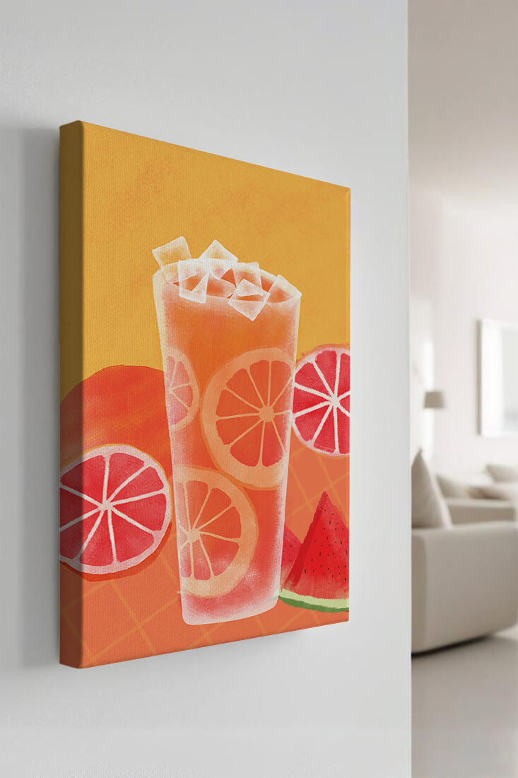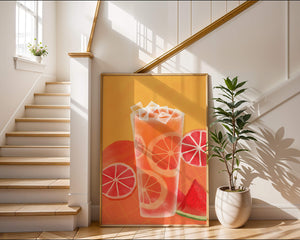 Diese farbenfrohe Illustration zeigt ein hohes Glas mit einem erfrischenden Fruchtcocktail. Zitrusfruchtscheiben, wie beispielsweise Grapefruit, heben sich hervor und verleihen dem Getränk eine pikante Note. Die leuchtenden Farben der Zitrusscheiben und das satte Rot der Wassermelone sorgen für einen optischen Genuss und suggerieren eine Mischung voller Aromen und Frische. Der Hintergrund ist ein warmes, einladendes Orange, das das Getränk perfekt ergänzt und seine Attraktivität in Küche oder Esszimmer unterstreicht. Eiswürfel schwimmen obenauf und sorgen für eine kühle Note, die das Bild eines perfekten Durstlöschers für den Sommer abrundet. Die lebendige Darstellung von Früchten und leuchtenden Farbtönen macht das Kunstwerk zu einer reizvollen Ergänzung für jede sommerliche Dekoration.| Typ |
