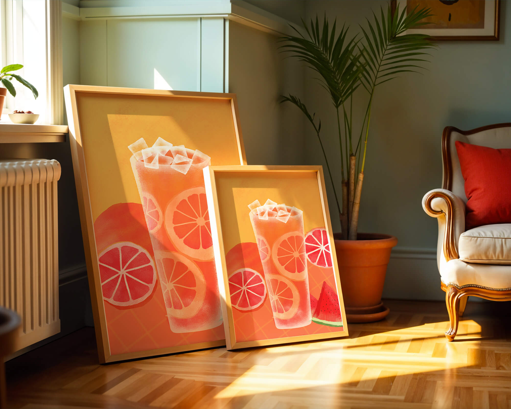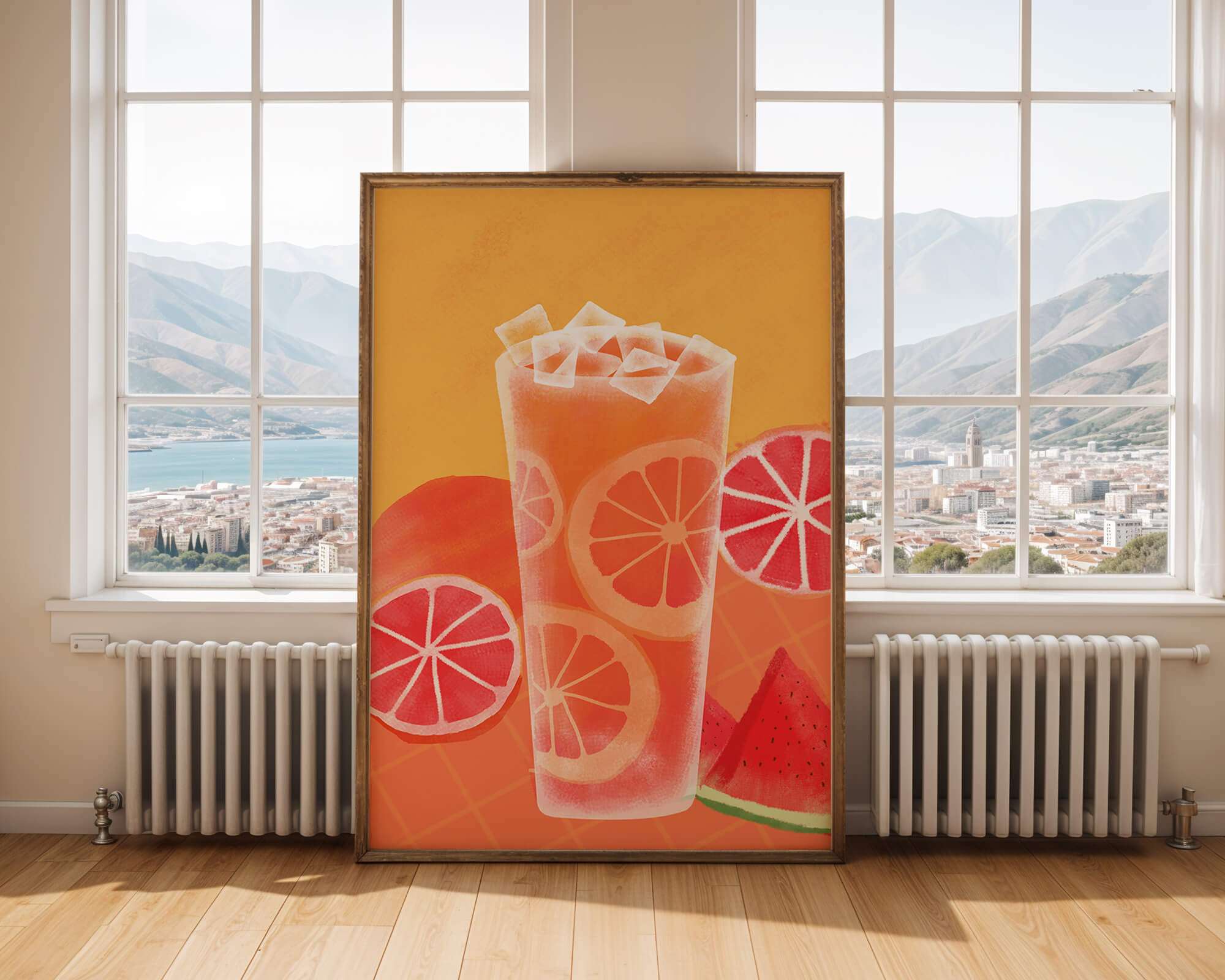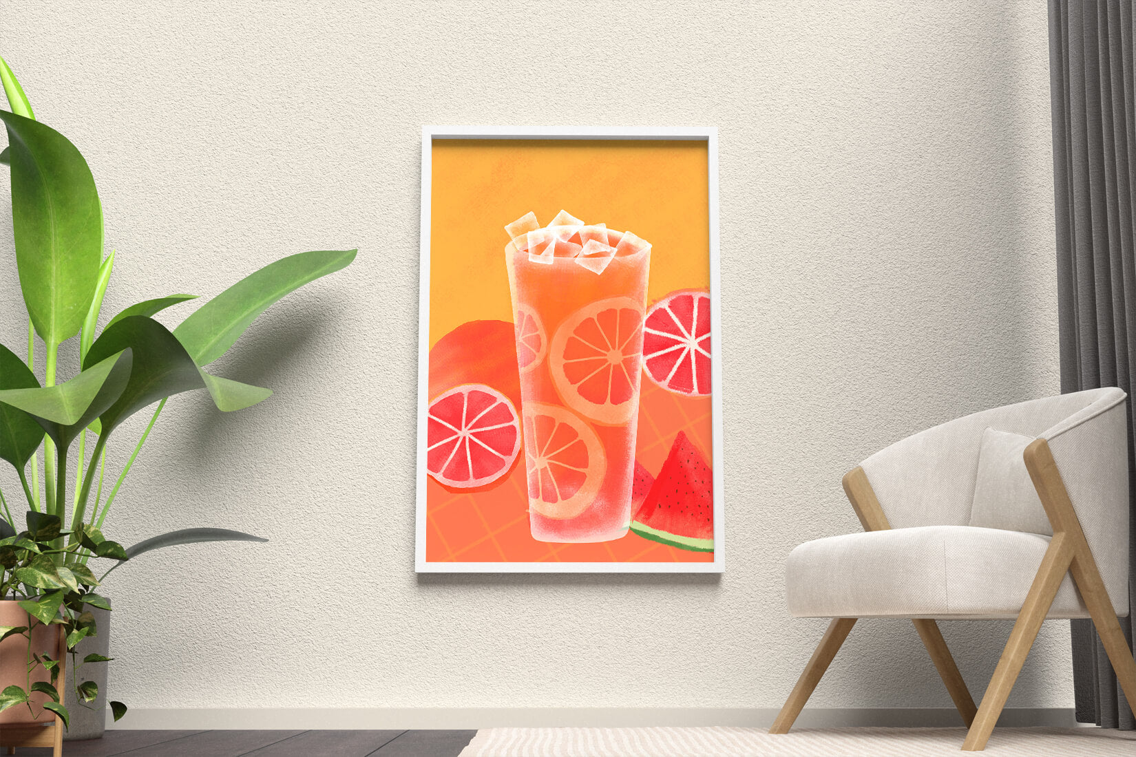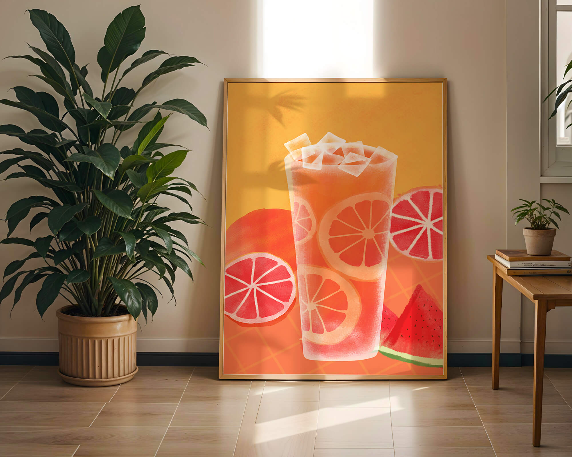 Diese farbenfrohe Illustration zeigt ein hohes Glas mit einem erfrischenden Fruchtcocktail. Zitrusfruchtscheiben, wie beispielsweise Grapefruit, heben sich hervor und verleihen dem Getränk eine pikante Note. Die leuchtenden Farben der Zitrusscheiben und das satte Rot der Wassermelone sorgen für einen optischen Genuss und suggerieren eine Mischung voller Aromen und Frische. Der Hintergrund ist ein warmes, einladendes Orange, das das Getränk perfekt ergänzt und seine Attraktivität in Küche oder Esszimmer unterstreicht. Eiswürfel schwimmen obenauf und sorgen für eine kühle Note, die das Bild eines perfekten Durstlöschers für den Sommer abrundet. Die lebendige Darstellung von Früchten und leuchtenden Farbtönen macht das Kunstwerk zu einer reizvollen Ergänzung für jede sommerliche Dekoration.| Typ |