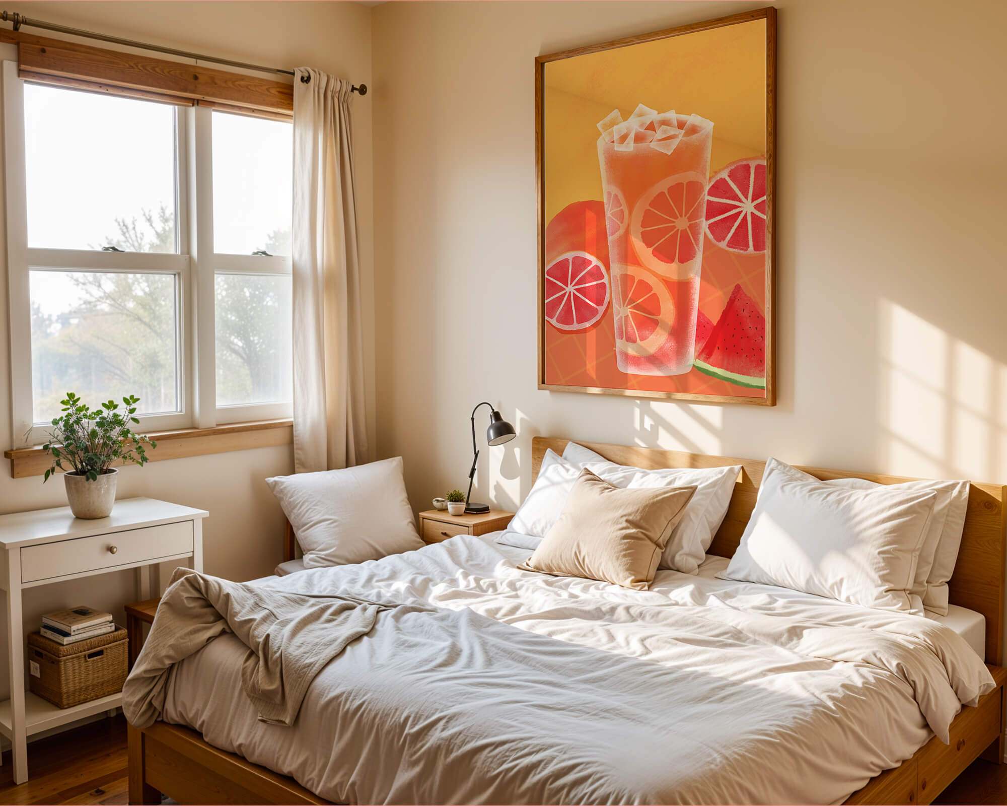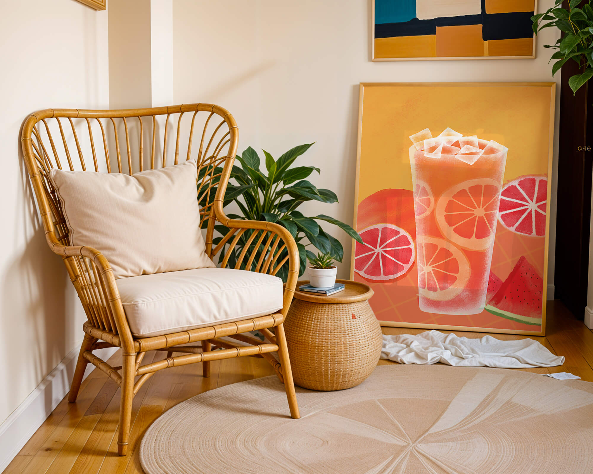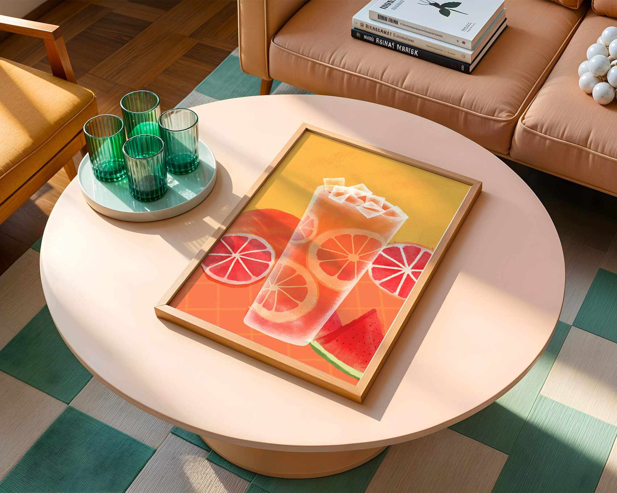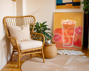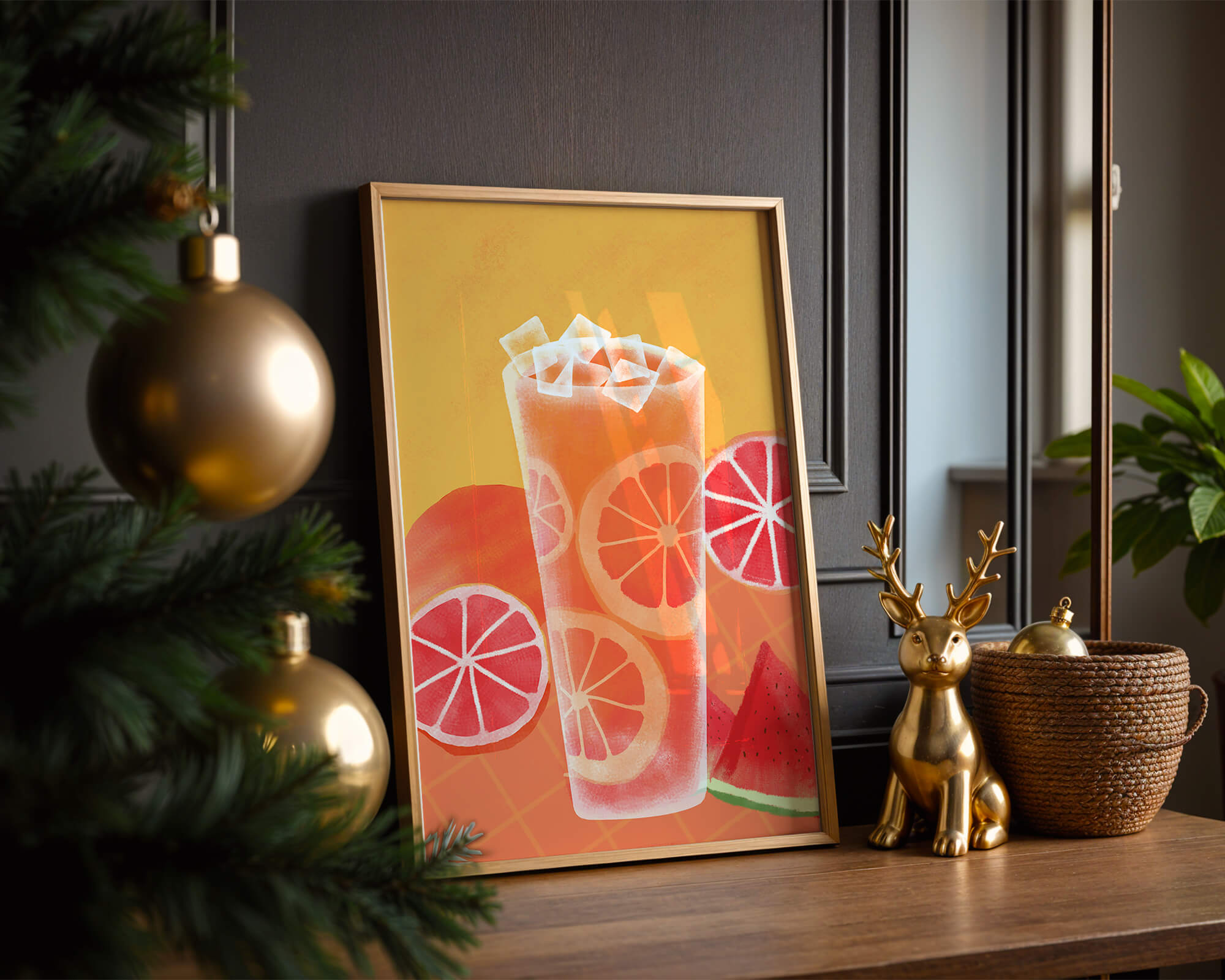 Diese farbenfrohe Illustration zeigt ein hohes Glas mit einem erfrischenden Fruchtcocktail. Zitrusfruchtscheiben, wie beispielsweise Grapefruit, heben sich hervor und verleihen dem Getränk eine pikante Note. Die leuchtenden Farben der Zitrusscheiben und das satte Rot der Wassermelone sorgen für einen optischen Genuss und suggerieren eine Mischung voller Aromen und Frische. Der Hintergrund ist ein warmes, einladendes Orange, das das Getränk perfekt ergänzt und seine Attraktivität in Küche oder Esszimmer unterstreicht. Eiswürfel schwimmen obenauf und sorgen für eine kühle Note, die das Bild eines perfekten Durstlöschers für den Sommer abrundet. Die lebendige Darstellung von Früchten und leuchtenden Farbtönen macht das Kunstwerk zu einer reizvollen Ergänzung für jede sommerliche Dekoration.| Typ |