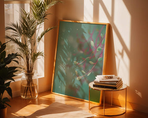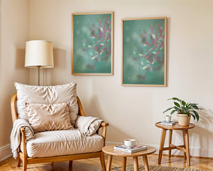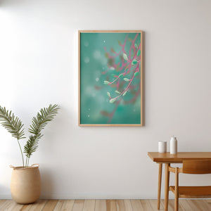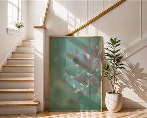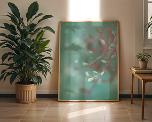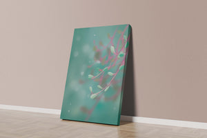 Das Bild zeigt ein beruhigendes und heiteres abstraktes Design mit zarten pastellfarbenen Blättern vor einem wohltuend unscharfen Hintergrund. Das subtile Zusammenspiel von Farben und Formen schafft eine ruhige Atmosphäre, die die Atmosphäre jedes Raumes perfekt aufwertet.
