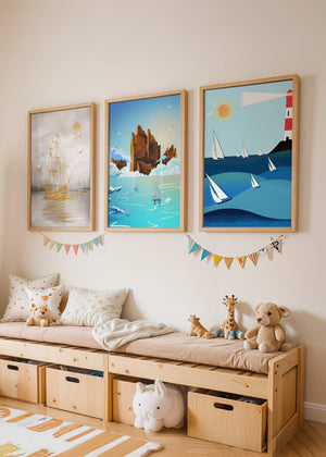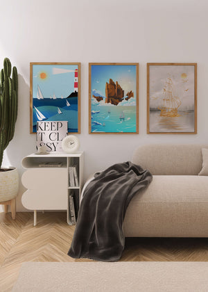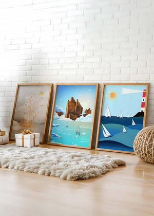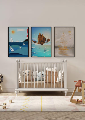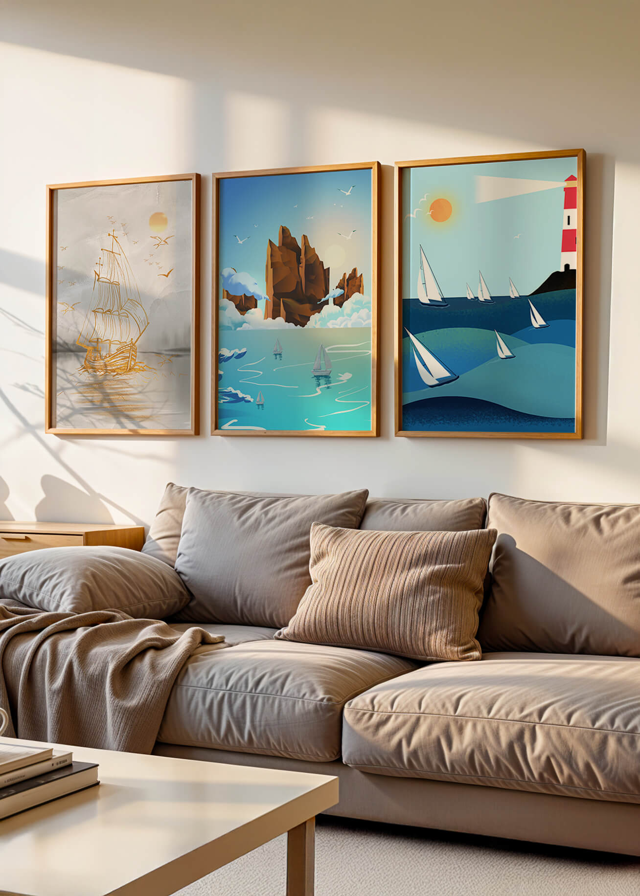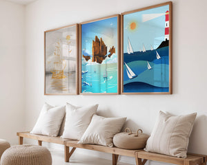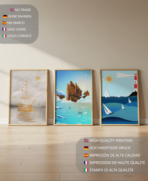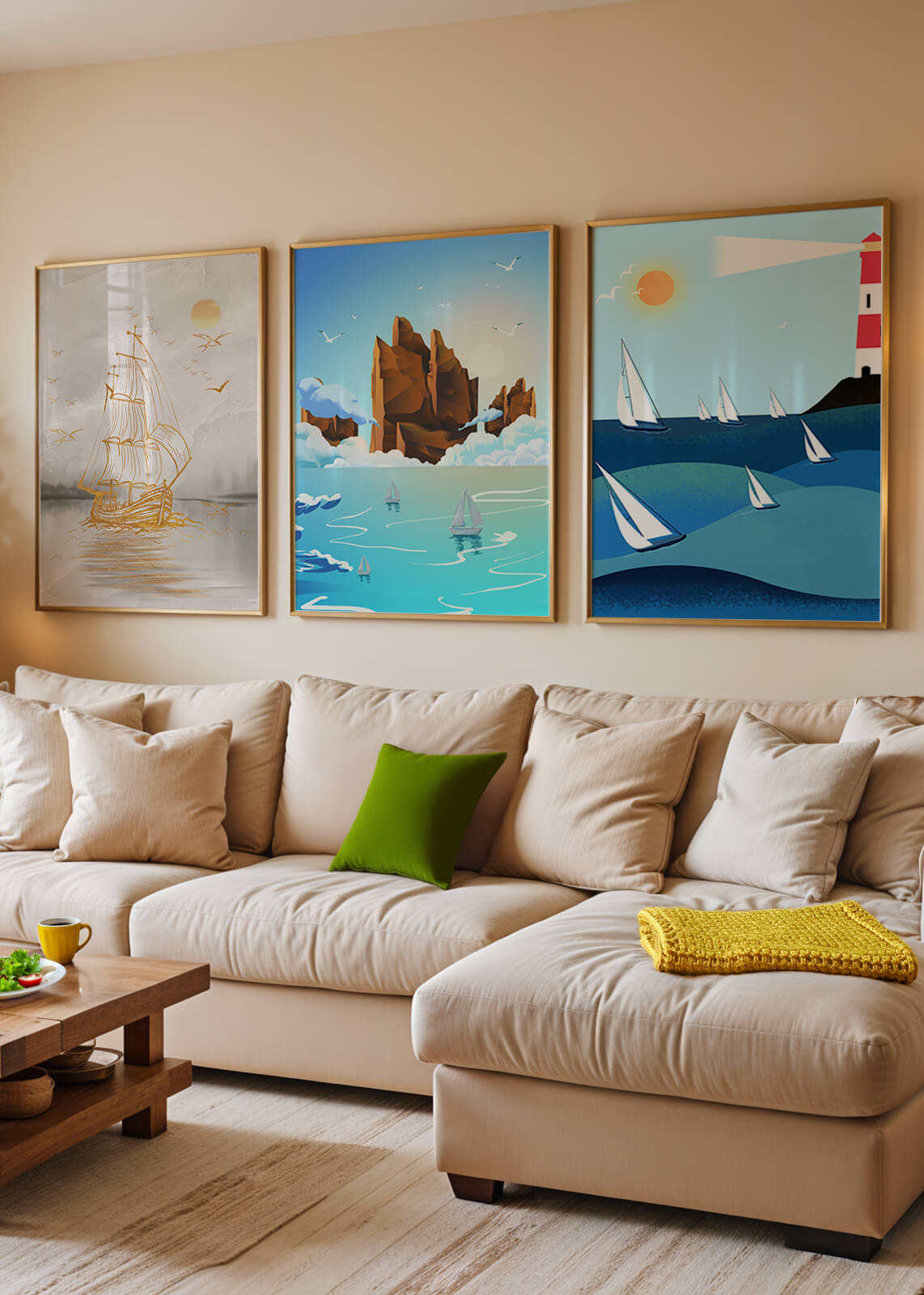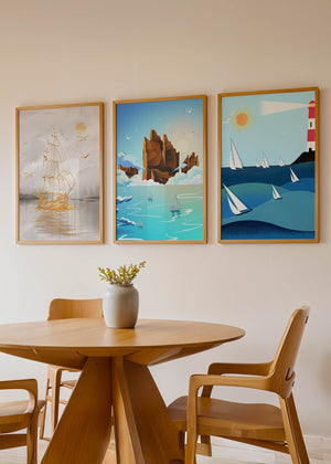 Este conjunto presenta tres imágenes distintas que capturan la esencia del océano. La primera imagen muestra un majestuoso barco con detalles dorados navegando en aguas tranquilas. La segunda imagen ofrece una vista vibrante de formaciones rocosas rodeadas por el mar, donde varios veleros navegan bajo un cielo azul despejado. La tercera imagen presenta un faro en un acantilado, guiando a los barcos que navegan en el mar al atardecer. Las ilustraciones están impresas con alta calidad, garantizando colores vivos y detalles nítidos. Estas piezas de arte náutico son ideales para decorar salones, oficinas o cualquier espacio que requiera un toque fresco y contemporáneo. La combinación de tonos azules y dorados añade un aire sofisticado y relajante, evocando la tranquilidad del océano.| Type |
