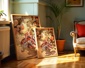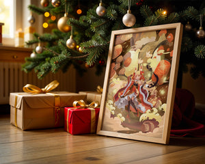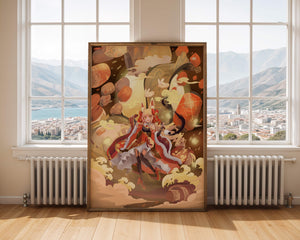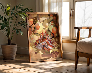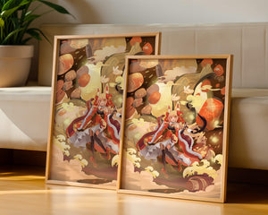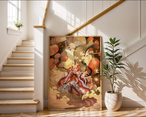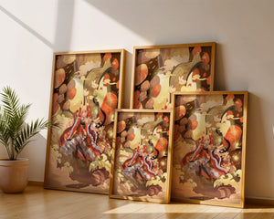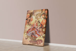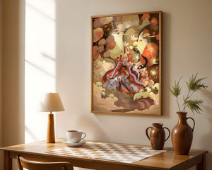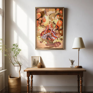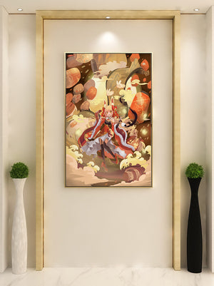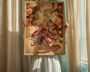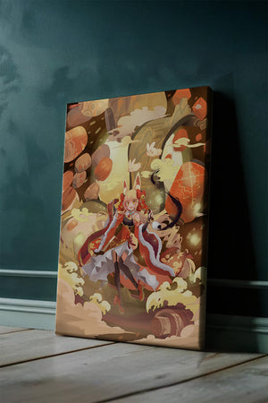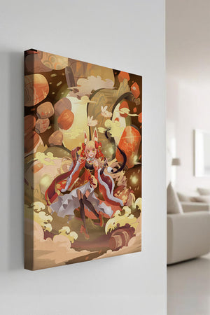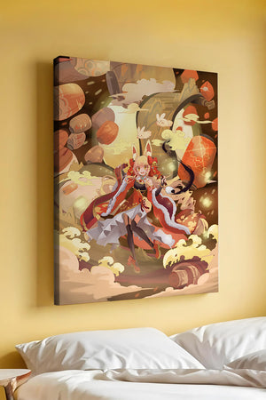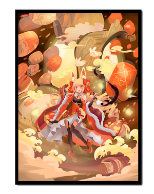 In dieser bezaubernden Szene steht eine bezaubernde Figur in wallendem Outfit inmitten einer surrealen Landschaft. Ihre Kleidung ist kunstvoll gestaltet und unterstreicht ihren lebendigen Ausdruck. Die Kulisse ist belebt durch schwebende Wolken, mystische Hasen und kunstvolle Laternen, die die magische Atmosphäre verstärken. Eine geschwungene Brücke und stilisierte Berge verstärken die Verspieltheit dieses magischen Reiches. In warmen Orange- und Gelbtönen getaucht, strahlt das Kunstwerk eine einladende, verspielte Atmosphäre aus. Die akribische Liebe zum Detail in der Kleidung der Figur und der Umgebung lässt den Betrachter in diese Fantasiewelt eintauchen und regt seine Fantasie an.| Typ |
