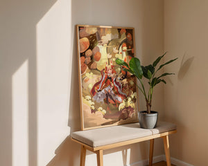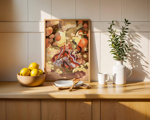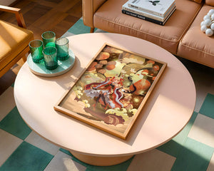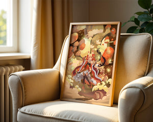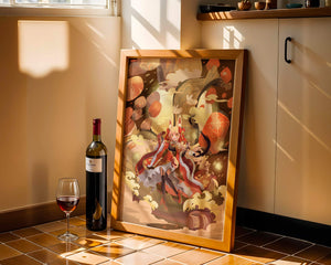 Eine lebendige und skurrile Fantasy-Szene mit einer Zeichentrickfigur, umgeben von lebendigen, fantasievollen Elementen. Das Kunstwerk strotzt vor Farbe und Charme und zeigt eine verzauberte Welt voller fantastischer Kreaturen.