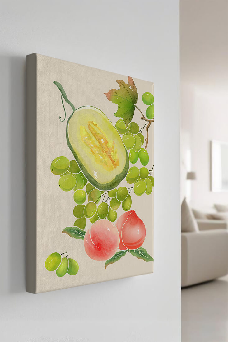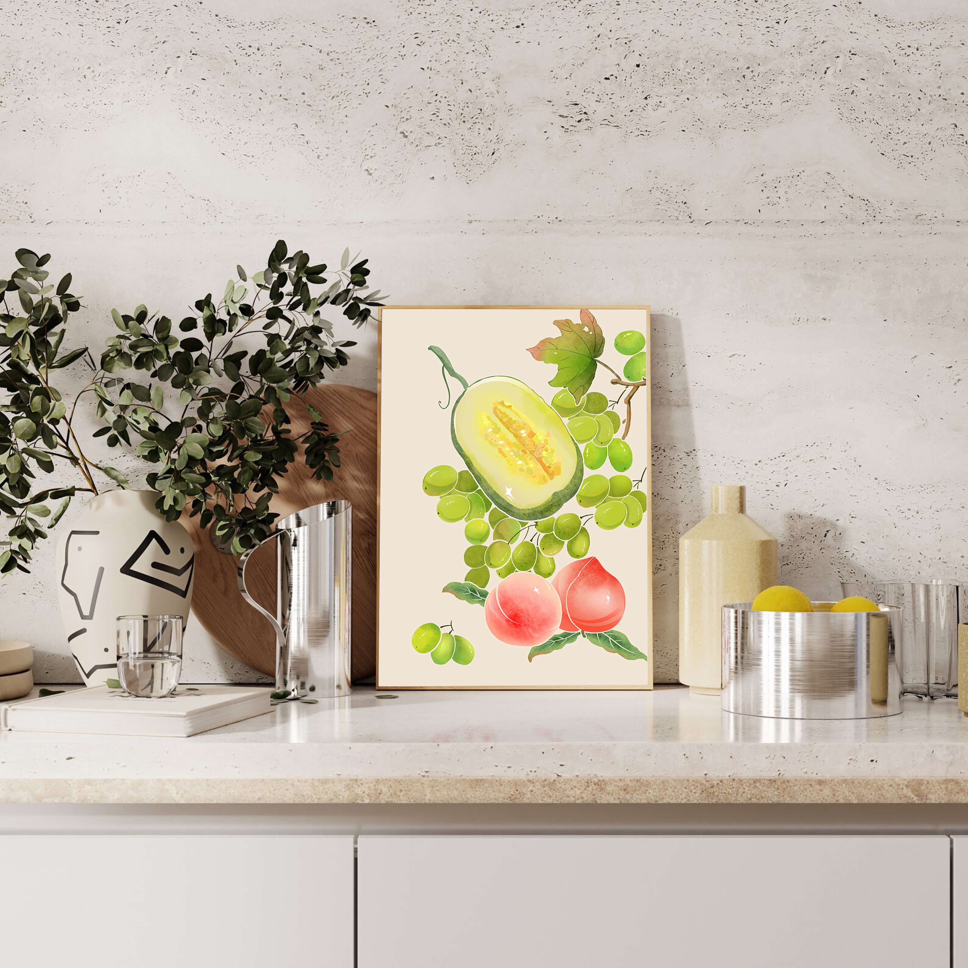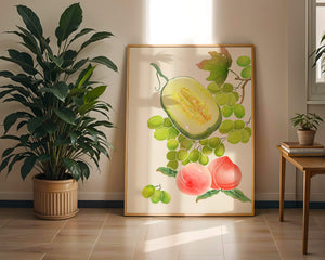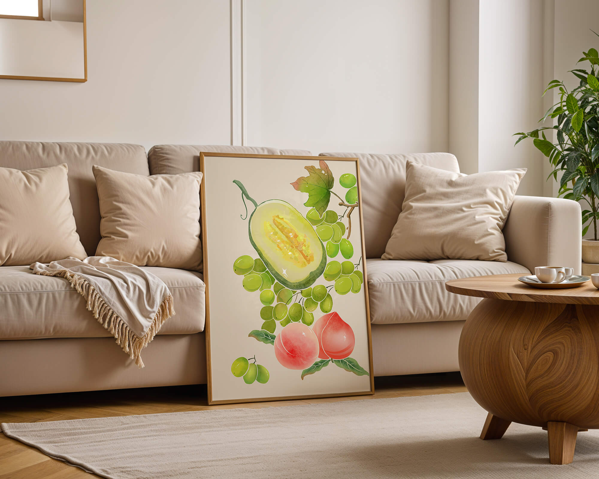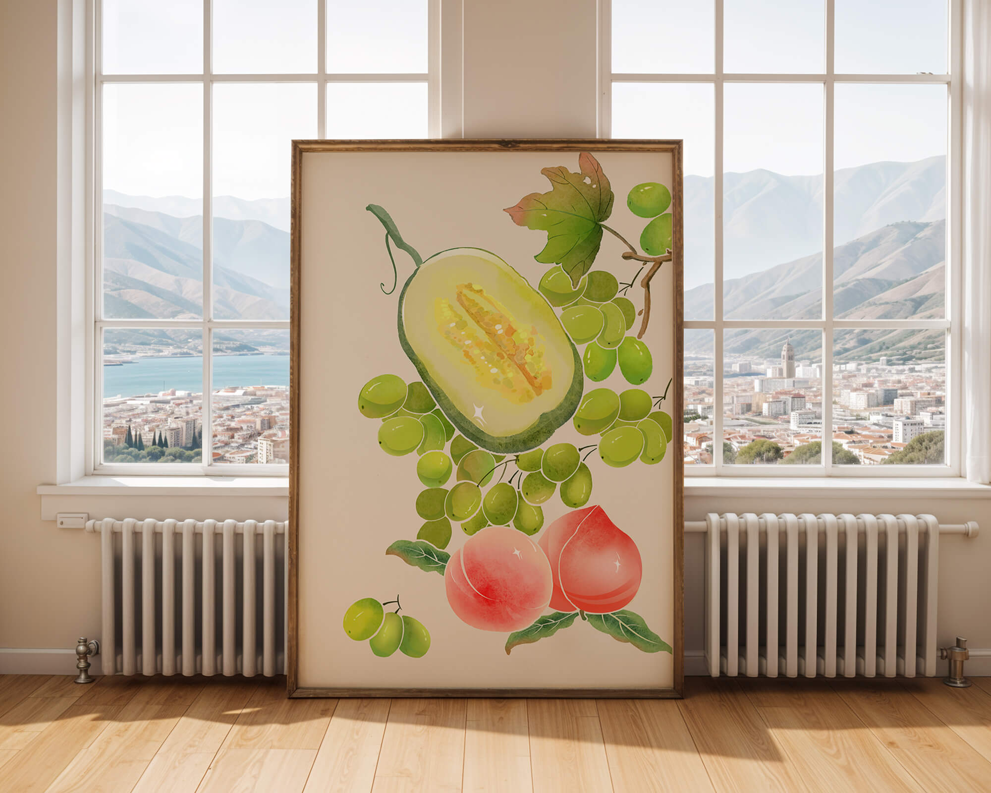 Diese fesselnde Illustration präsentiert eine Reihe leuchtender Früchte, darunter saftige Trauben, eine köstliche Melone und knallige Pfirsiche. Der Aquarellstil und die leuchtenden Farben verleihen dem Bild eine einladende und erfrischende Atmosphäre und machen es ideal für die Inneneinrichtung.
