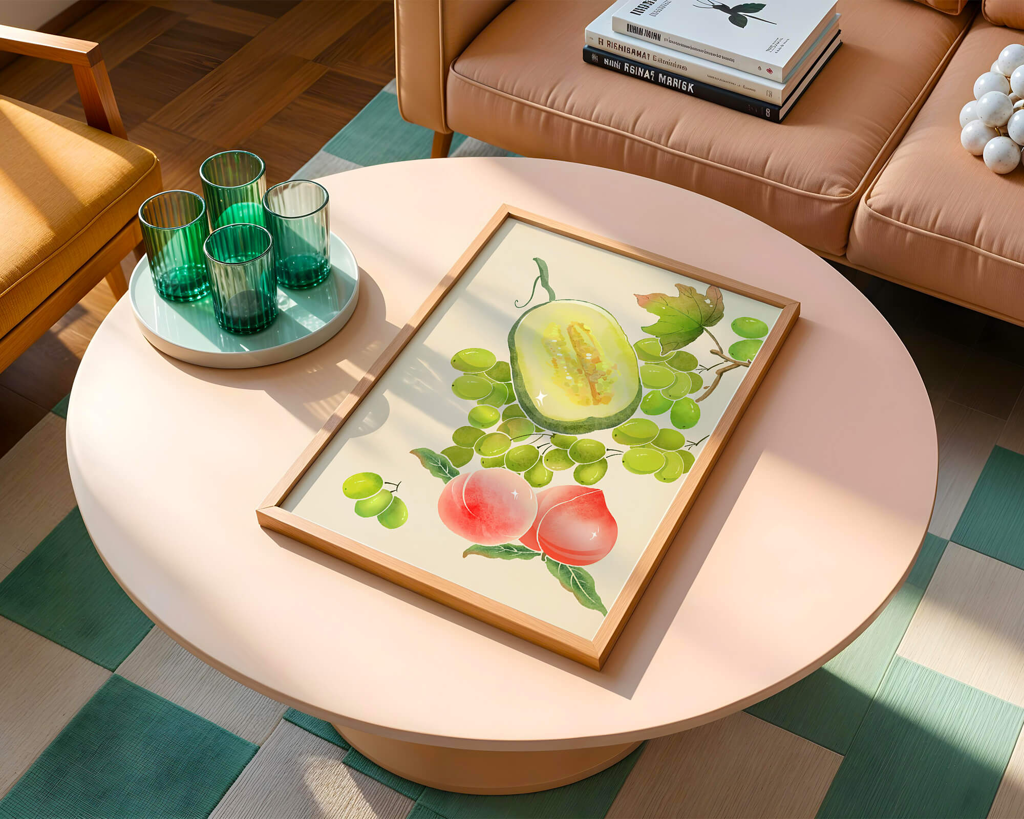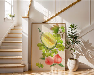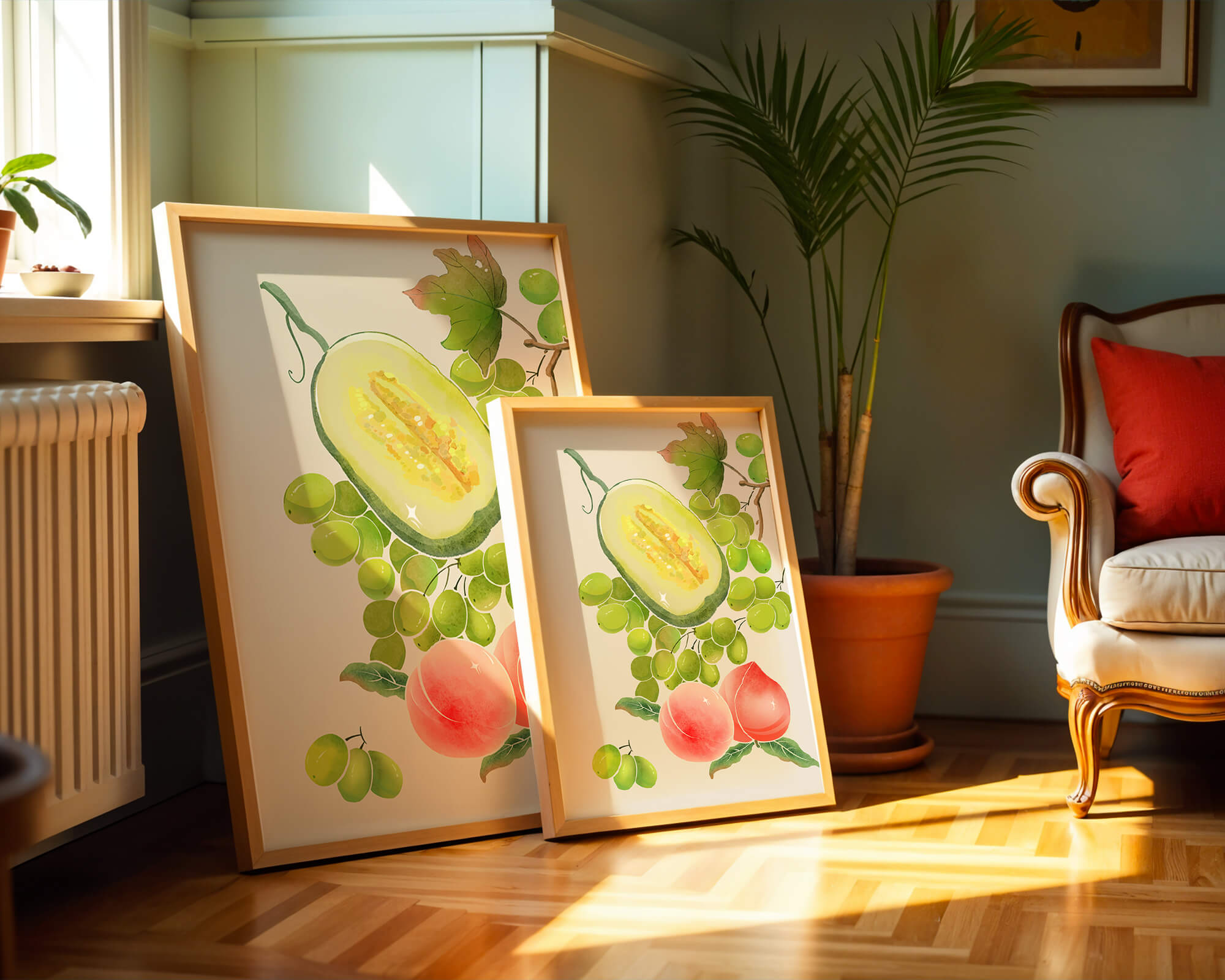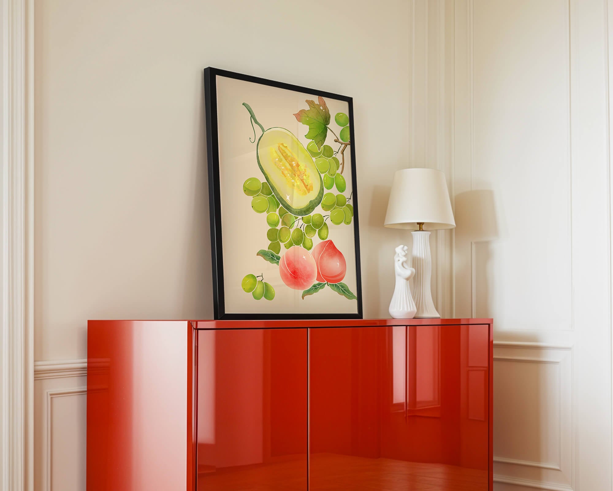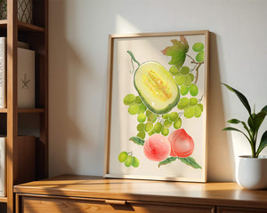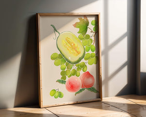 Diese fesselnde Illustration präsentiert eine Reihe leuchtender Früchte, darunter saftige Trauben, eine köstliche Melone und knallige Pfirsiche. Der Aquarellstil und die leuchtenden Farben verleihen dem Bild eine einladende und erfrischende Atmosphäre und machen es ideal für die Inneneinrichtung.