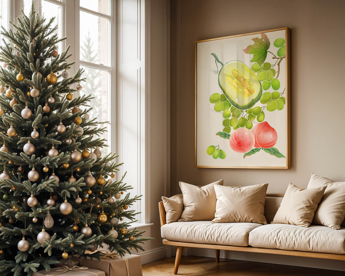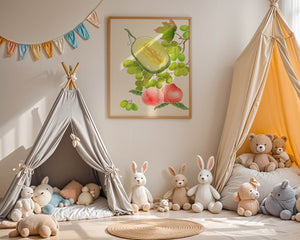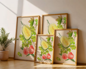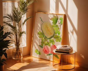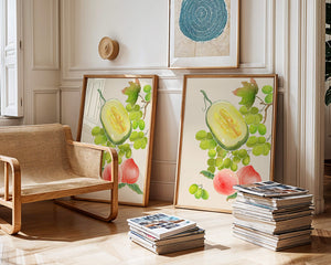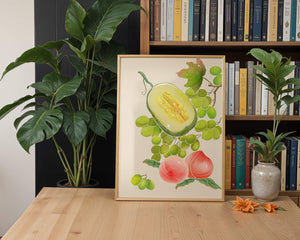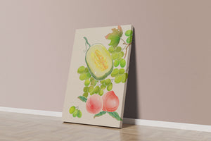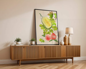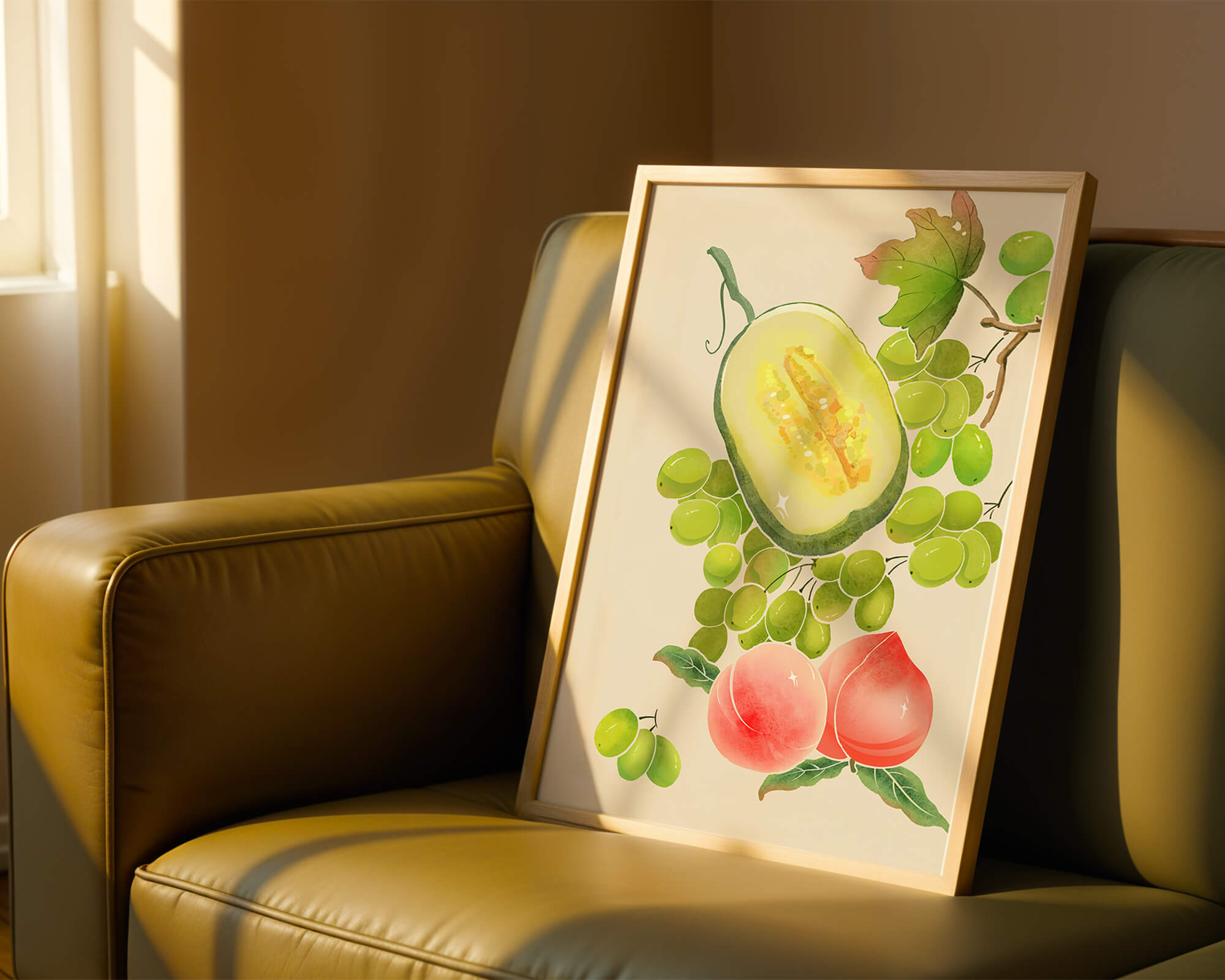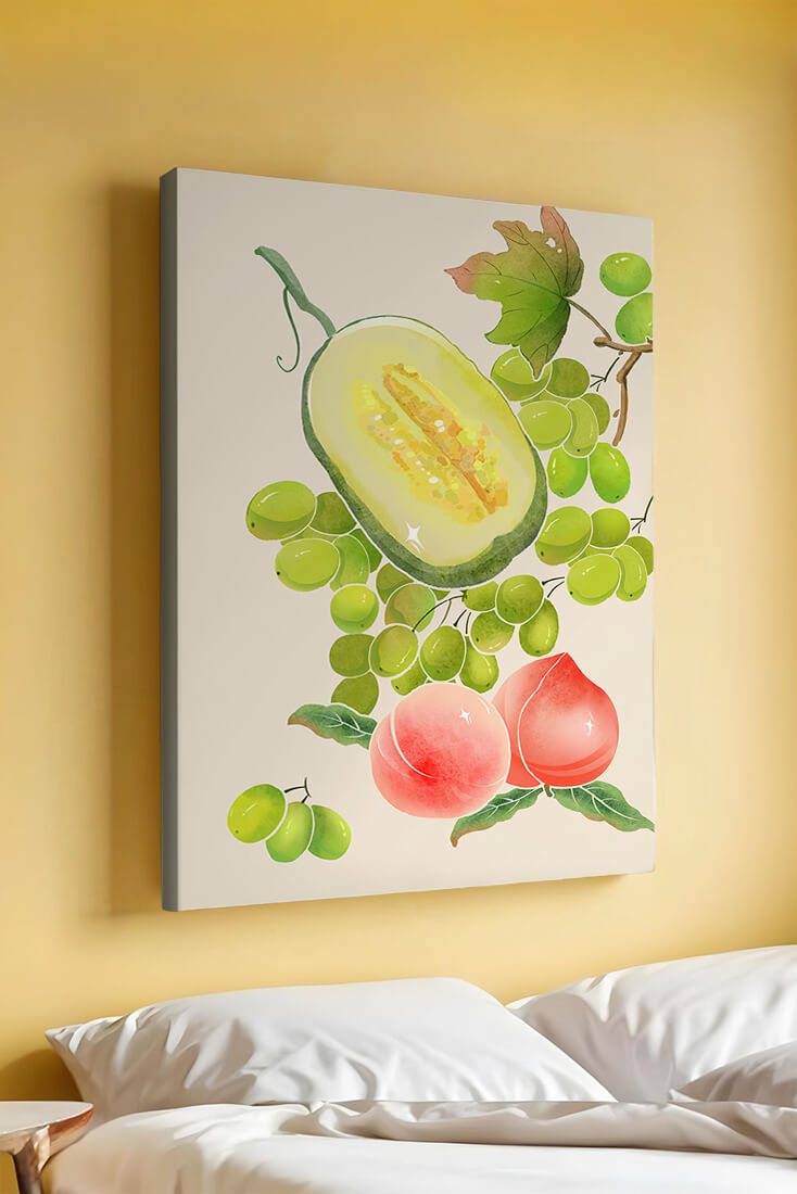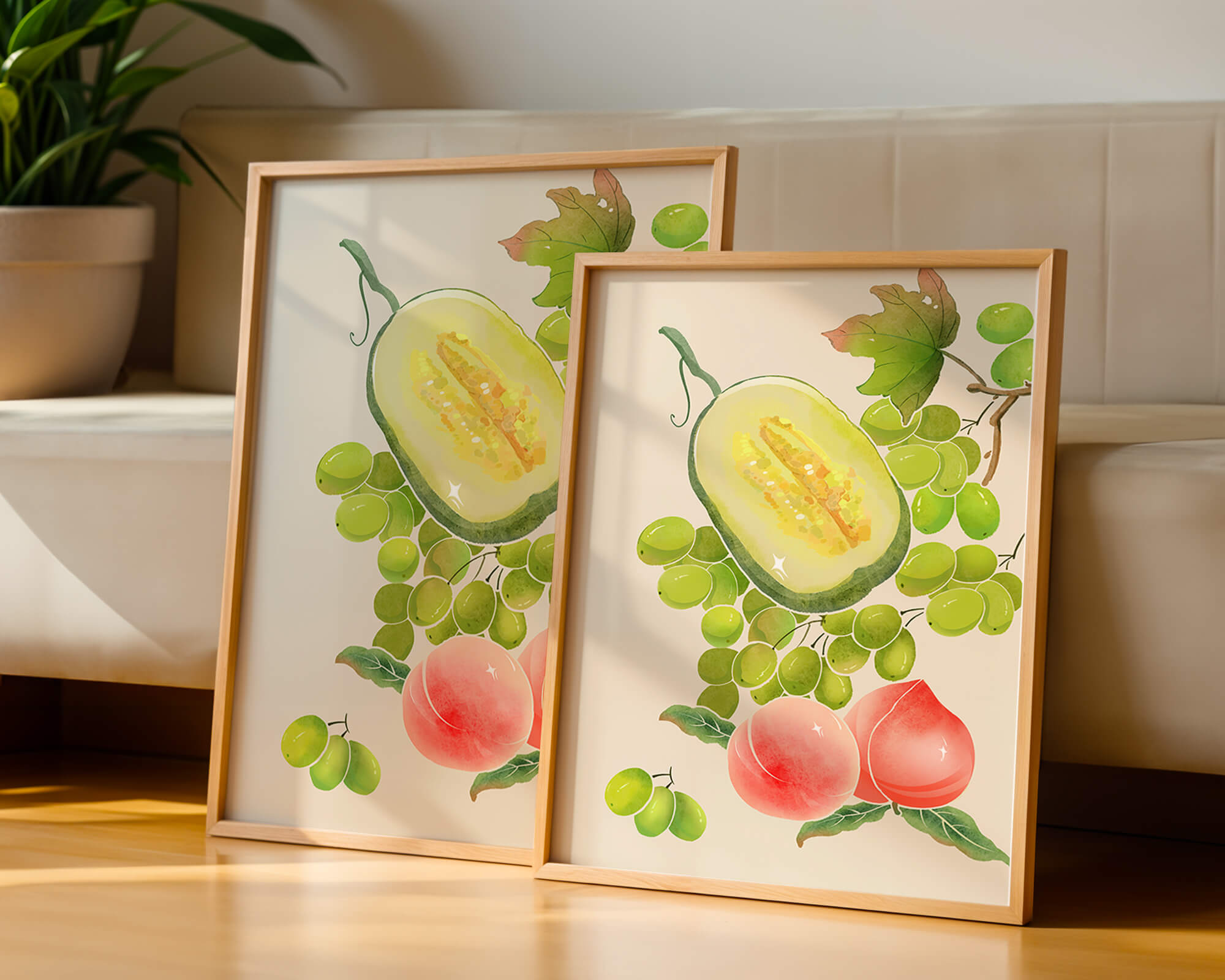 Diese fesselnde Illustration präsentiert eine Reihe leuchtender Früchte, darunter saftige Trauben, eine köstliche Melone und knallige Pfirsiche. Der Aquarellstil und die leuchtenden Farben verleihen dem Bild eine einladende und erfrischende Atmosphäre und machen es ideal für die Inneneinrichtung.