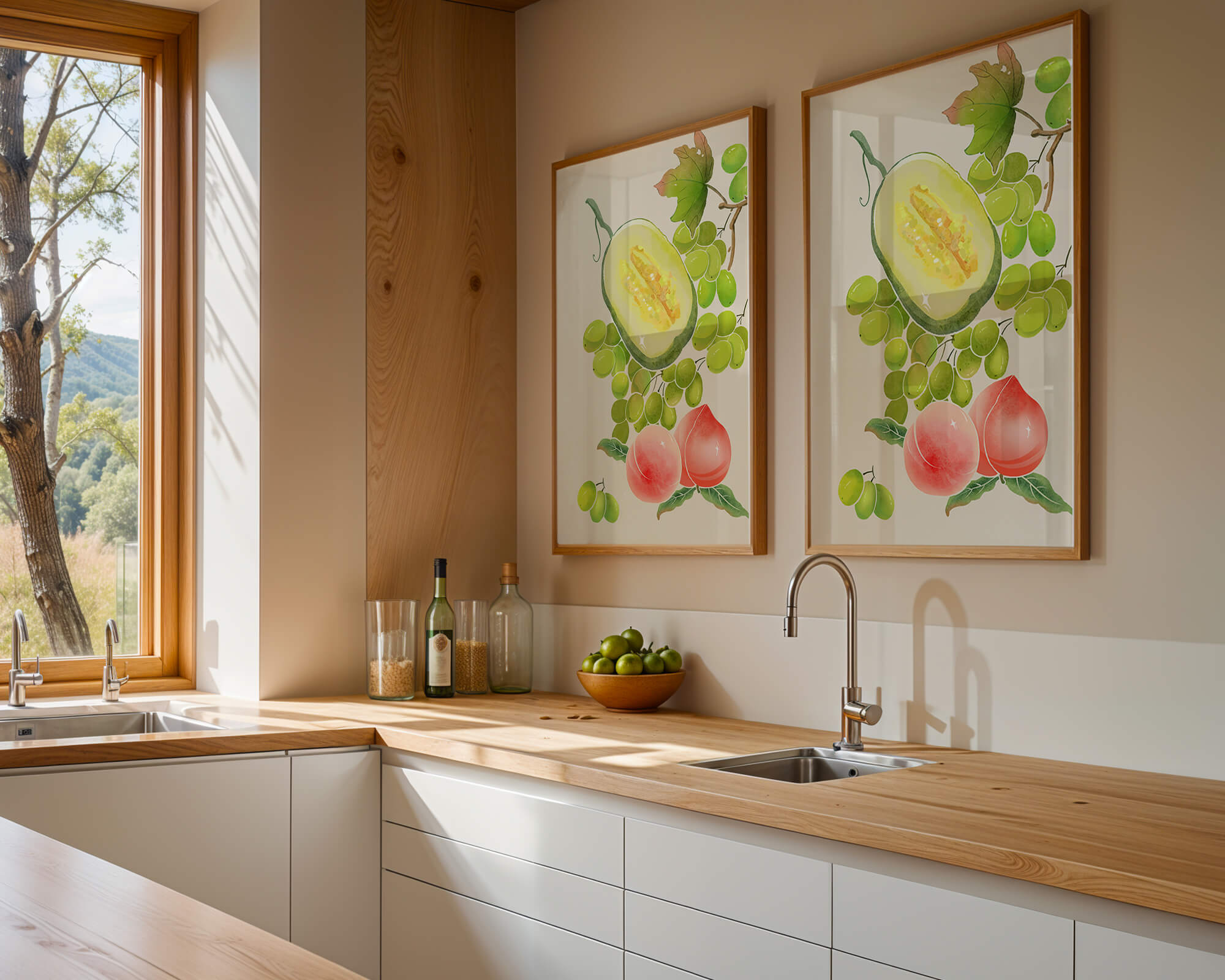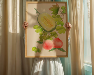 Die Komposition aus grünen Trauben, verwoben mit Melonenscheiben und reifen Pfirsichen, fängt die Essenz eines üppigen Gartens ein. Die harmonische Mischung aus Grün-, Gelb- und Rosatönen vor hellbeigem Hintergrund unterstreicht die Frische und den Reiz der Früchte. Jedes Element ist detailreich gezeichnet und zeigt realistische Texturen und subtile Schattierungen, die dem Werk Tiefe und Leben verleihen. Perfekt für Küche oder Essbereich, schafft dieses Kunstwerk eine warme und einladende Atmosphäre. Die natürliche Eleganz der Früchte, kombiniert mit ihren lebendigen Farben, steigert die Ästhetik jedes Raumes und macht es zu einer vielseitigen und reizvollen Wahl für jede Kunstsammlung.| Typ |