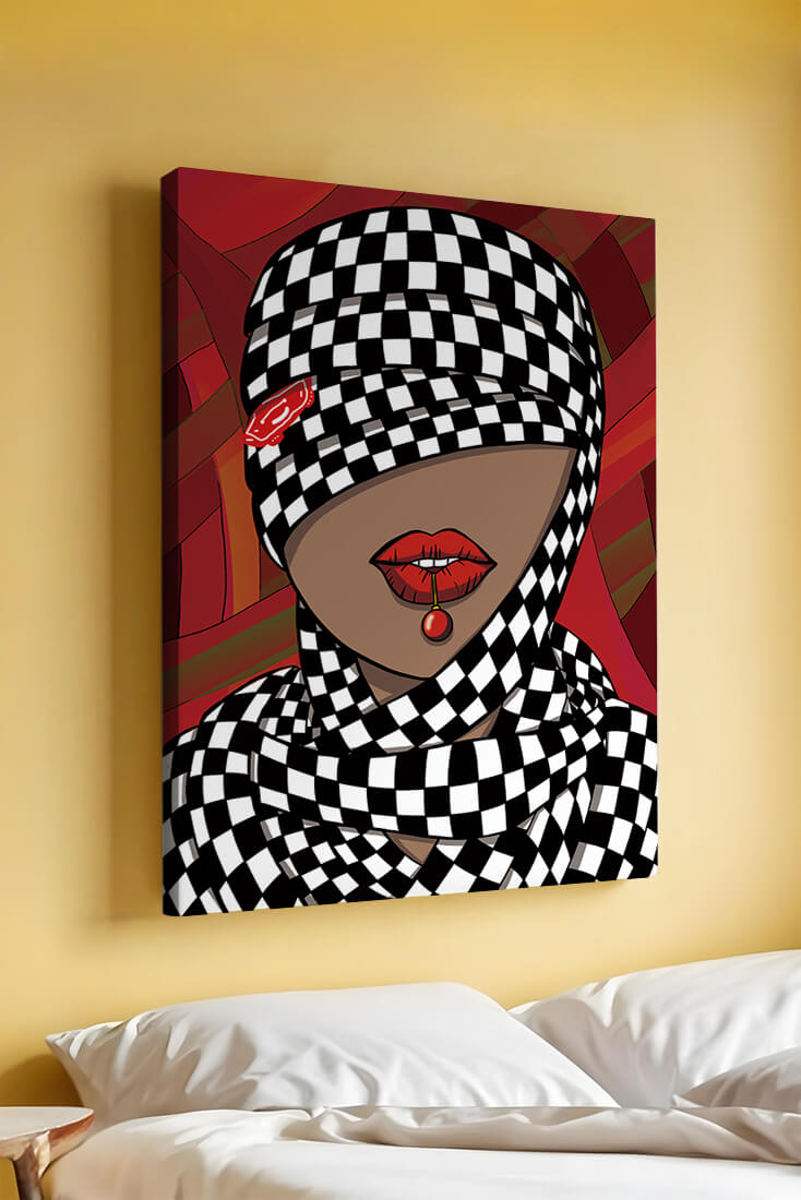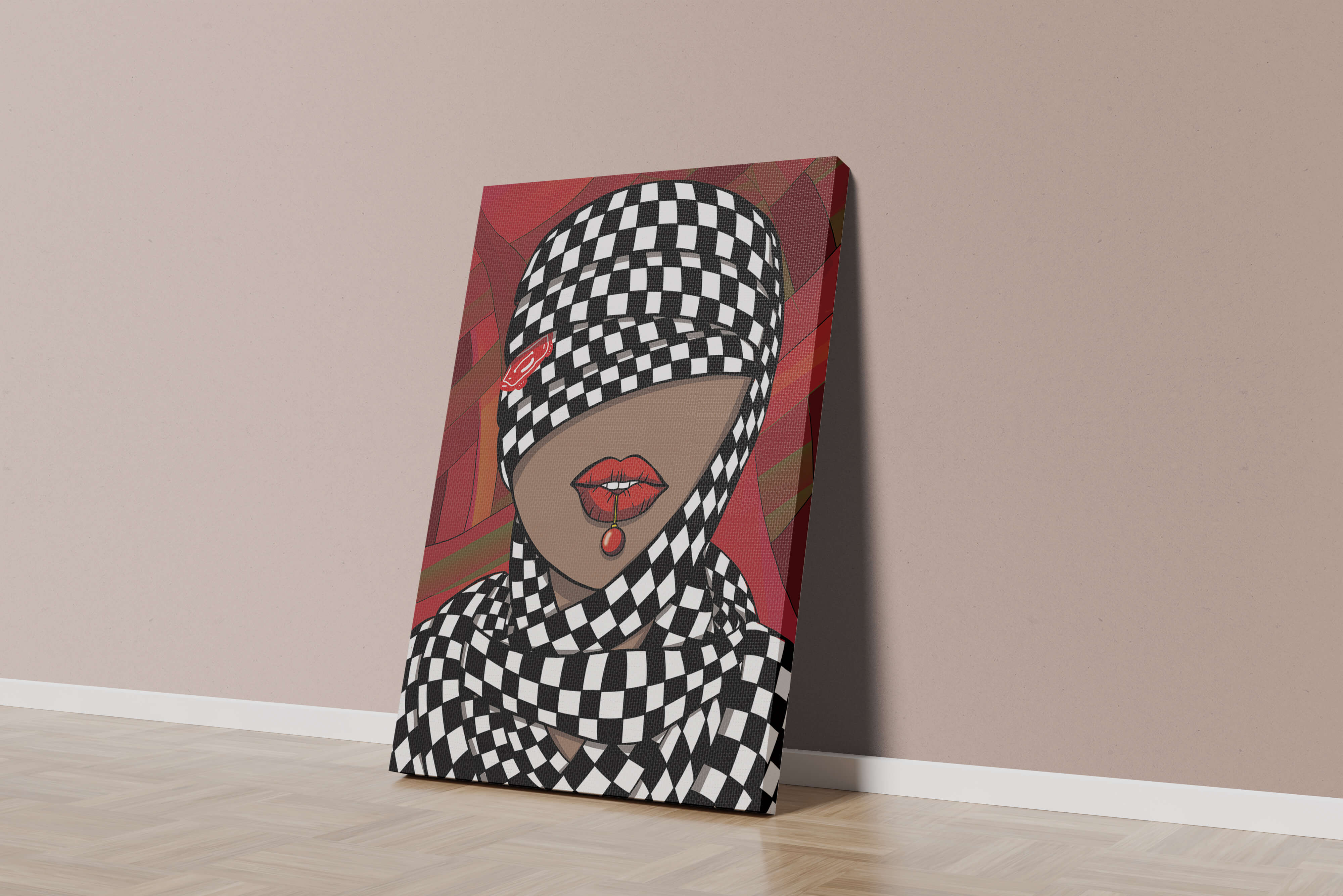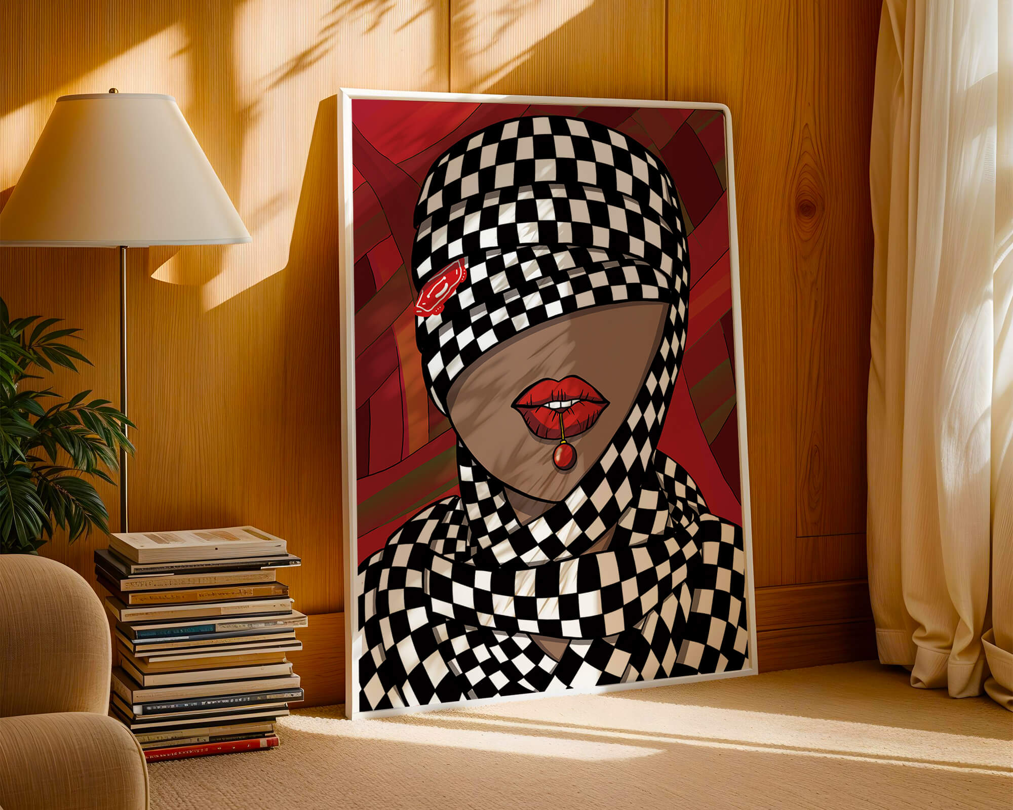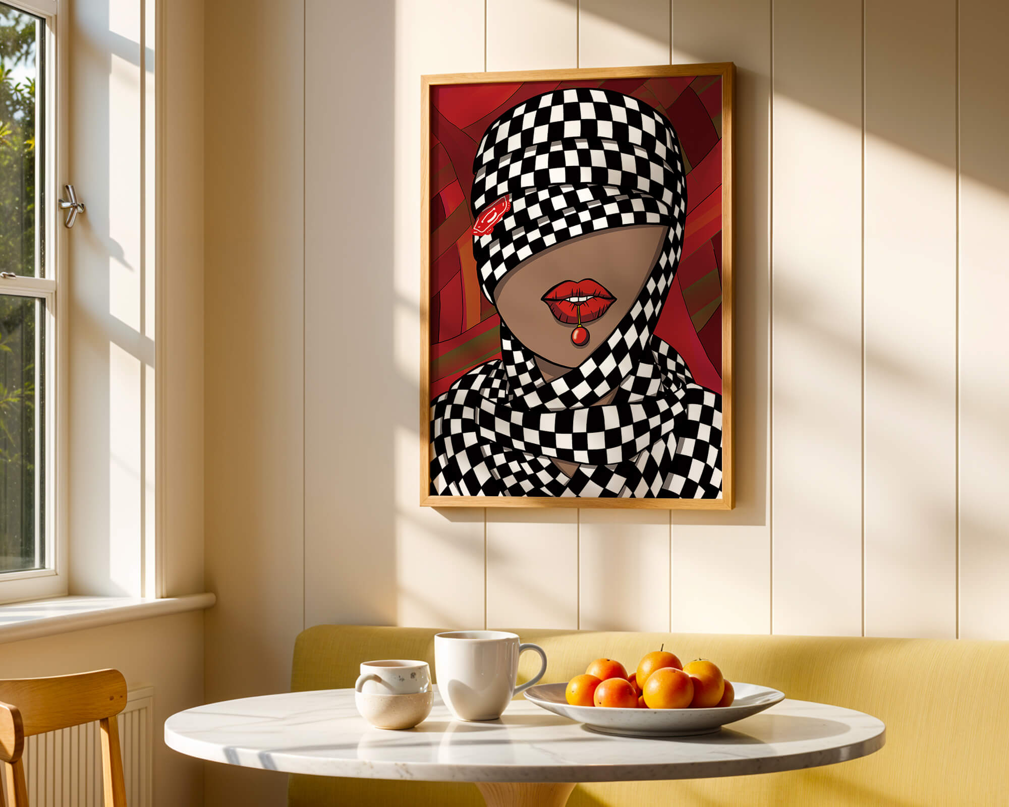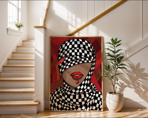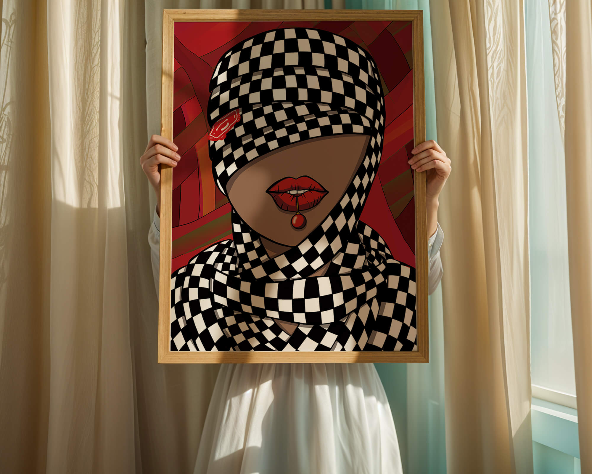 Esta cautivadora obra de arte presenta el rostro de una mujer parcialmente oculto por un patrón de cuadros, creando una sensación de misterio e intriga. El uso de blanco y negro contrasta fuertemente con el fondo rojo vivo y sus vibrantes labios rojos, añadiendo un toque dinámico y moderno.