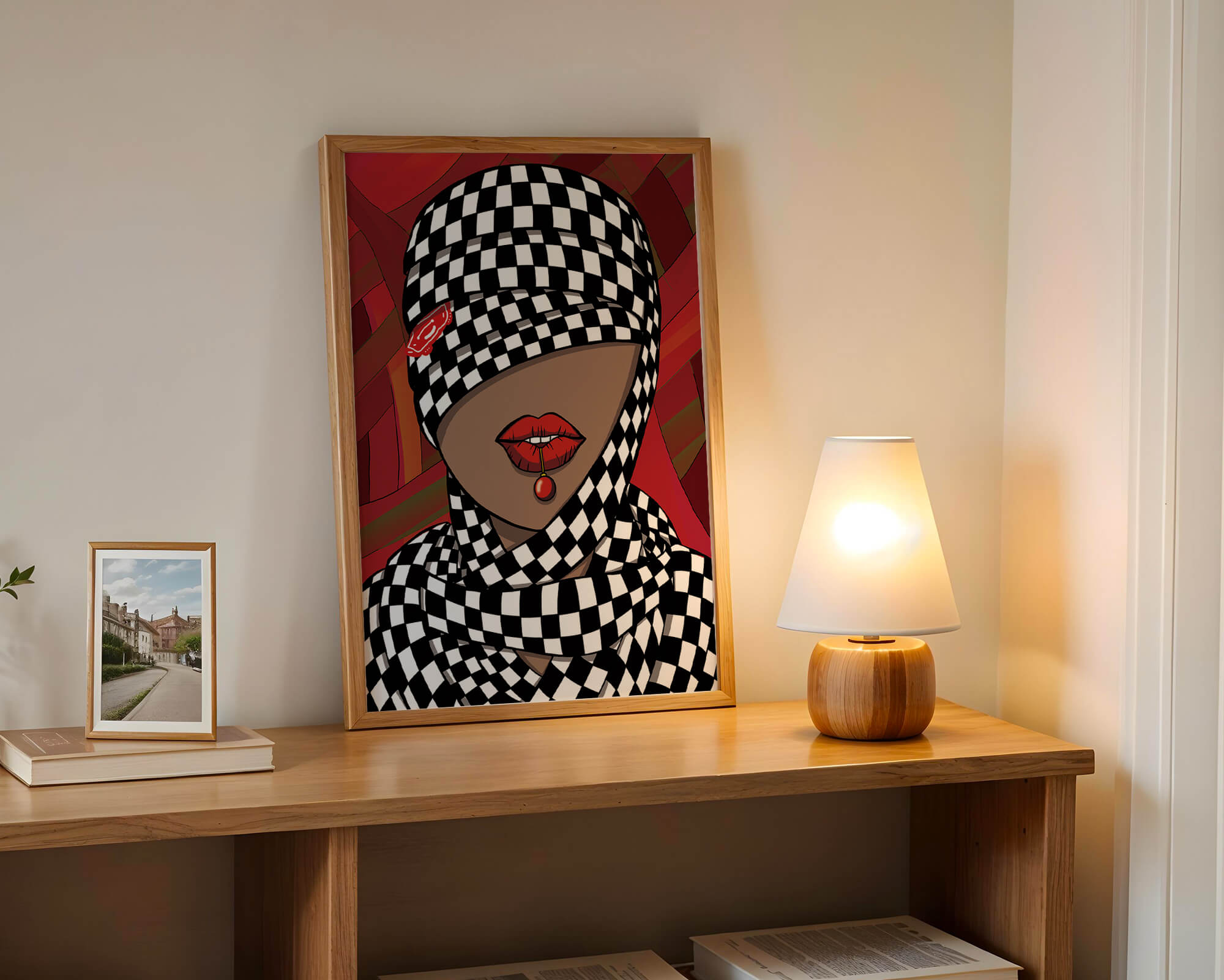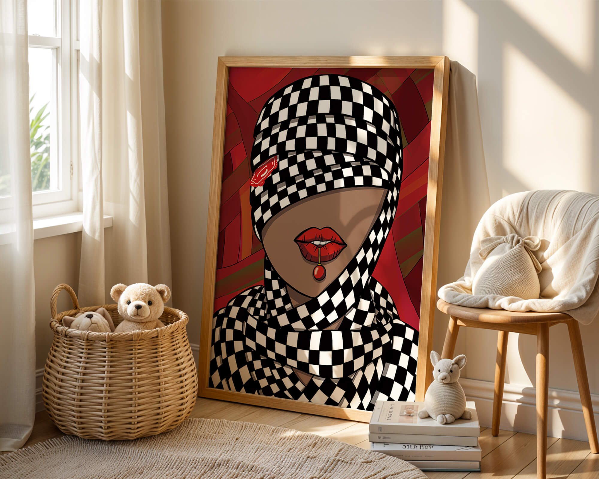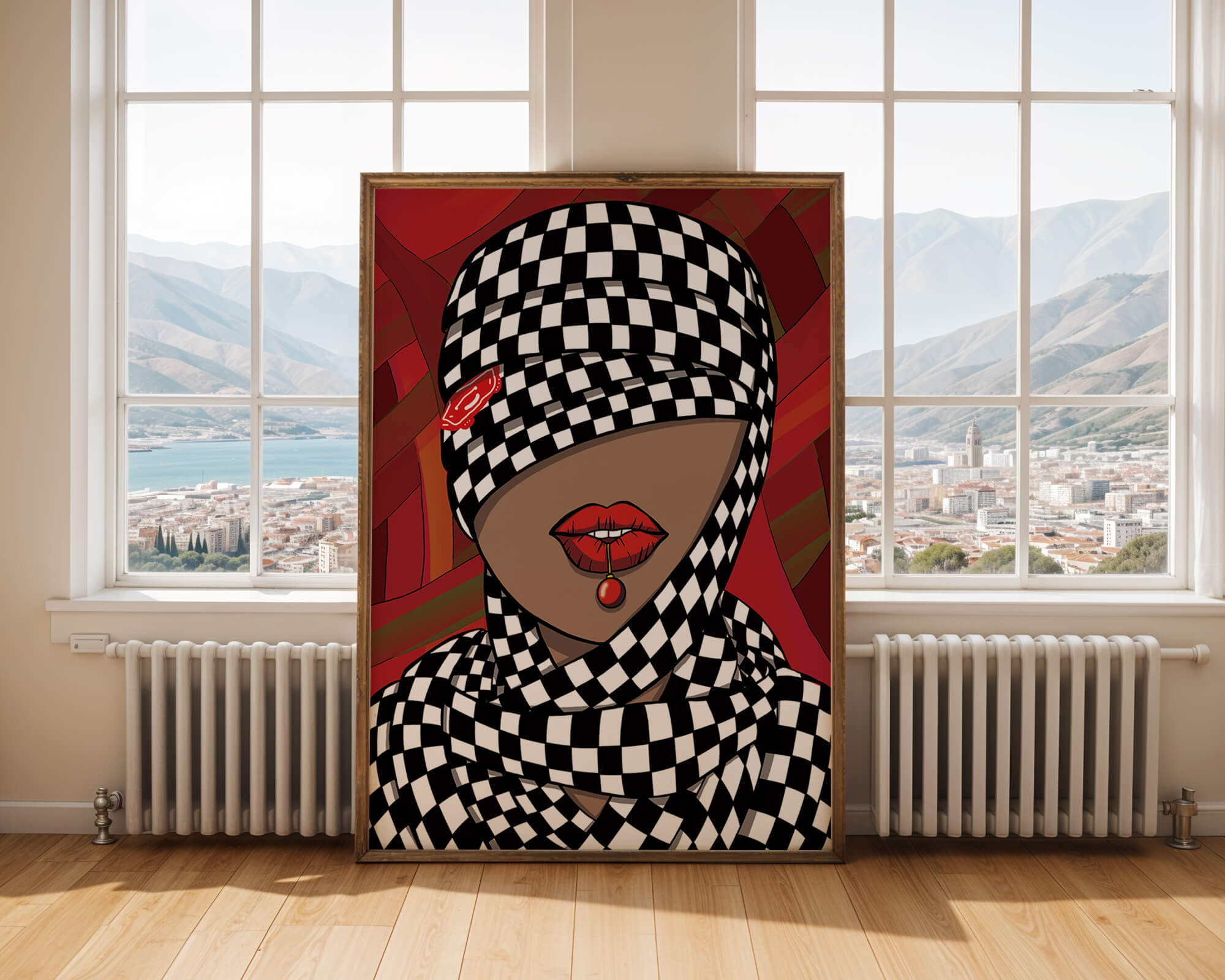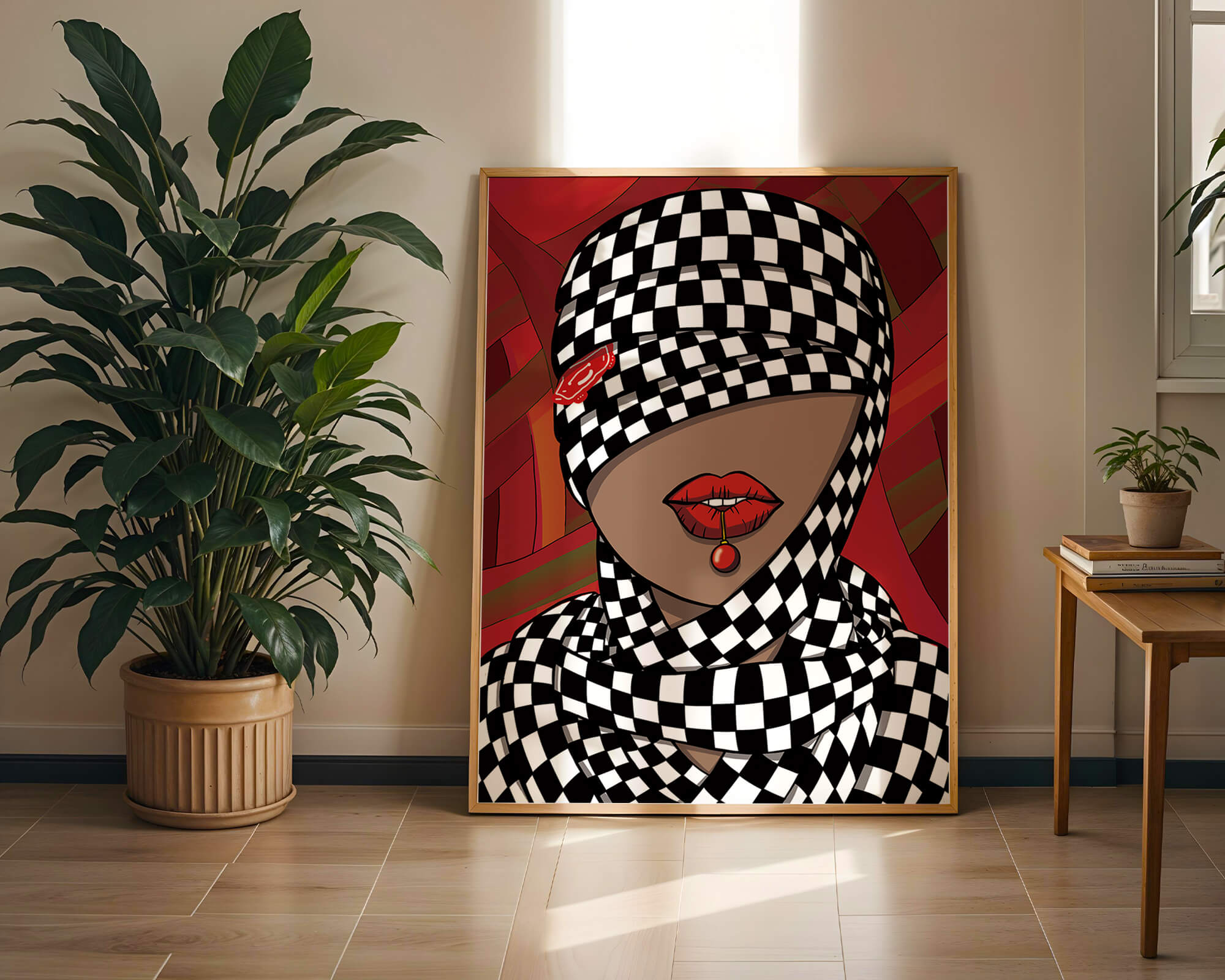 Esta cautivadora obra de arte presenta el rostro de una mujer parcialmente oculto por un patrón de cuadros, creando una sensación de misterio e intriga. El uso de blanco y negro contrasta fuertemente con el fondo rojo vivo y sus vibrantes labios rojos, añadiendo un toque dinámico y moderno.
