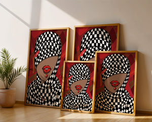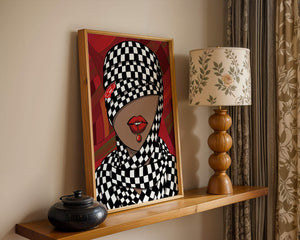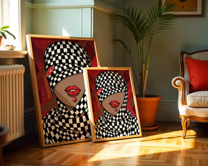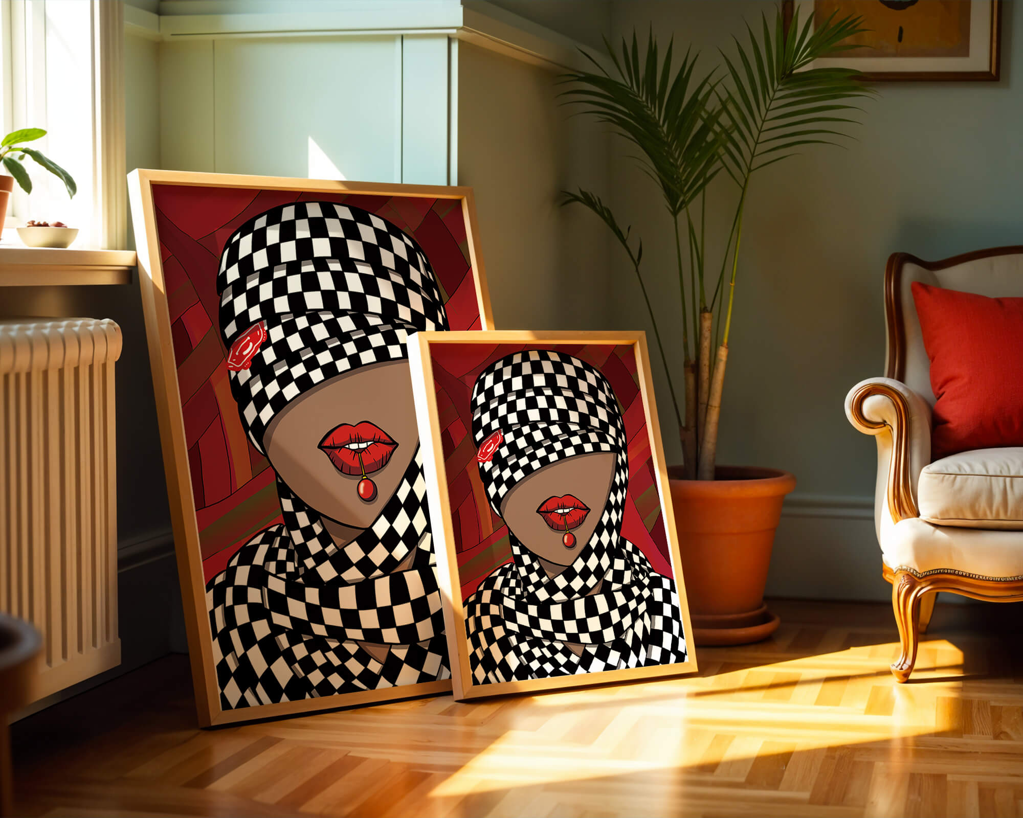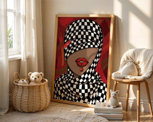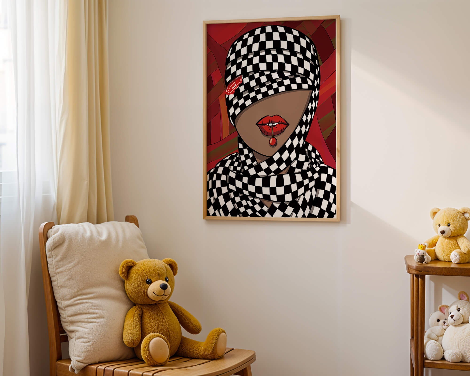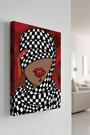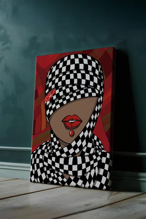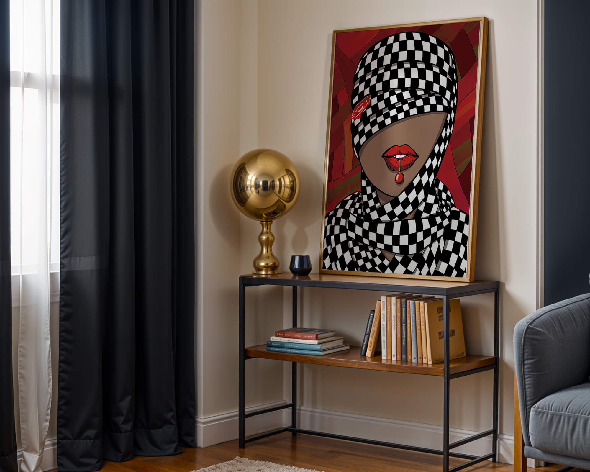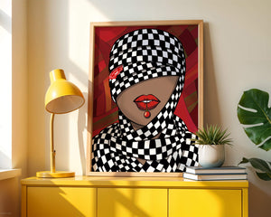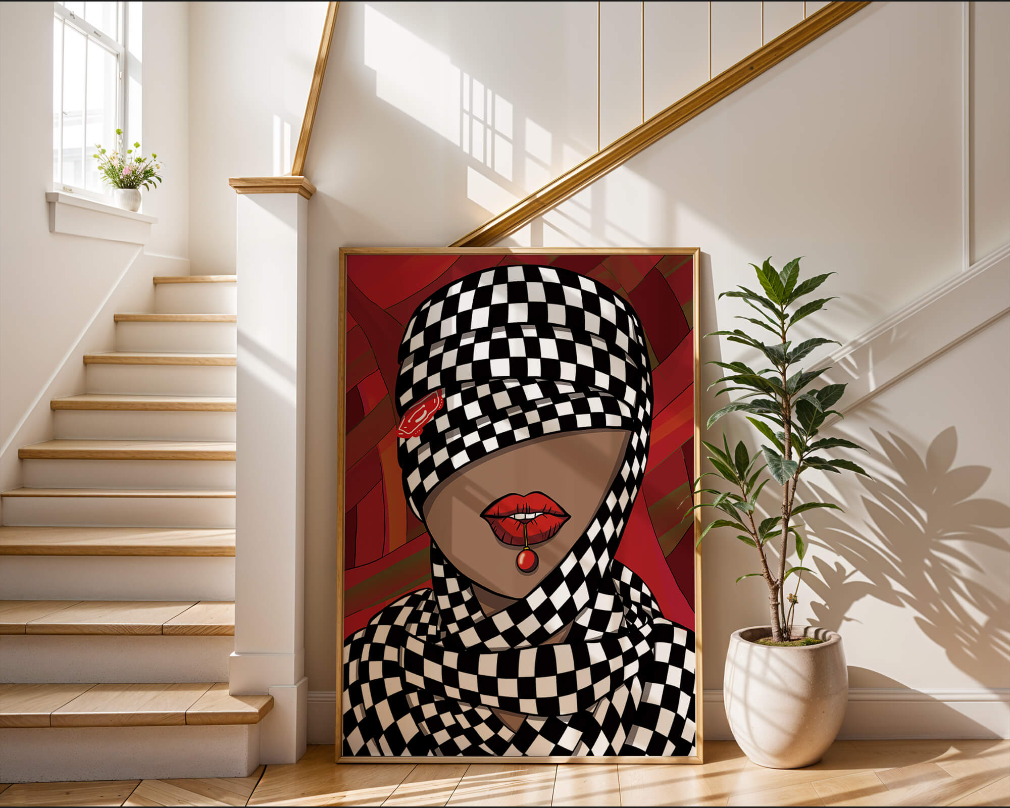 Esta cautivadora obra de arte presenta el rostro de una mujer parcialmente oculto por un patrón de cuadros, creando una sensación de misterio e intriga. El uso de blanco y negro contrasta fuertemente con el fondo rojo vivo y sus vibrantes labios rojos, añadiendo un toque dinámico y moderno.