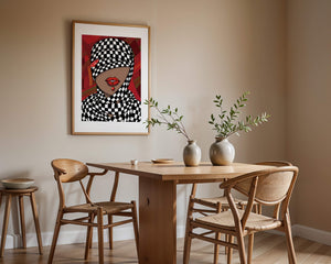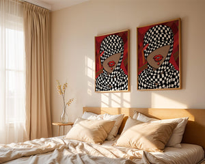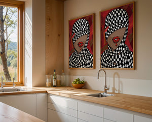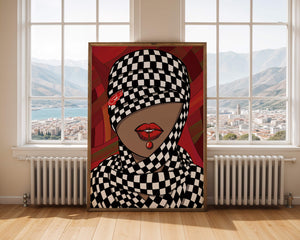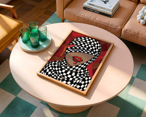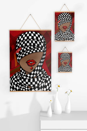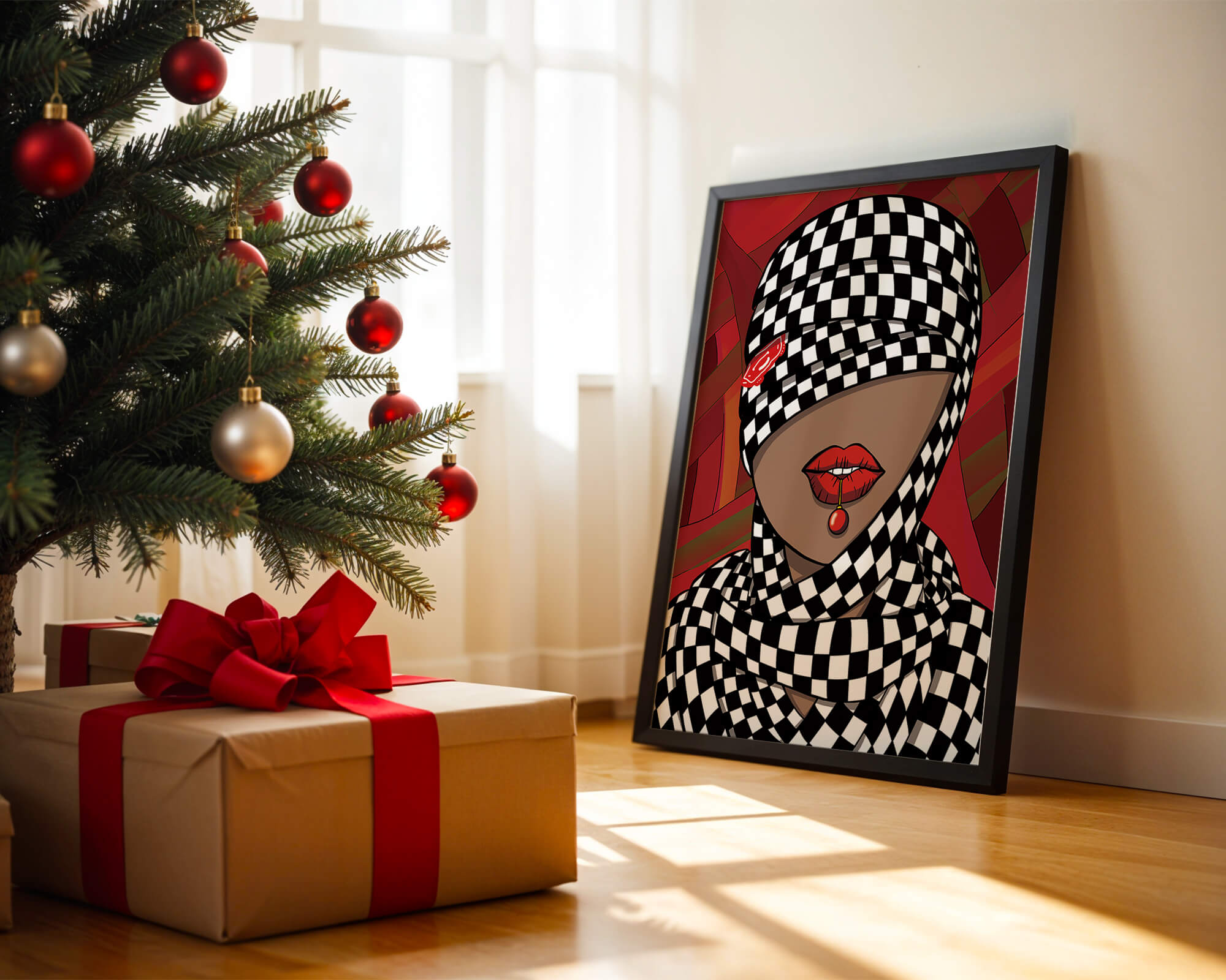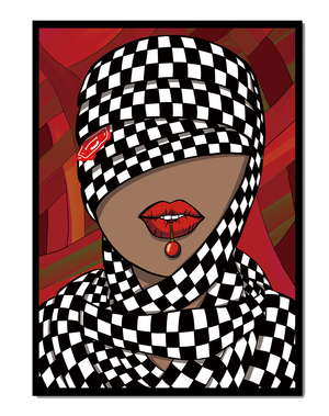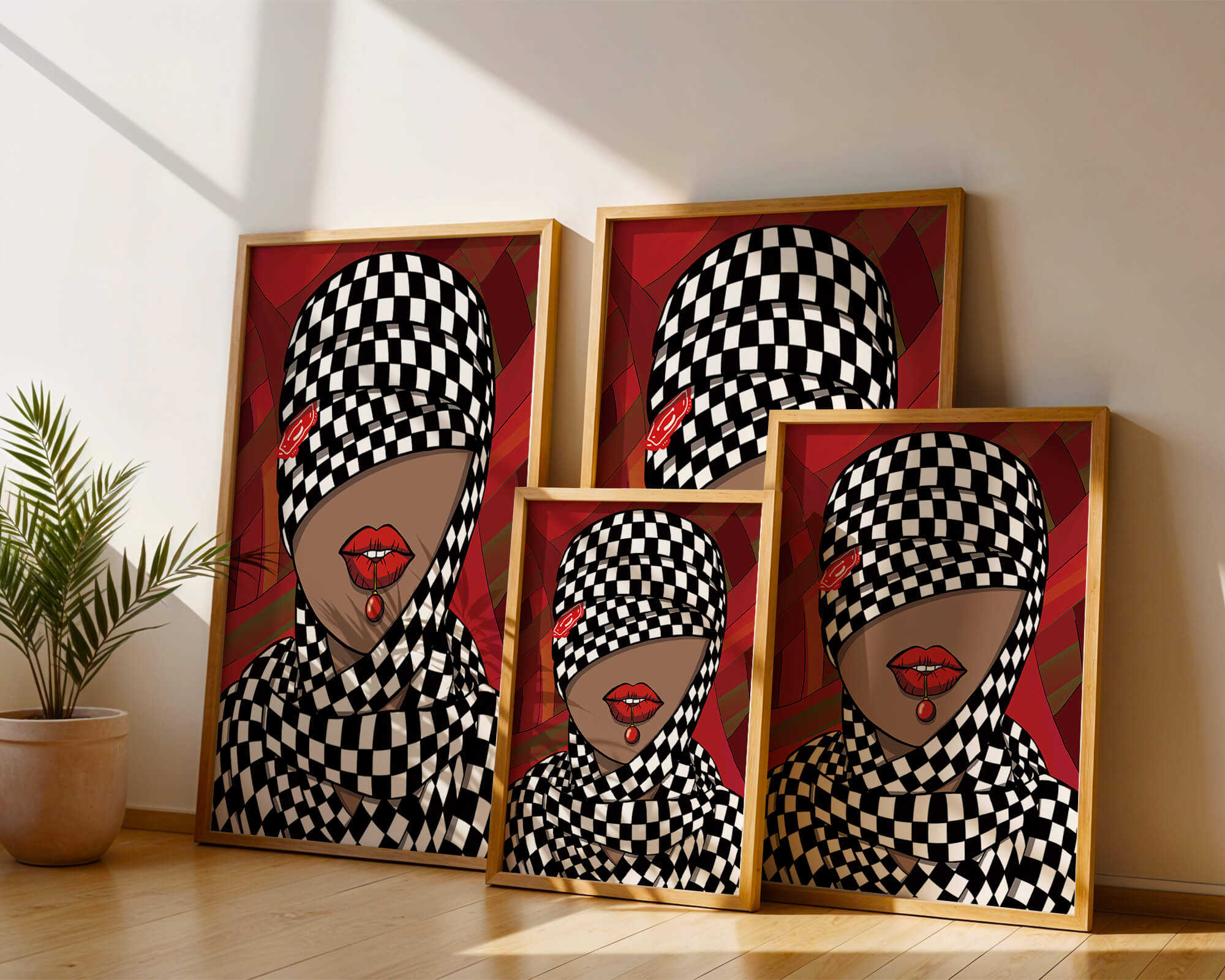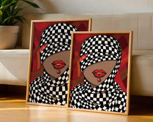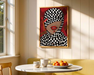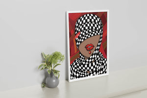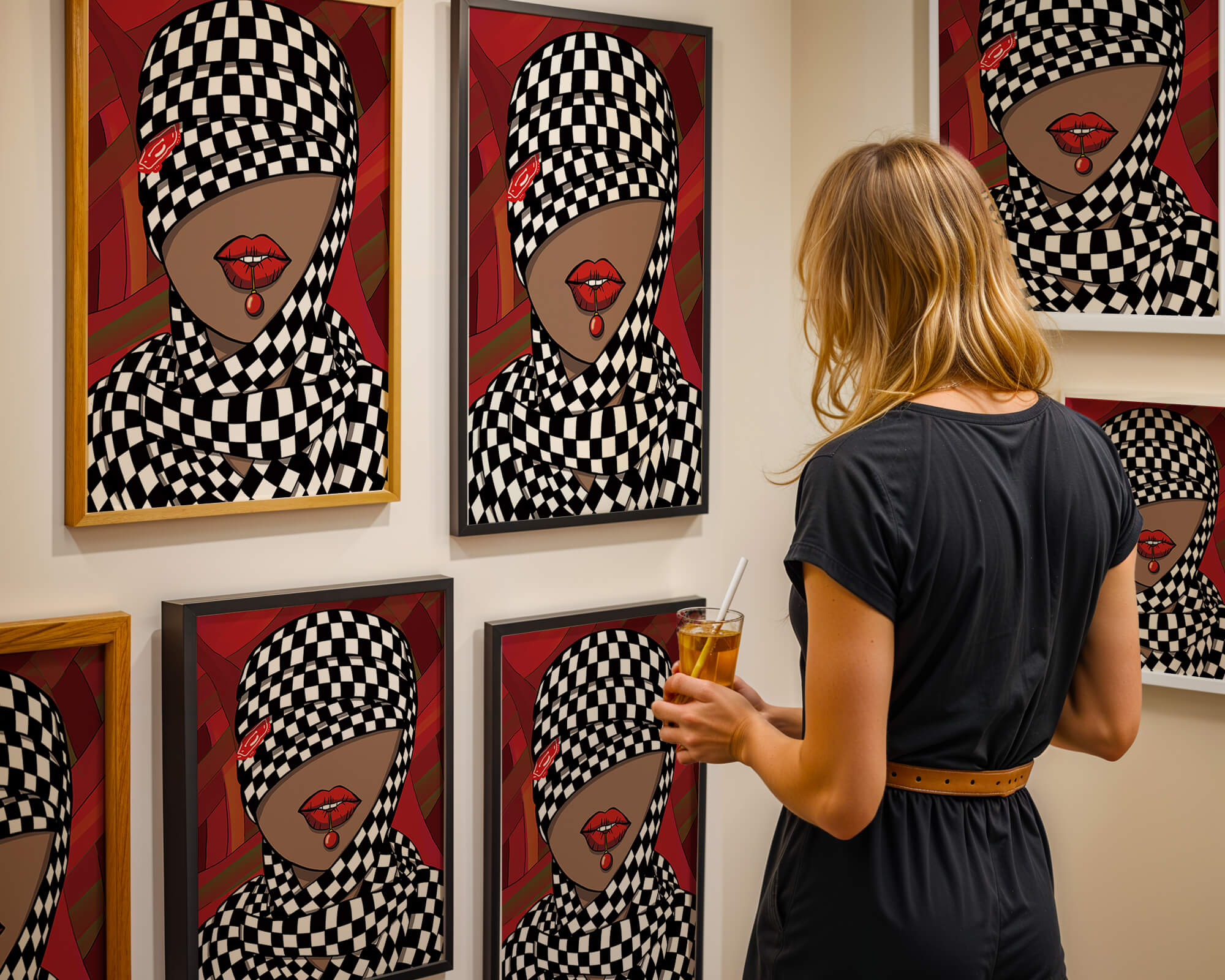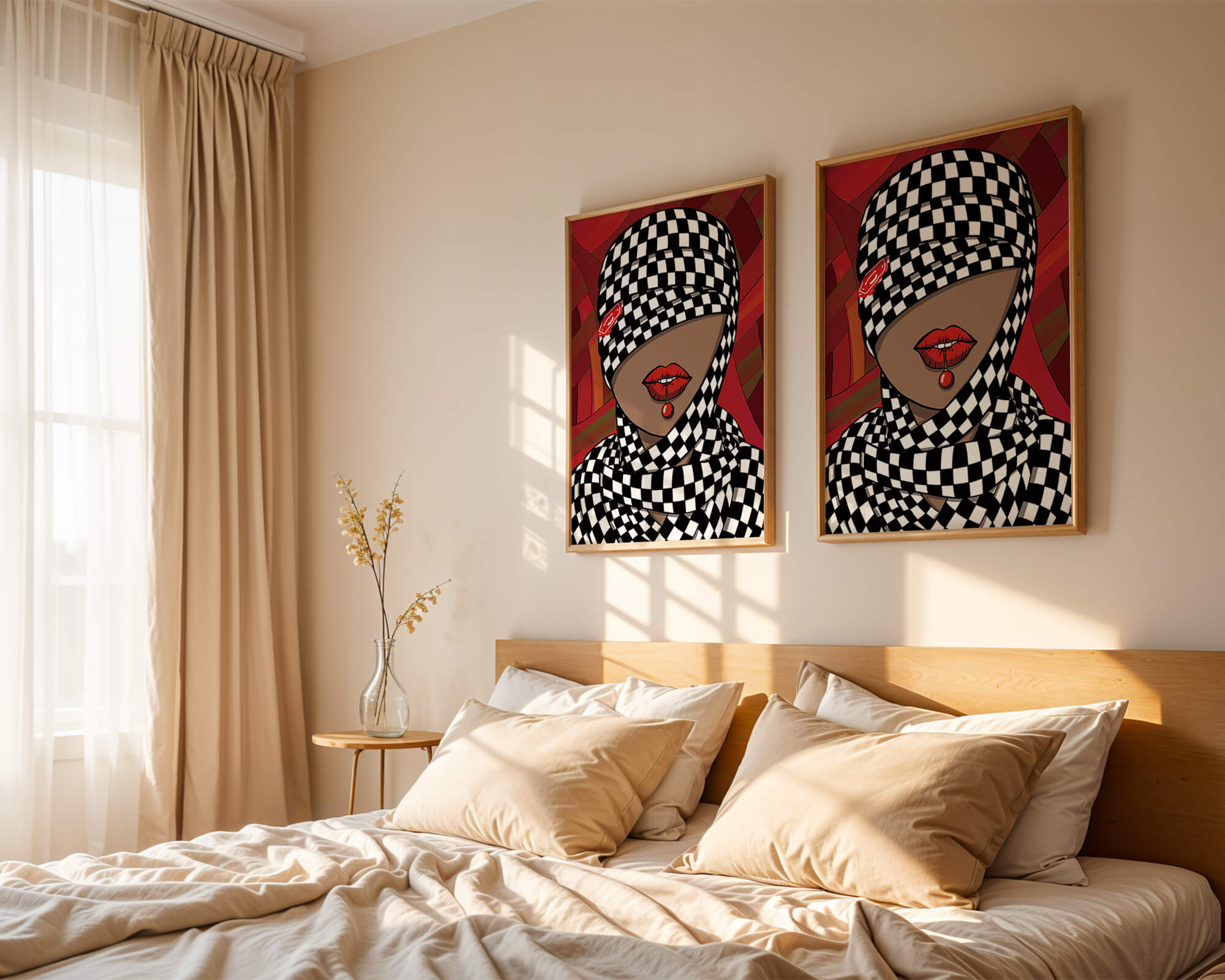 Esta cautivadora obra de arte presenta el rostro de una mujer parcialmente oculto por un patrón de cuadros, creando una sensación de misterio e intriga. El uso de blanco y negro contrasta fuertemente con el fondo rojo vivo y sus vibrantes labios rojos, añadiendo un toque dinámico y moderno.