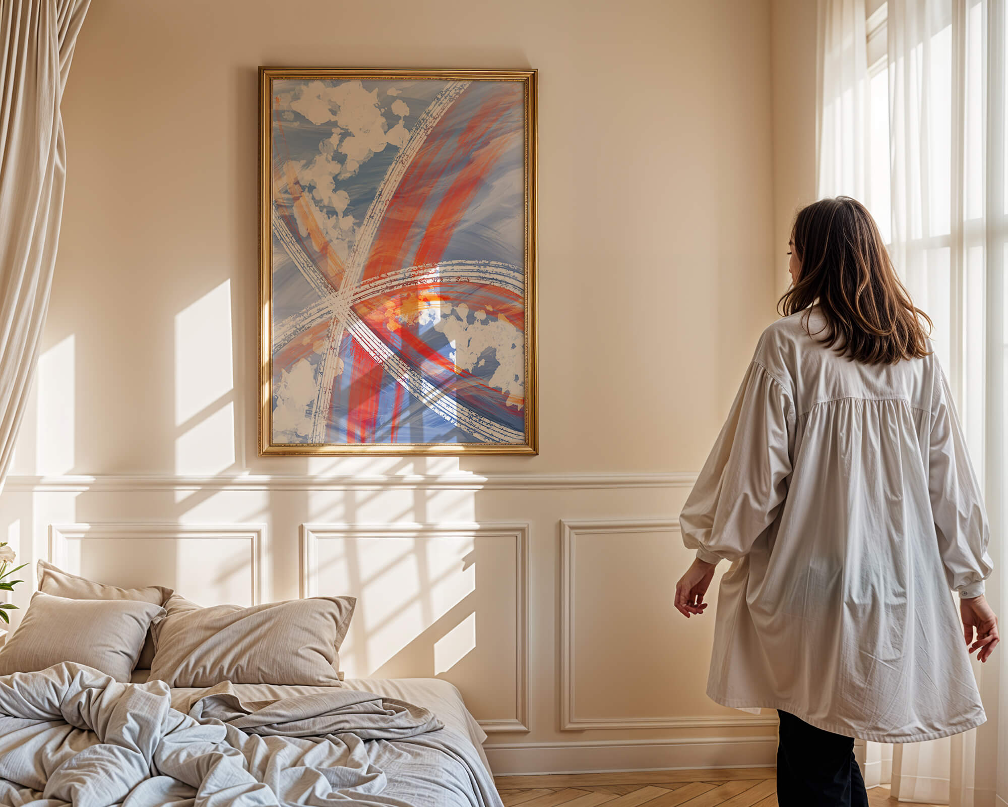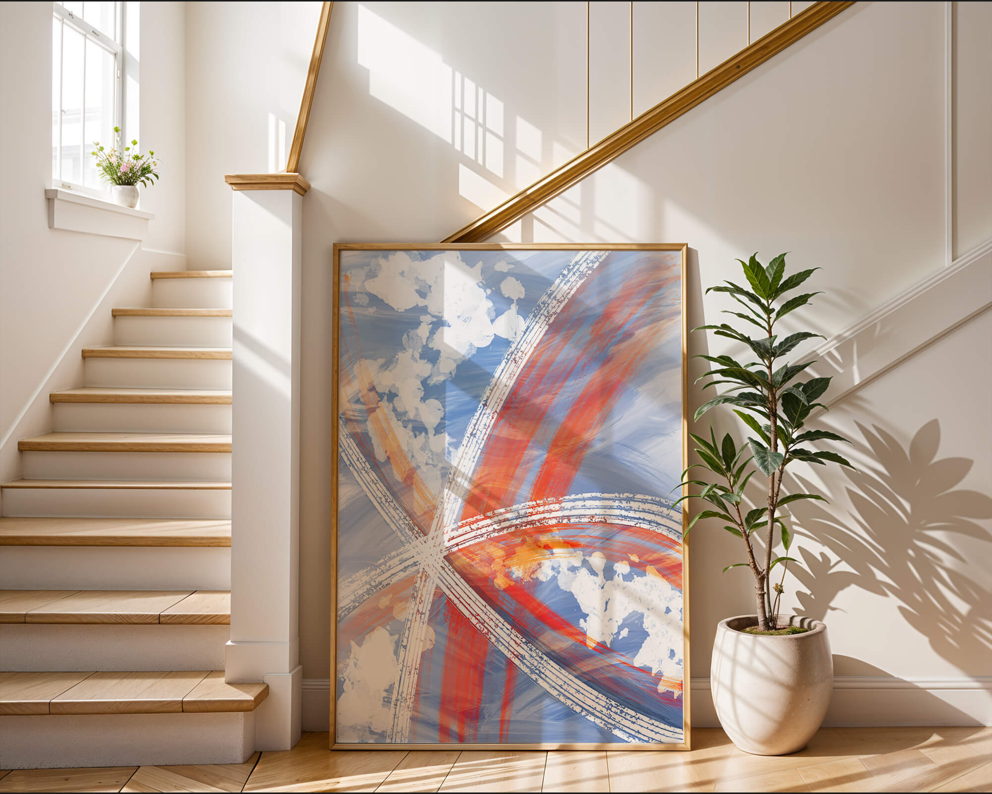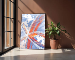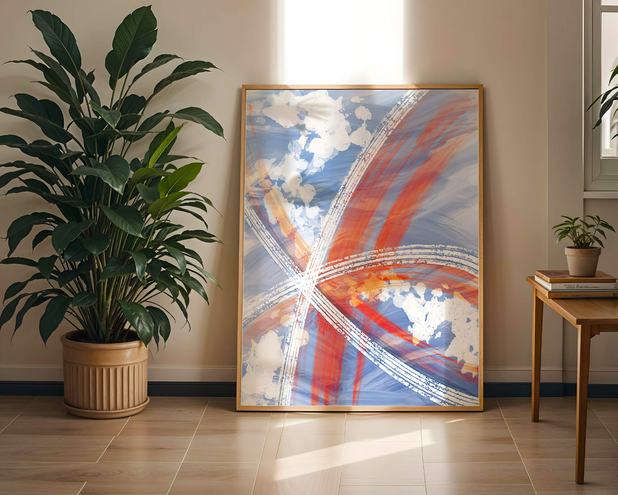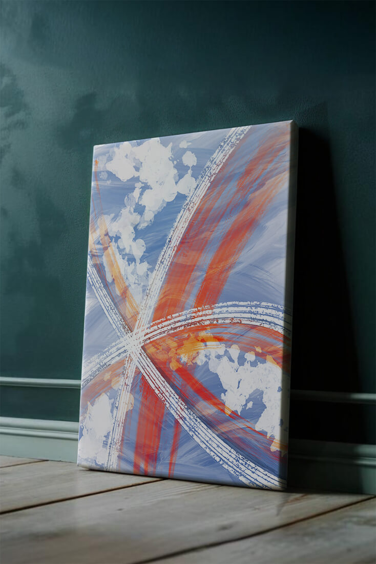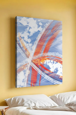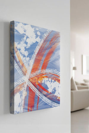 En esta obra, pinceladas amplias y dinámicas se entrecruzan, creando una sensación vivaz y energética. El uso de los colores azul y naranja no solo proporciona contraste, sino que también evoca una sensación de profundidad y movimiento. La naturaleza abstracta de la pieza invita a los espectadores a interpretar las imágenes a su manera, lo que la convierte en una experiencia verdaderamente personal. La textura de la pintura añade calidad expresiva, con cada trazo llevando una sensación de espontaneidad y libertad. Esta obra sirve como un ejemplo perfecto de cómo el color y la forma pueden transmitir emociones complejas sin necesidad de elementos representativos.| Tipo |