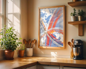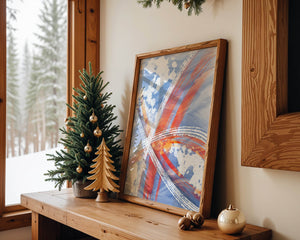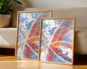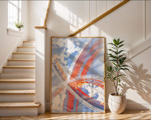 Esta obra muestra la vibrante energía del expresionismo abstracto, encarnando movimiento y emoción a través de pinceladas audaces y colores vivos. La interacción entre los tonos azules y naranjas crea una composición visualmente impactante.