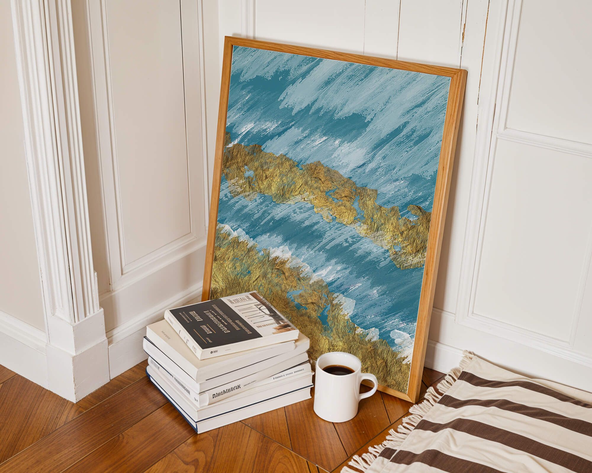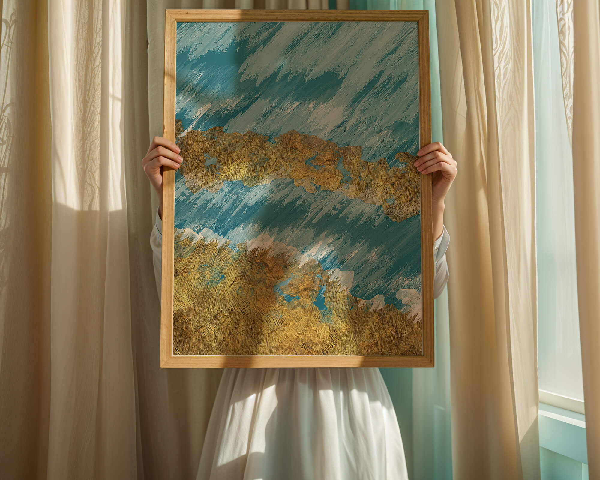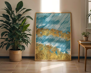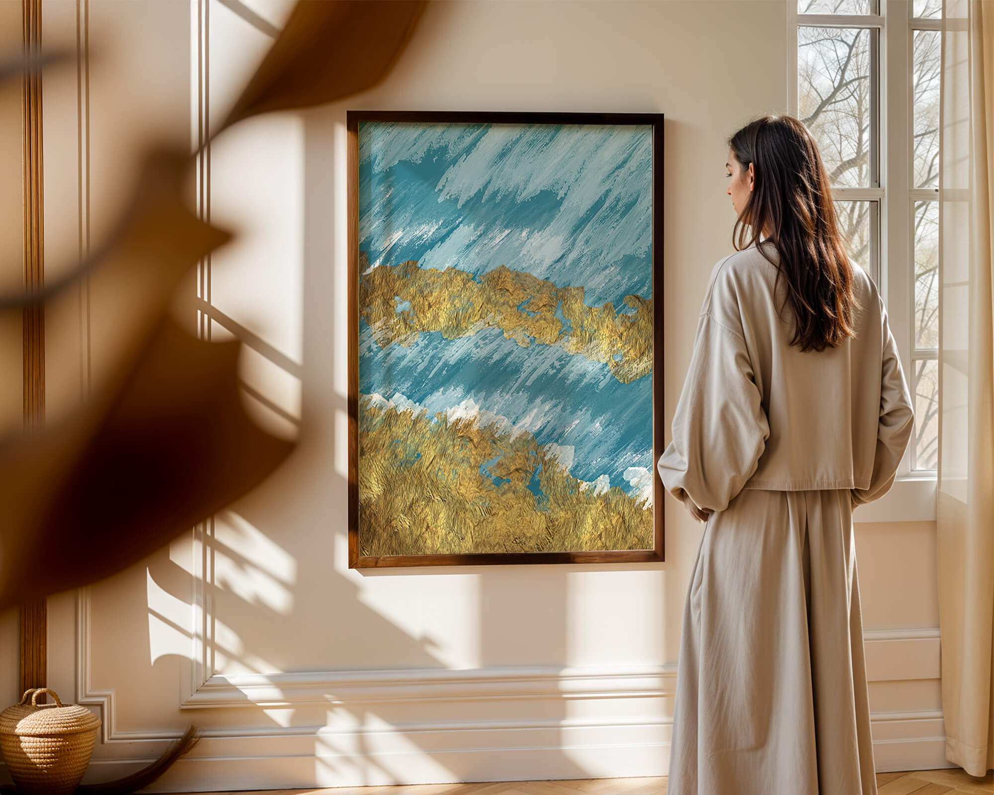 En esta obra, el artista ha utilizado magistralmente texturas y colores contrastantes para simular el movimiento de las olas del océano. El vibrante azul sirve como telón de fondo sereno, mientras que el dorado añade un toque de lujo que capta la mirada. Las pinceladas crean una sensación de profundidad y movimiento, atrayendo al espectador hacia un hipnótico baile de colores. Esta pieza puede transformar cualquier espacio interior, añadiendo un toque de sofisticación y estilo. Ya sea colocada en una sala de estar, dormitorio u oficina, sirve como una decoración versátil que irradia elegancia moderna. La fusión de temas naturales con un toque contemporáneo hace que esta obra sea una elección ideal para aquellos que buscan realzar su hogar con una pieza impactante.| Tipo |