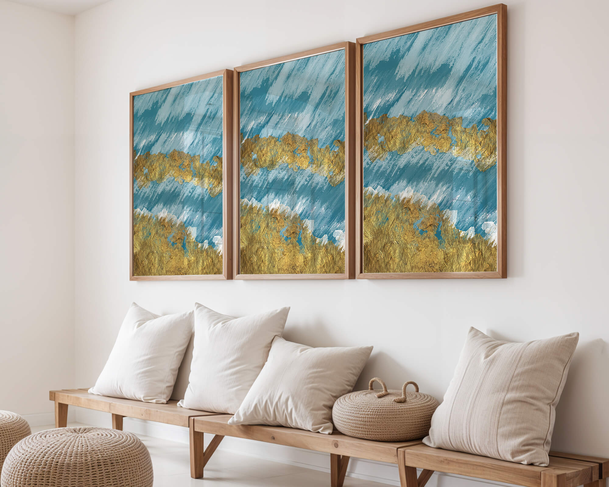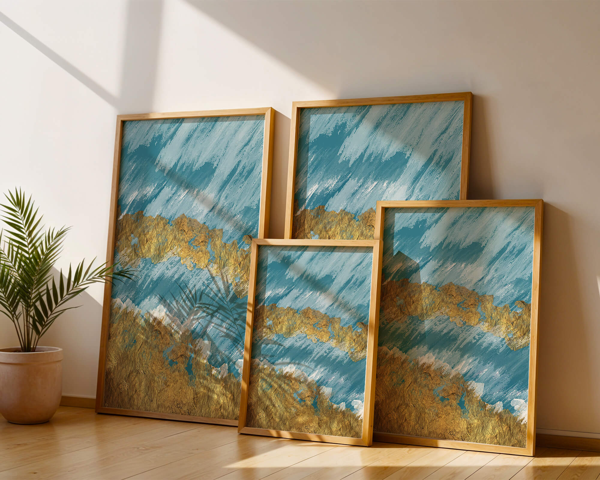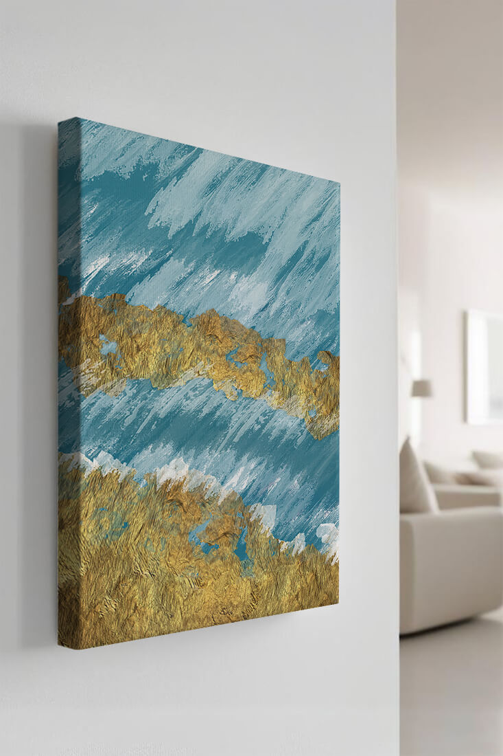 Esta imagen presenta una fascinante representación abstracta de las olas del océano con impresionantes acentos dorados. El uso de pinceladas texturizadas crea un efecto dinámico y fluido, combinando tonos azules con dorado brillante para evocar una sensación de lujo y elegancia.