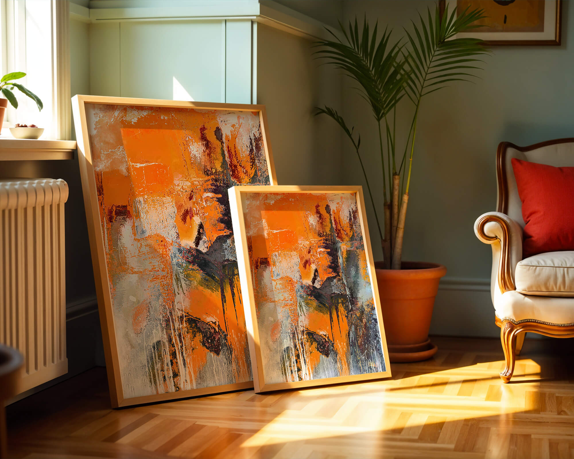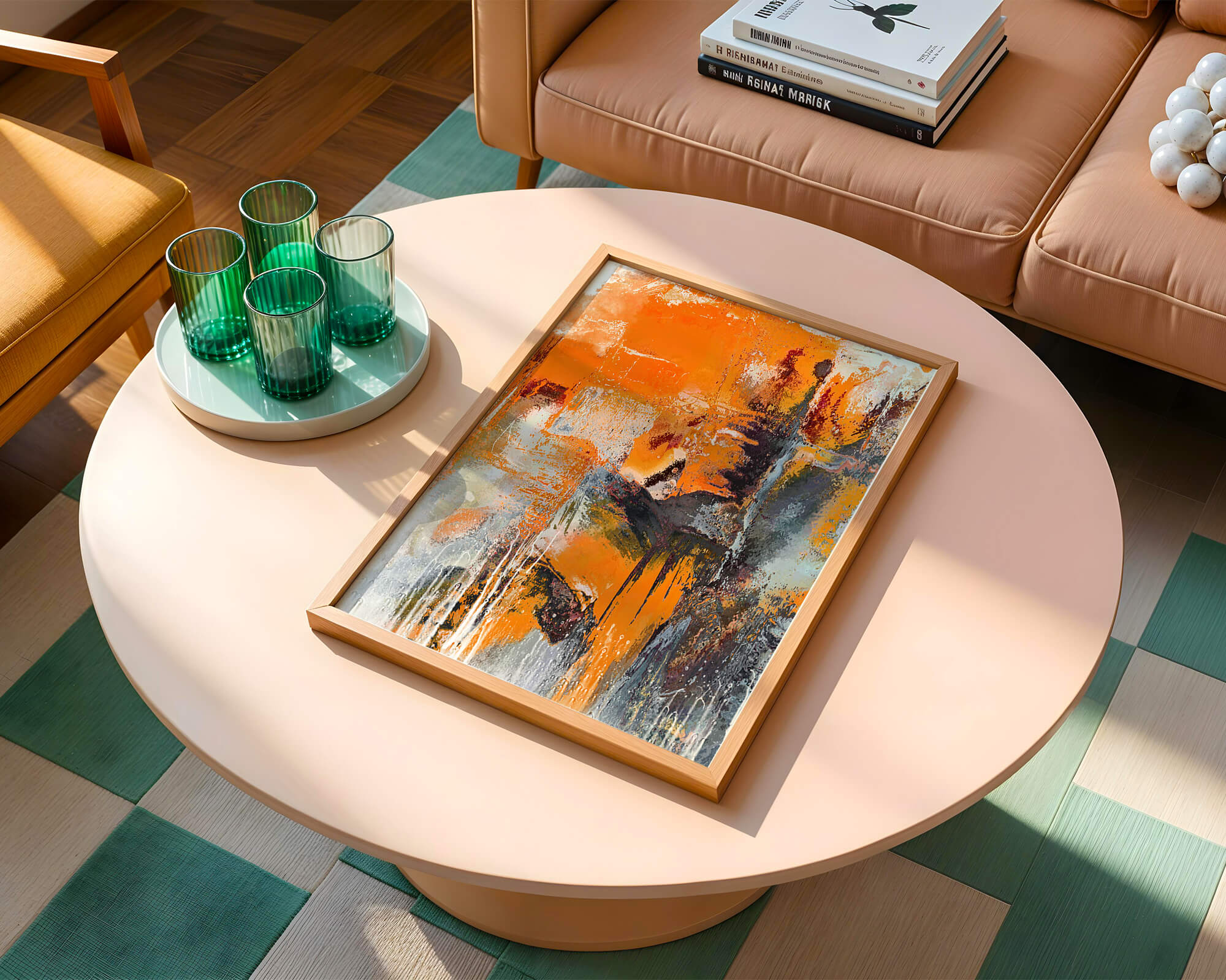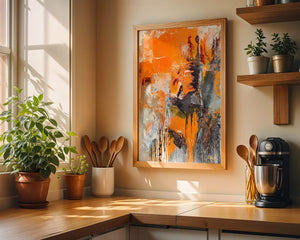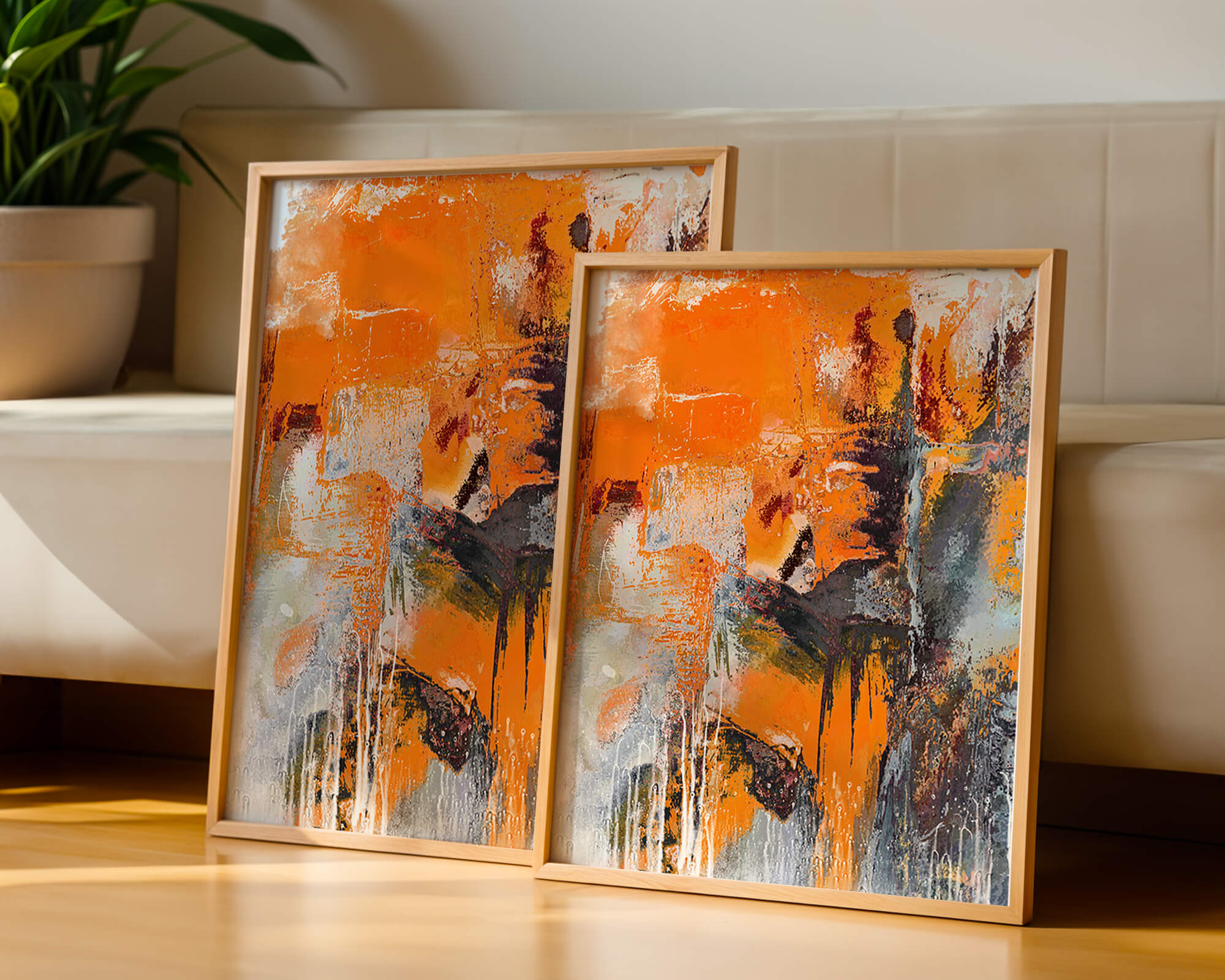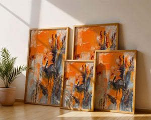 Esta obra de arte presenta una vibrante exploración de formas y texturas abstractas, destacando principalmente tonos naranjas y grises. La dinámica interacción de colores crea una estética audaz y moderna que realza cualquier espacio interior.