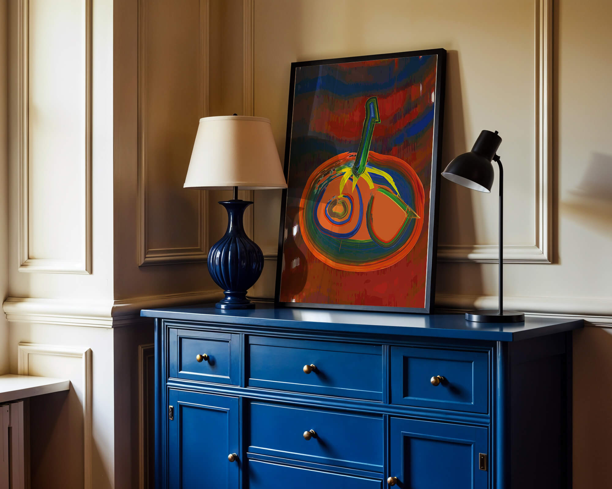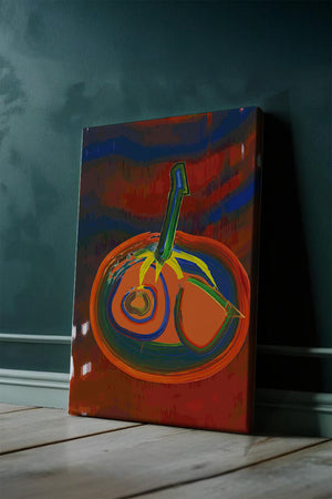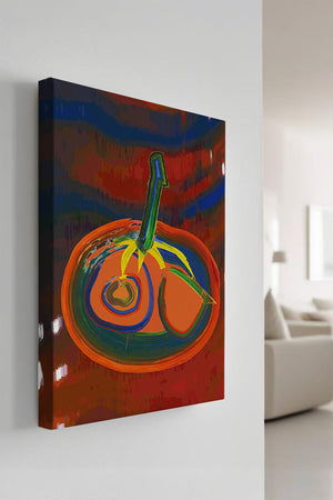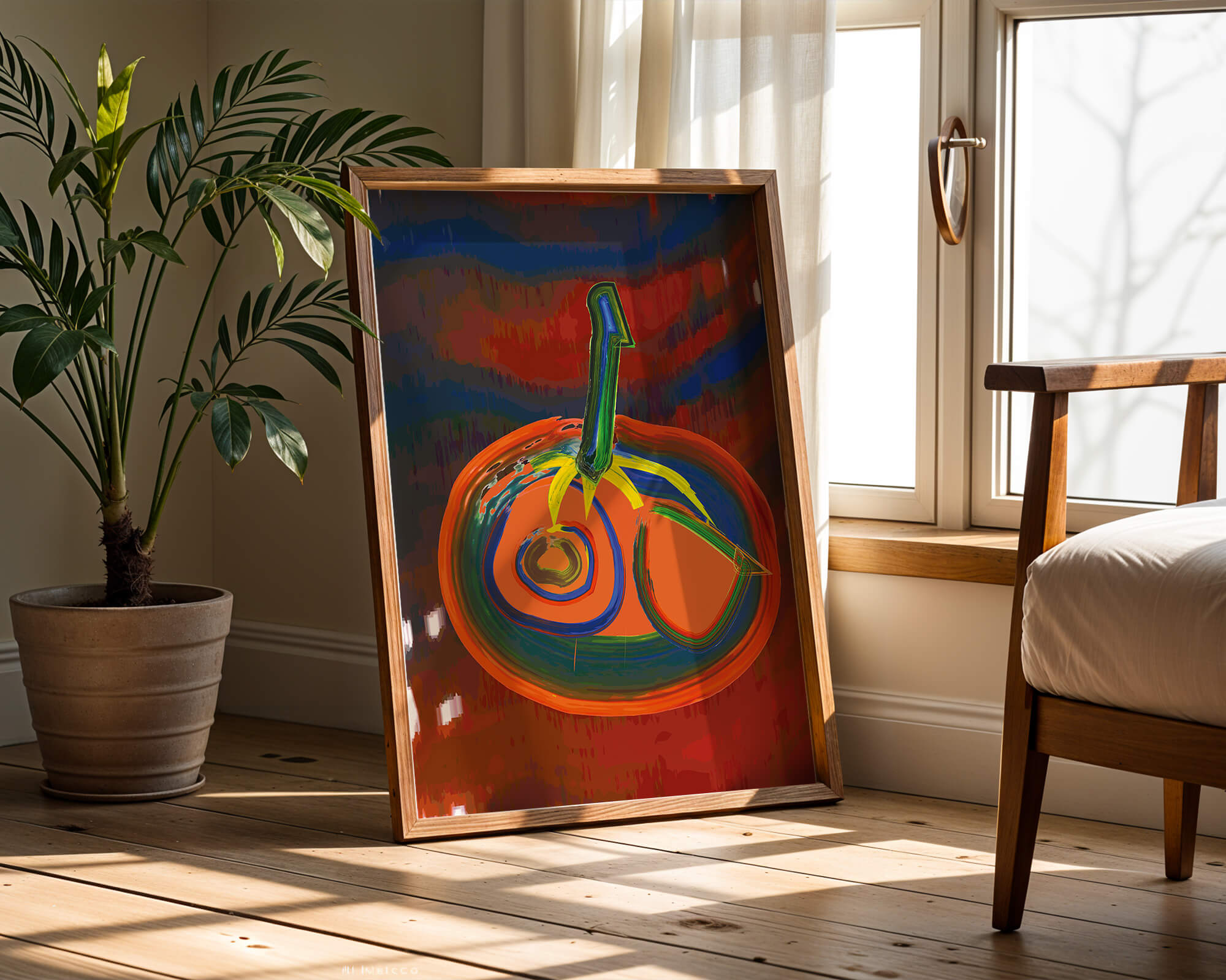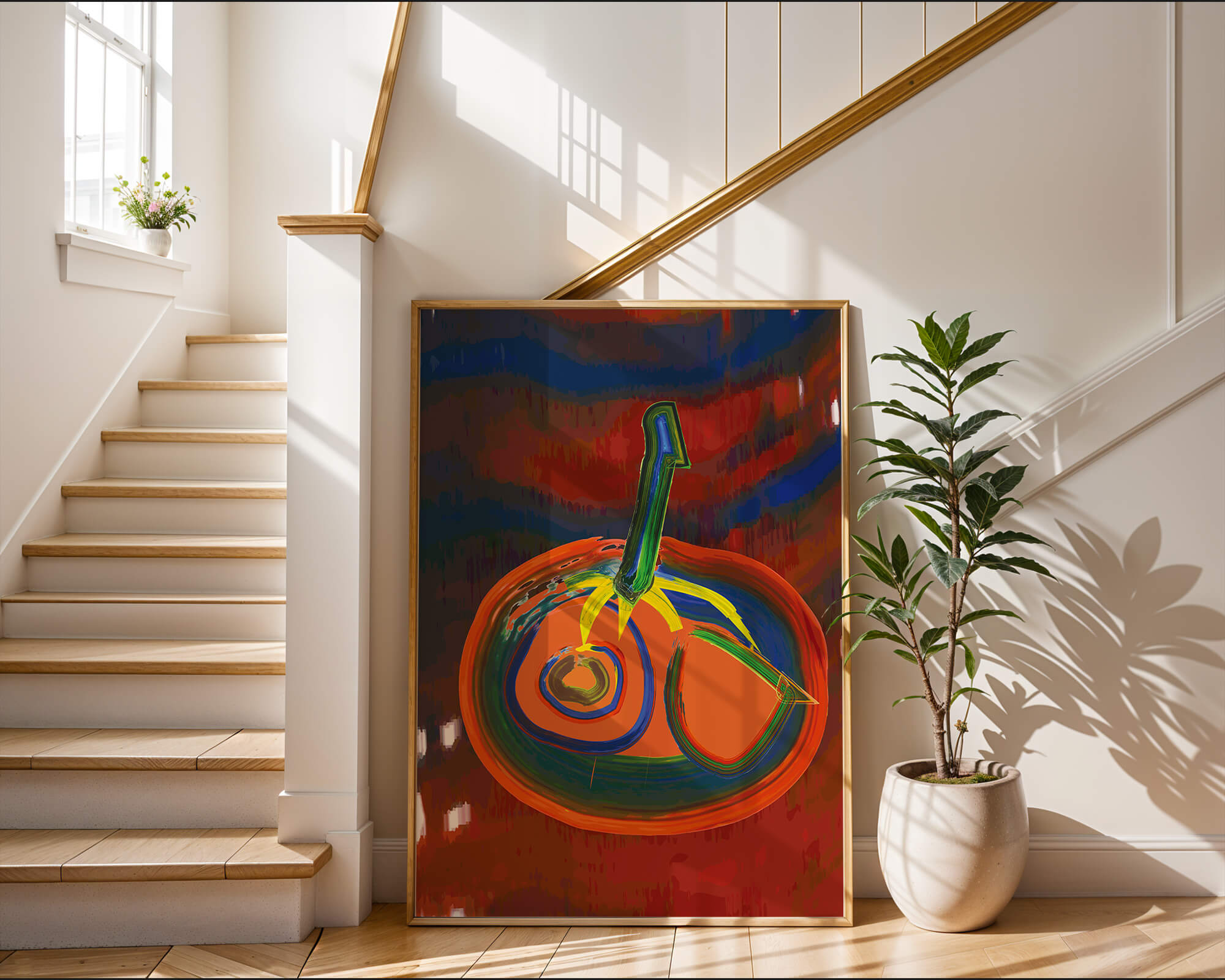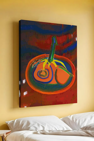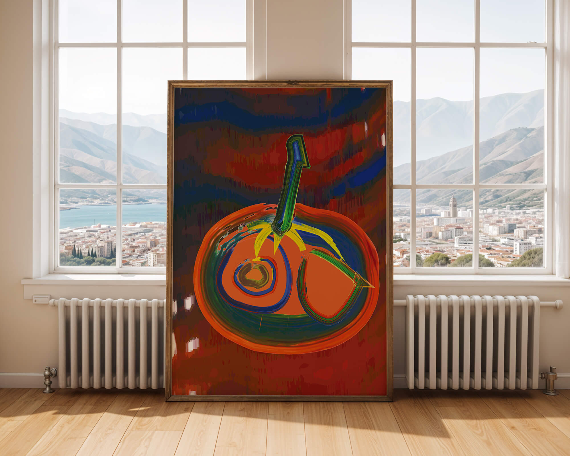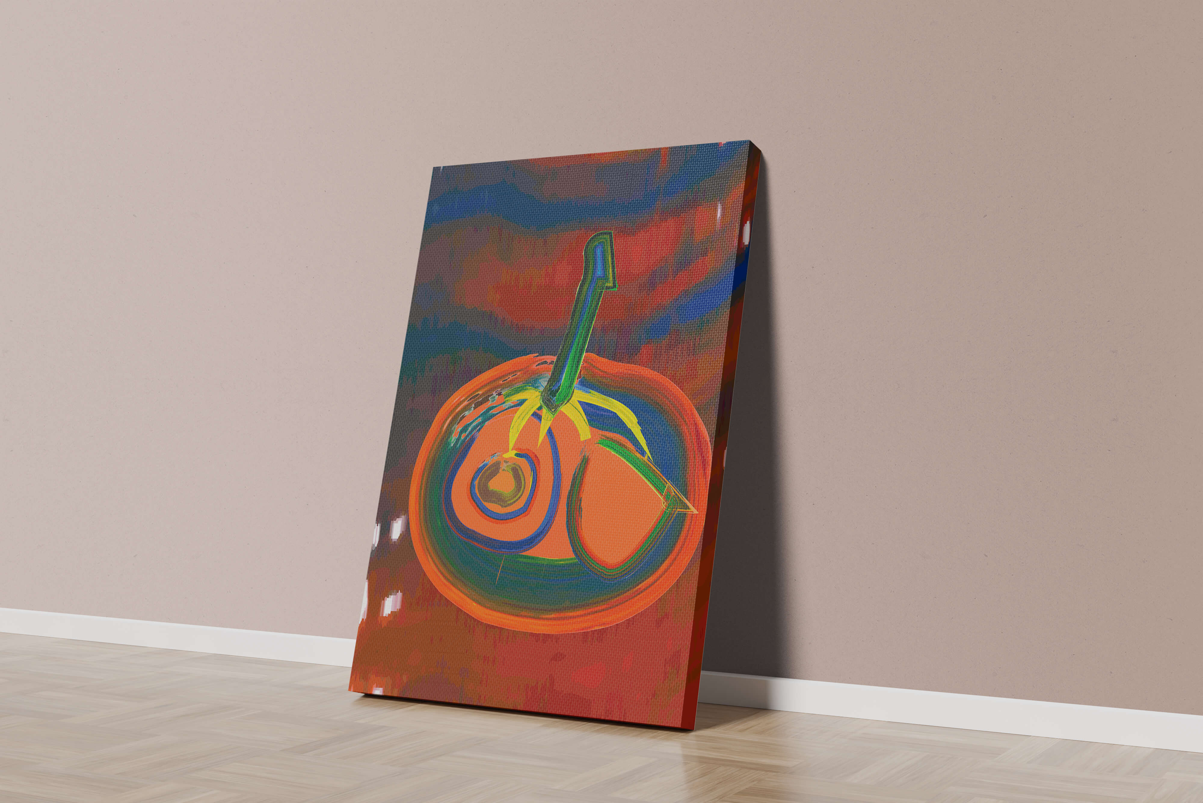 Esta pintura abstracta muestra una mezcla dinámica de colores vibrantes y elementos de diseño audaces. La interacción de tonos ricos como el naranja, rojo, azul y verde crea una composición llamativa que capta la atención del espectador.