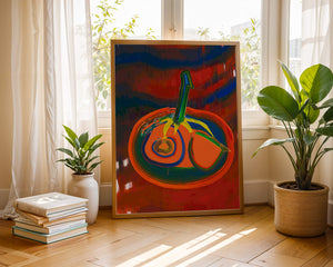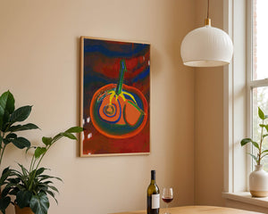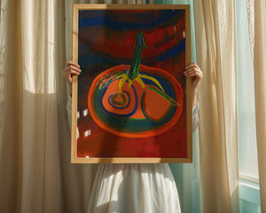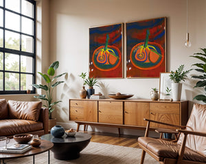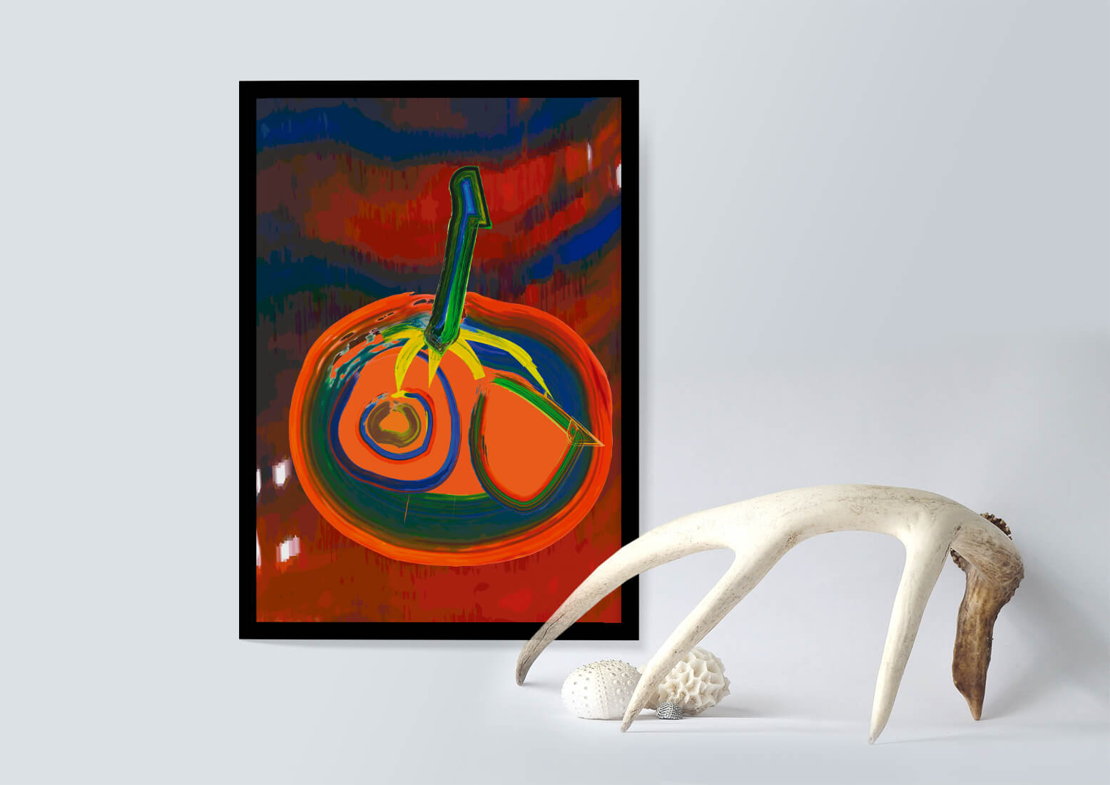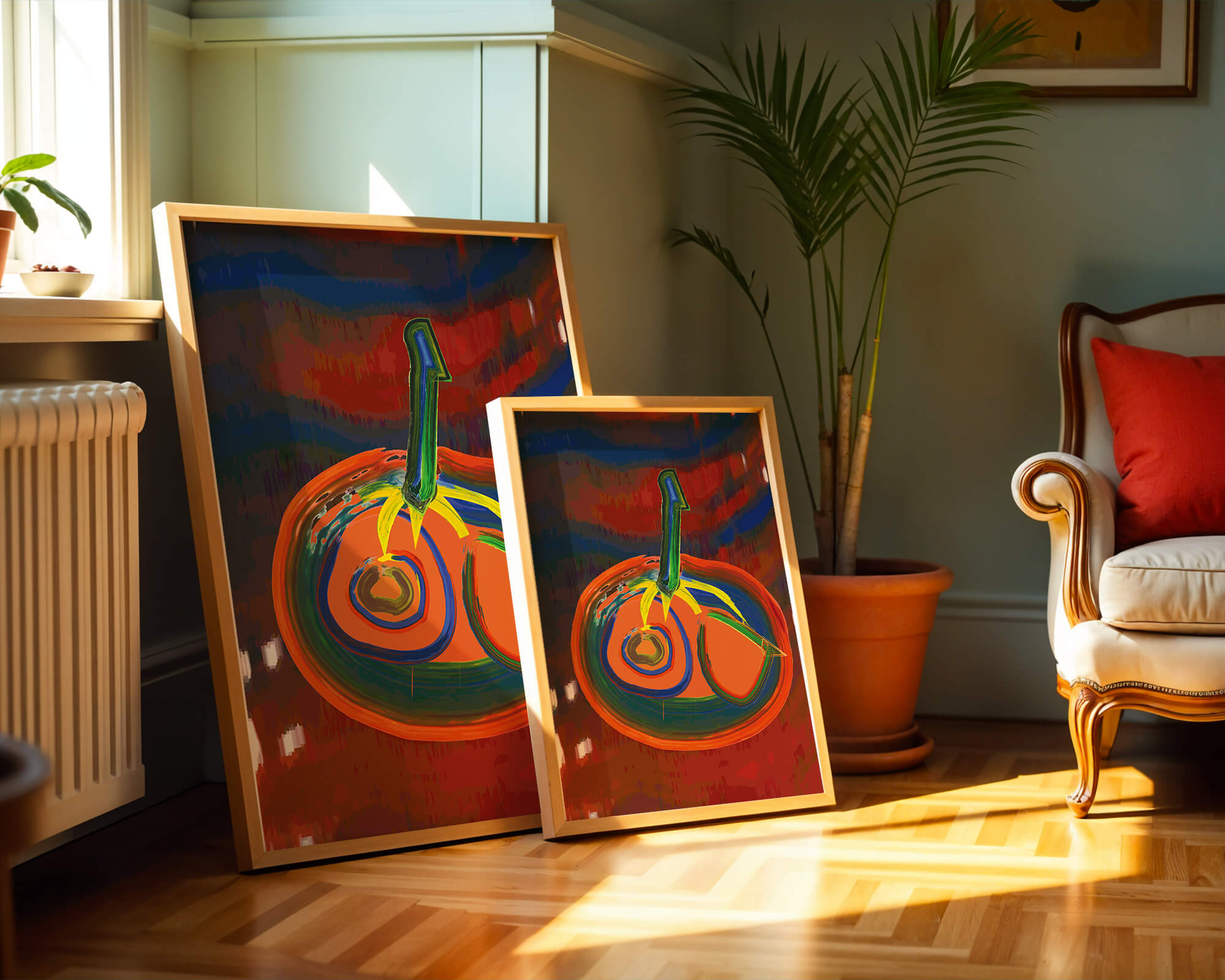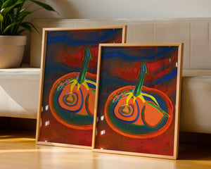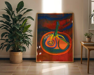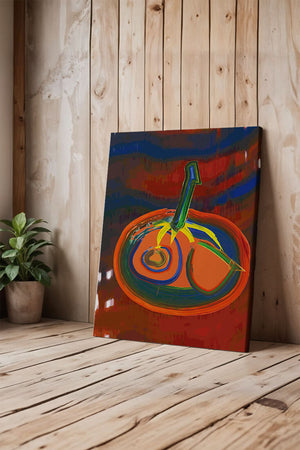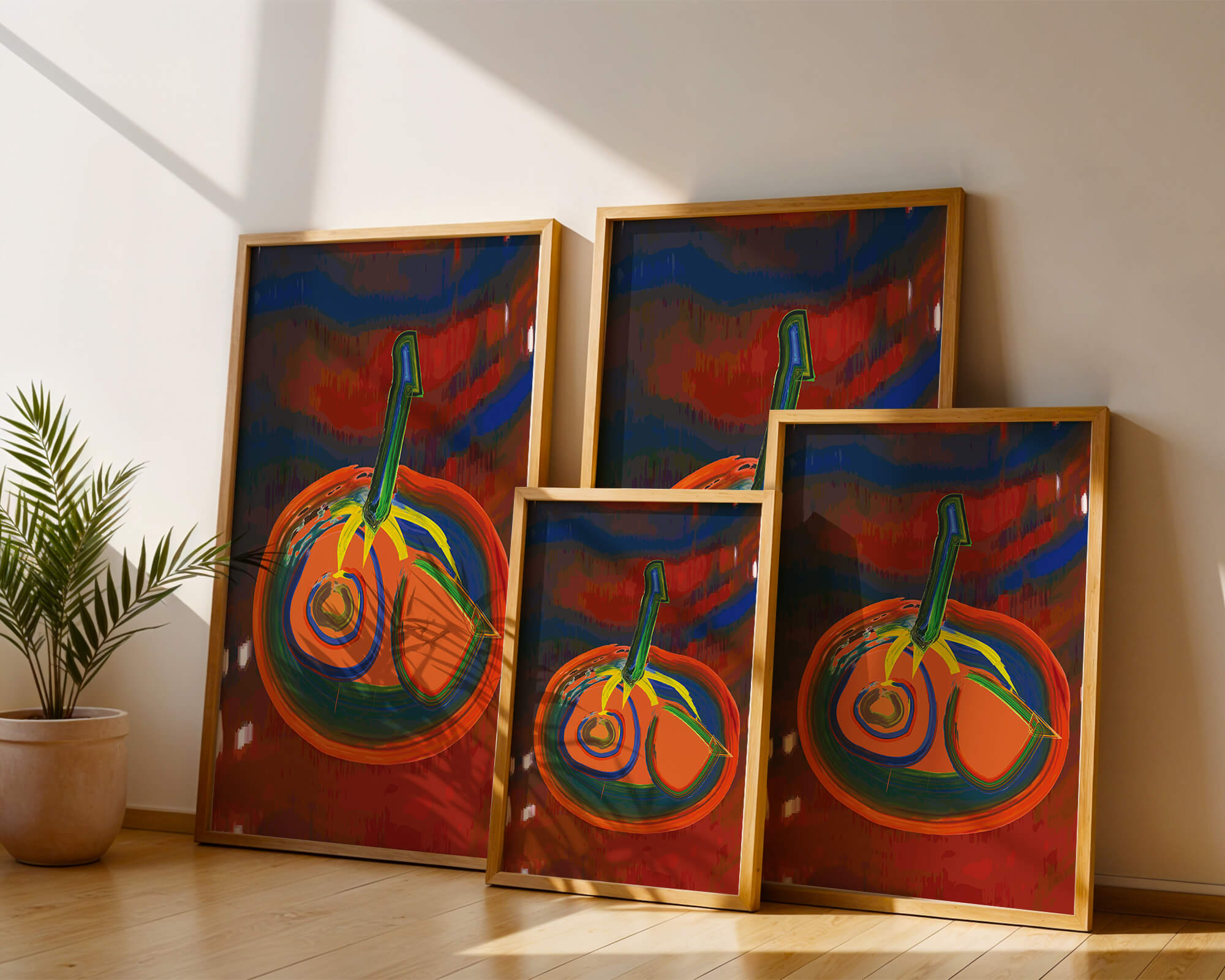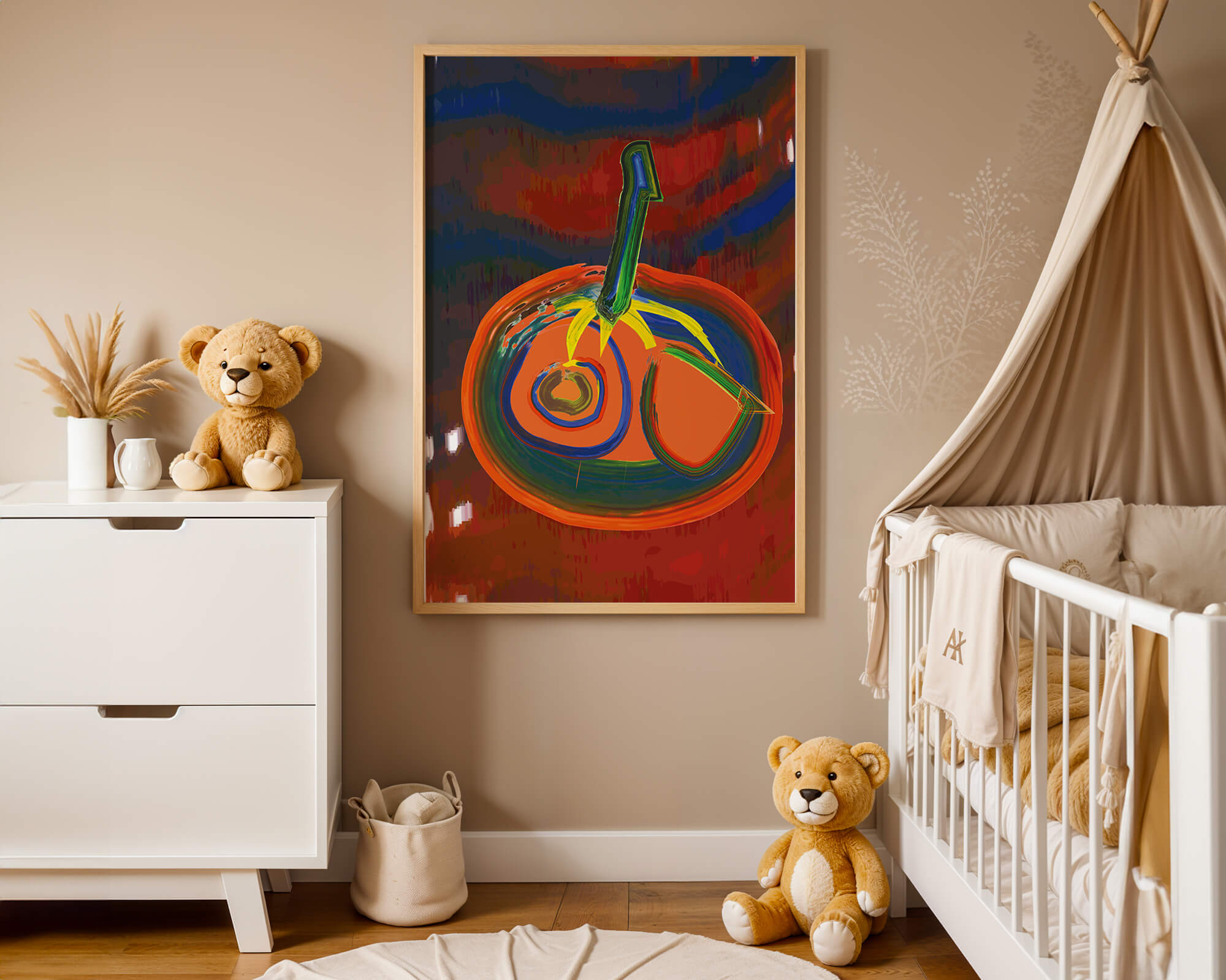 Esta pintura abstracta muestra una mezcla dinámica de colores vibrantes y elementos de diseño audaces. La interacción de tonos ricos como el naranja, rojo, azul y verde crea una composición llamativa que capta la atención del espectador.