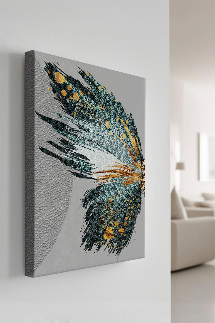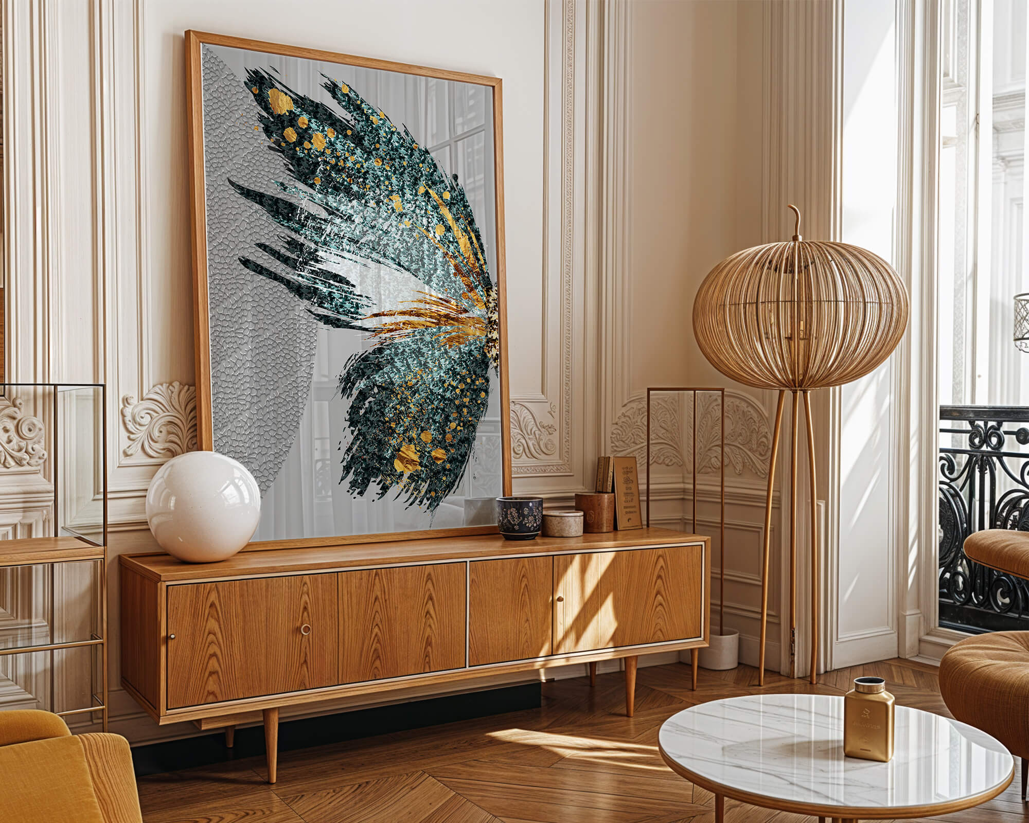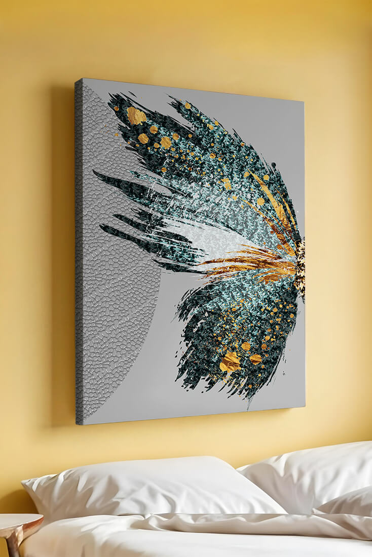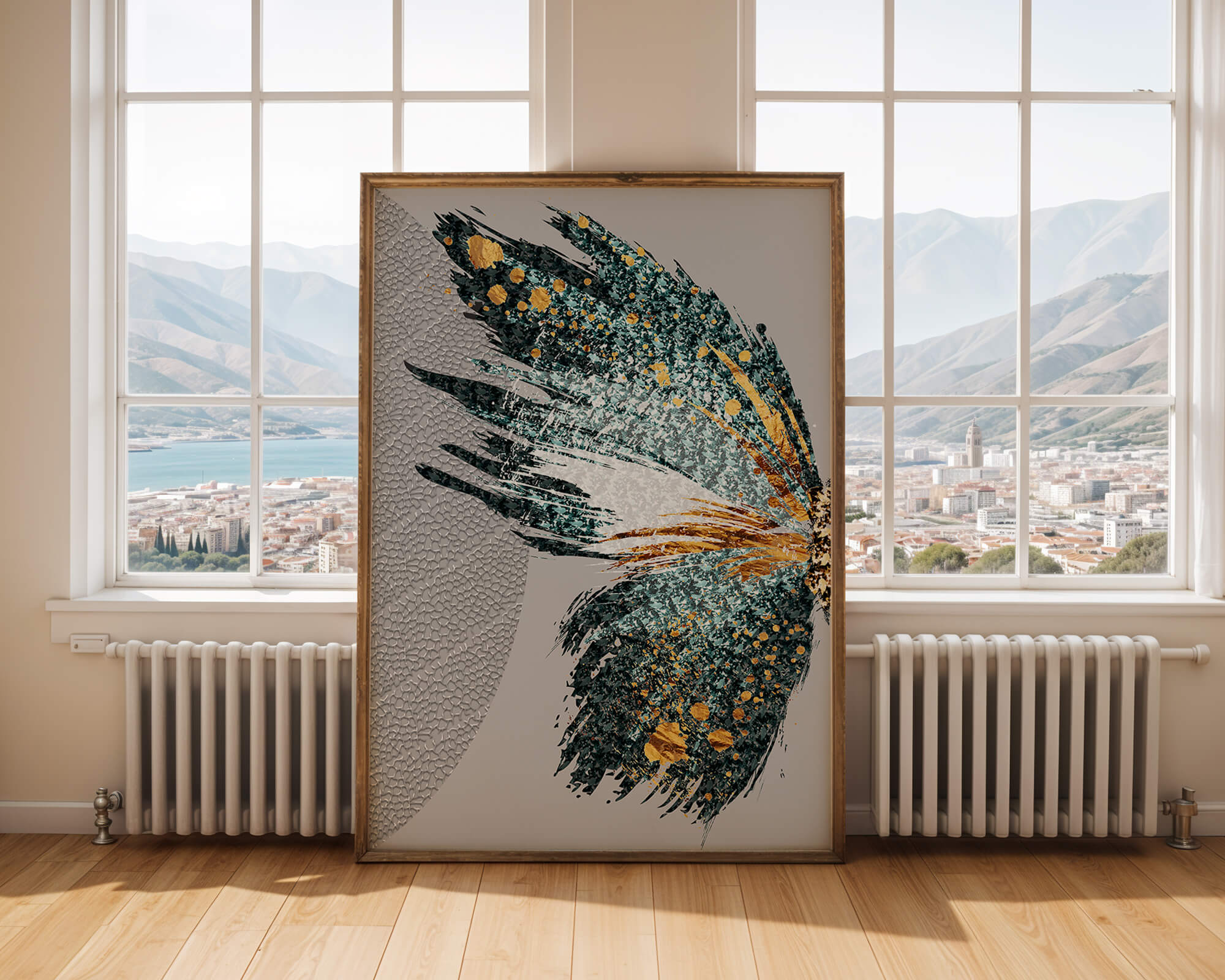 La imagen presenta una composición de formas similares a alas con una superficie abstracta y texturizada. La interacción de colores y texturas crea un impacto visual dinámico, atrayendo al espectador hacia las complejidades del diseño. Los acentos dorados añaden un toque de lujo y elegancia, haciendo que la pieza destaque. La obra refleja un estilo moderno, ideal para entornos contemporáneos. La armoniosa mezcla de elementos texturizados y los detalles dorados brillantes crea una sensación de sofisticación y distinción. Esta pieza complementaría cualquier espacio, añadiendo un toque de belleza artesanal y expresión creativa a la decoración.| Tipo |