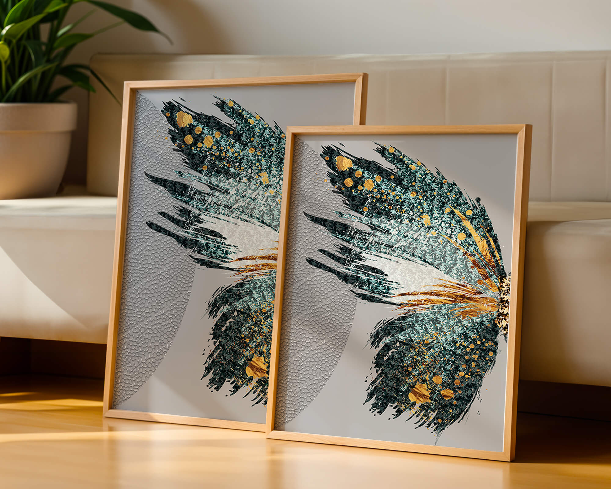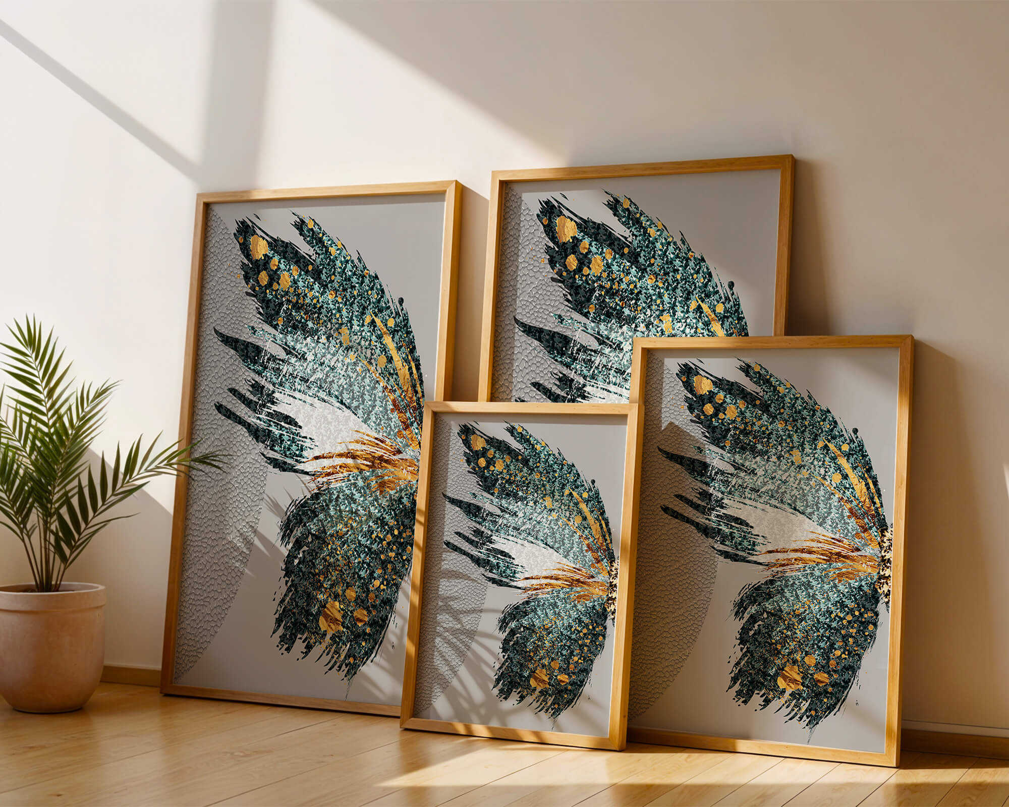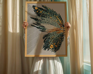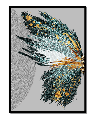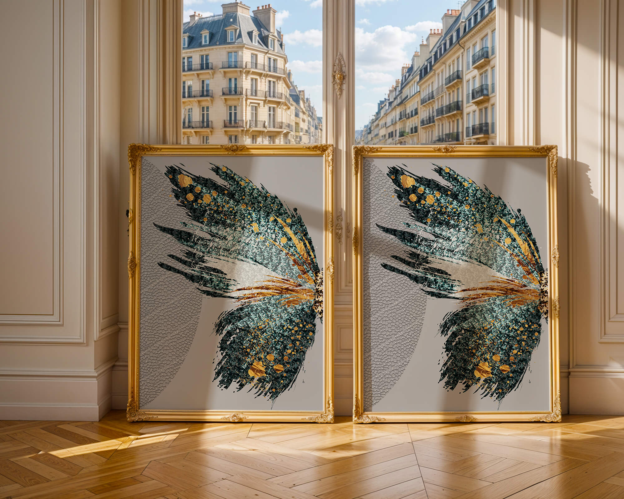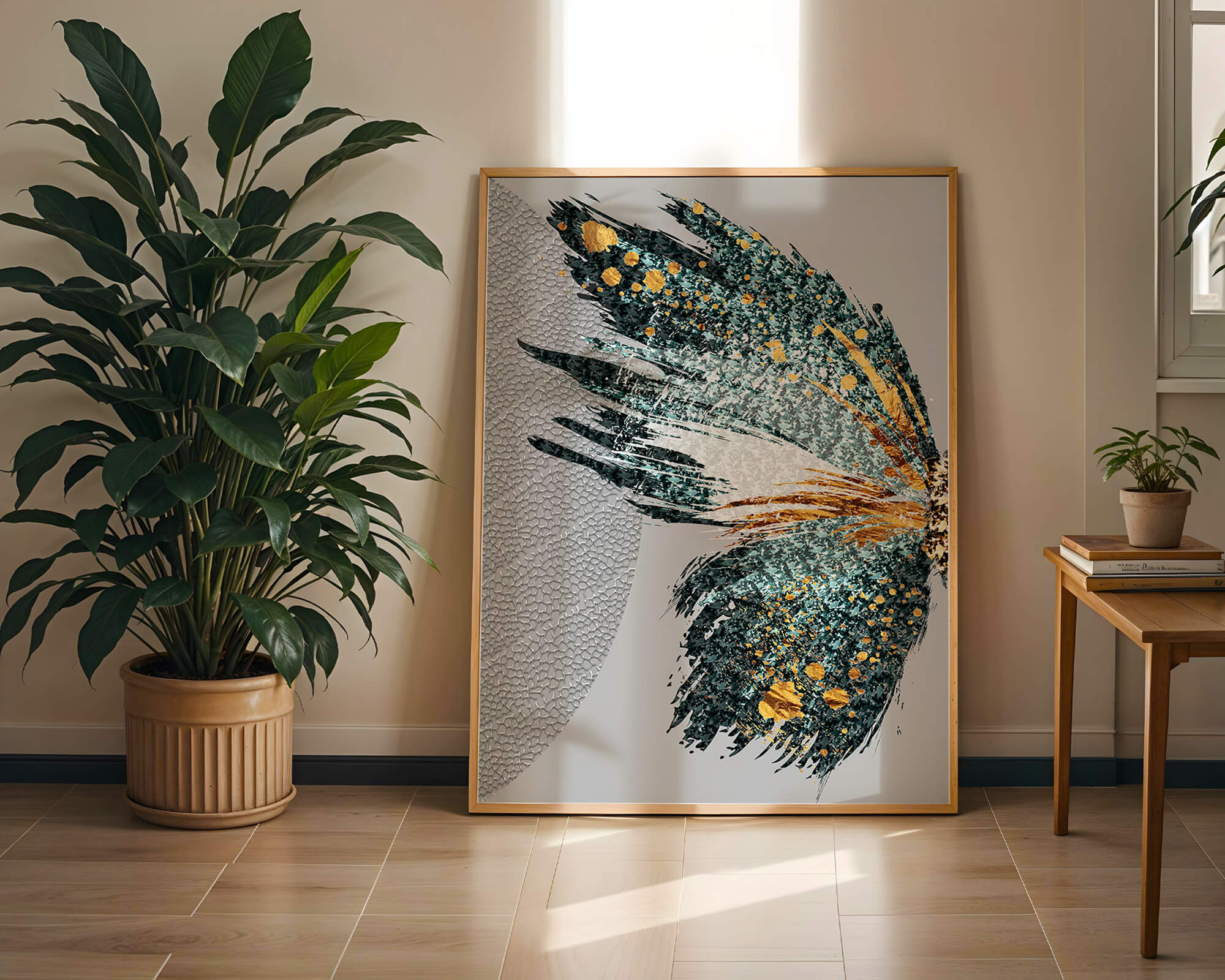 La imagen presenta una composición de formas similares a alas con una superficie abstracta y texturizada. La interacción de colores y texturas crea un impacto visual dinámico, atrayendo al espectador hacia las complejidades del diseño. Los acentos dorados añaden un toque de lujo y elegancia, haciendo que la pieza destaque. La obra refleja un estilo moderno, ideal para entornos contemporáneos. La armoniosa mezcla de elementos texturizados y los detalles dorados brillantes crea una sensación de sofisticación y distinción. Esta pieza complementaría cualquier espacio, añadiendo un toque de belleza artesanal y expresión creativa a la decoración.| Tipo |
