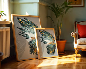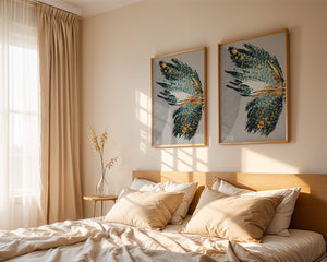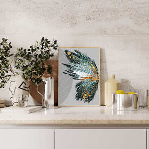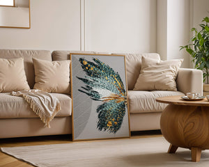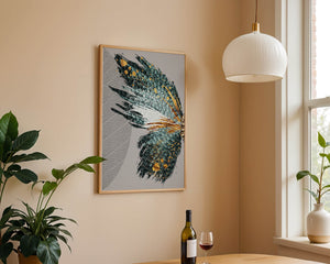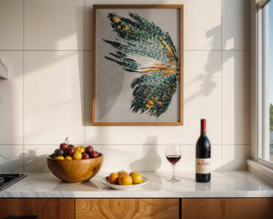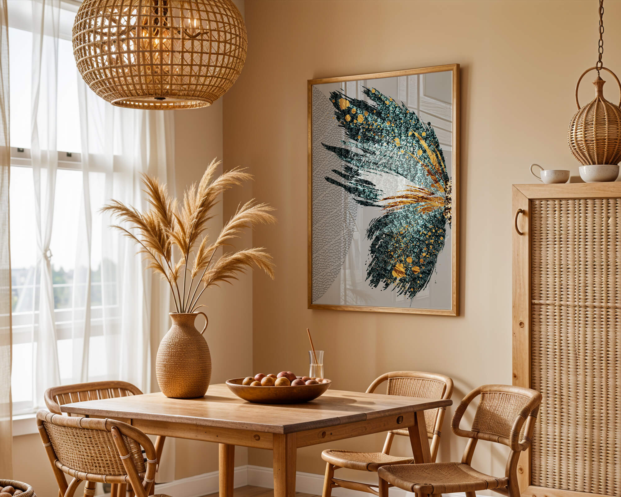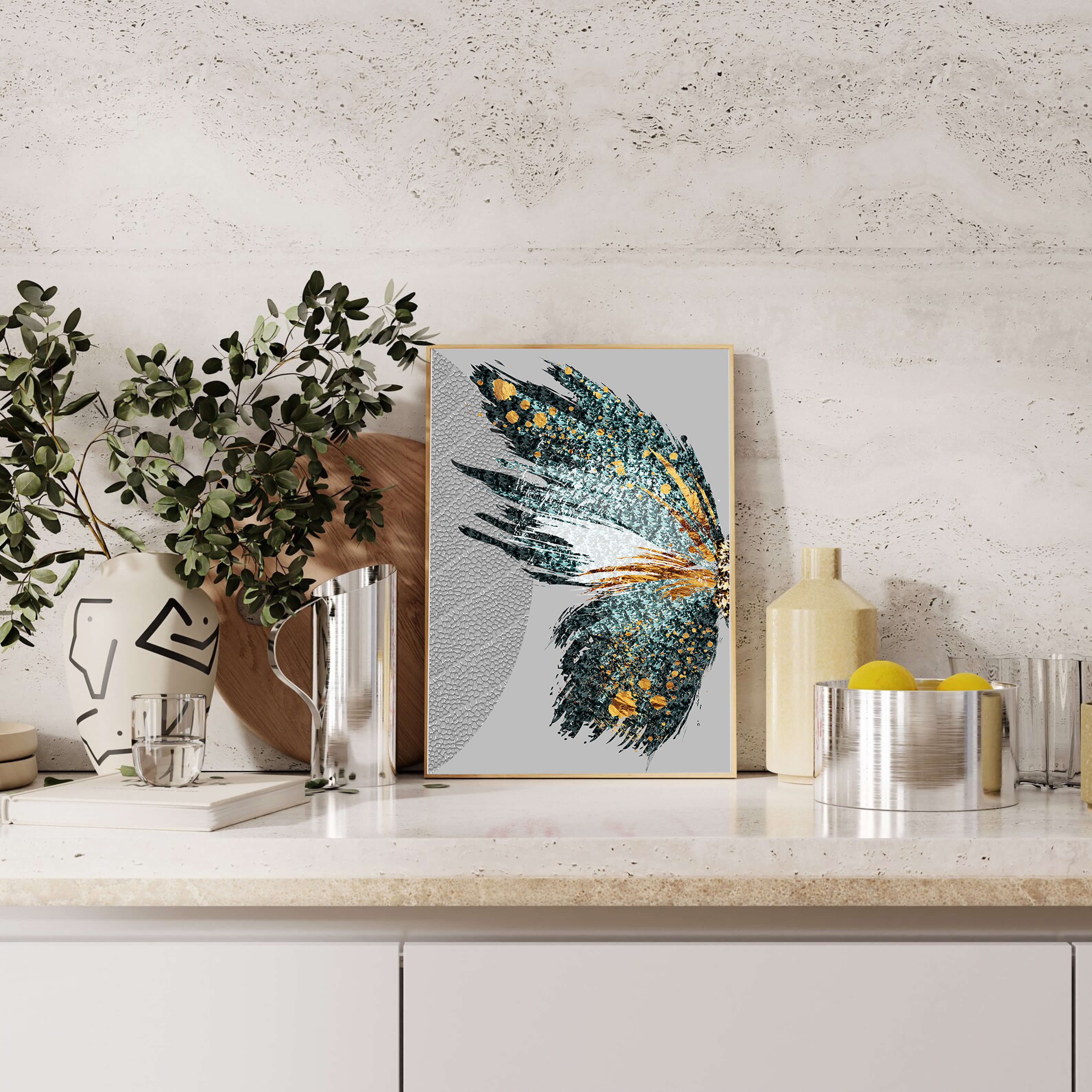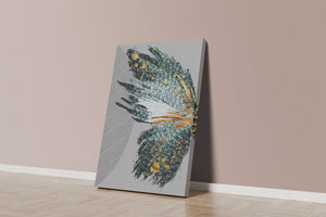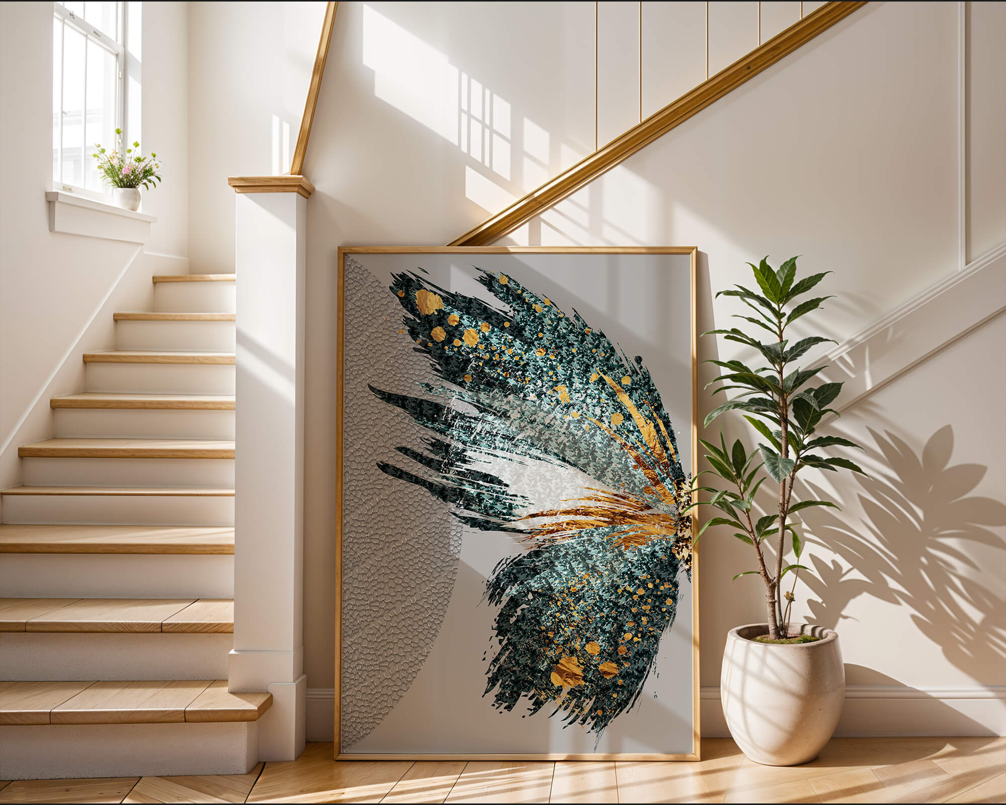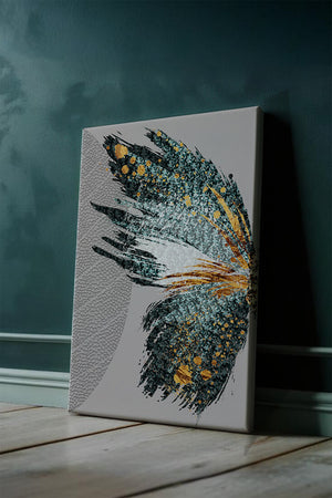 La imagen presenta una composición de formas similares a alas con una superficie abstracta y texturizada. La interacción de colores y texturas crea un impacto visual dinámico, atrayendo al espectador hacia las complejidades del diseño. Los acentos dorados añaden un toque de lujo y elegancia, haciendo que la pieza destaque. La obra refleja un estilo moderno, ideal para entornos contemporáneos. La armoniosa mezcla de elementos texturizados y los detalles dorados brillantes crea una sensación de sofisticación y distinción. Esta pieza complementaría cualquier espacio, añadiendo un toque de belleza artesanal y expresión creativa a la decoración.| Tipo |
