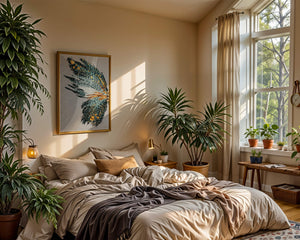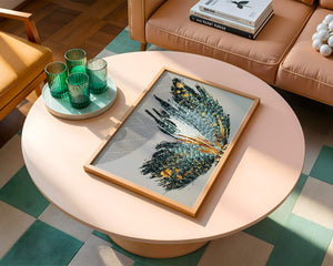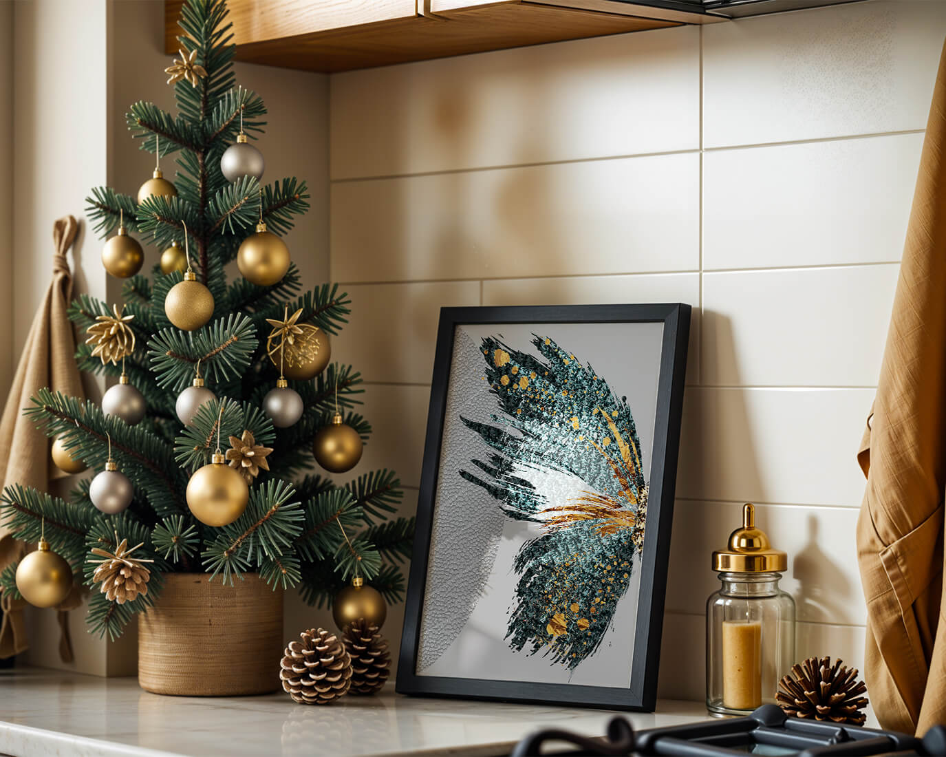 Esta obra combina bellamente elementos abstractos con detalles texturizados, resaltados por llamativos acentos dorados.
