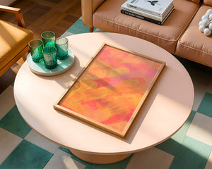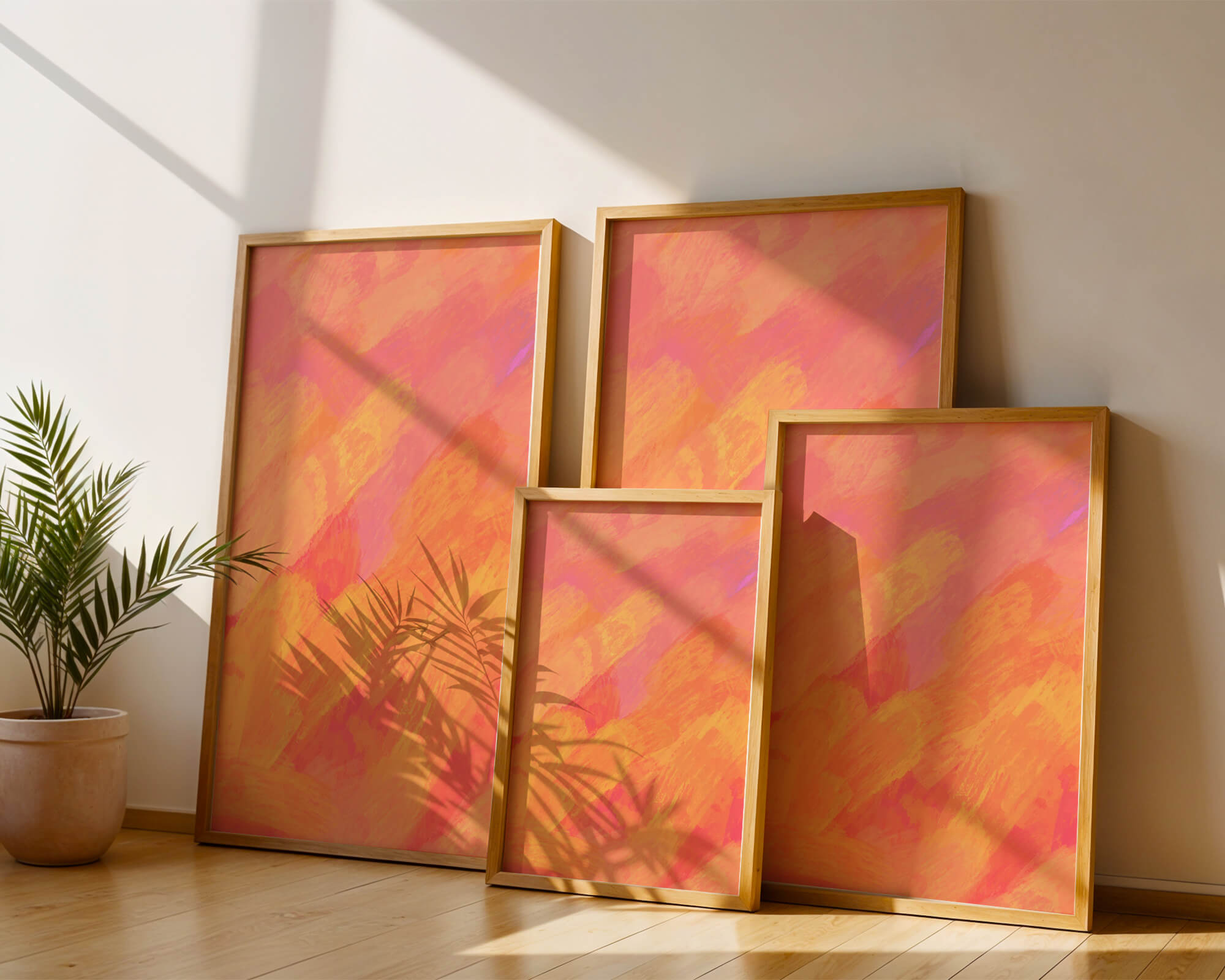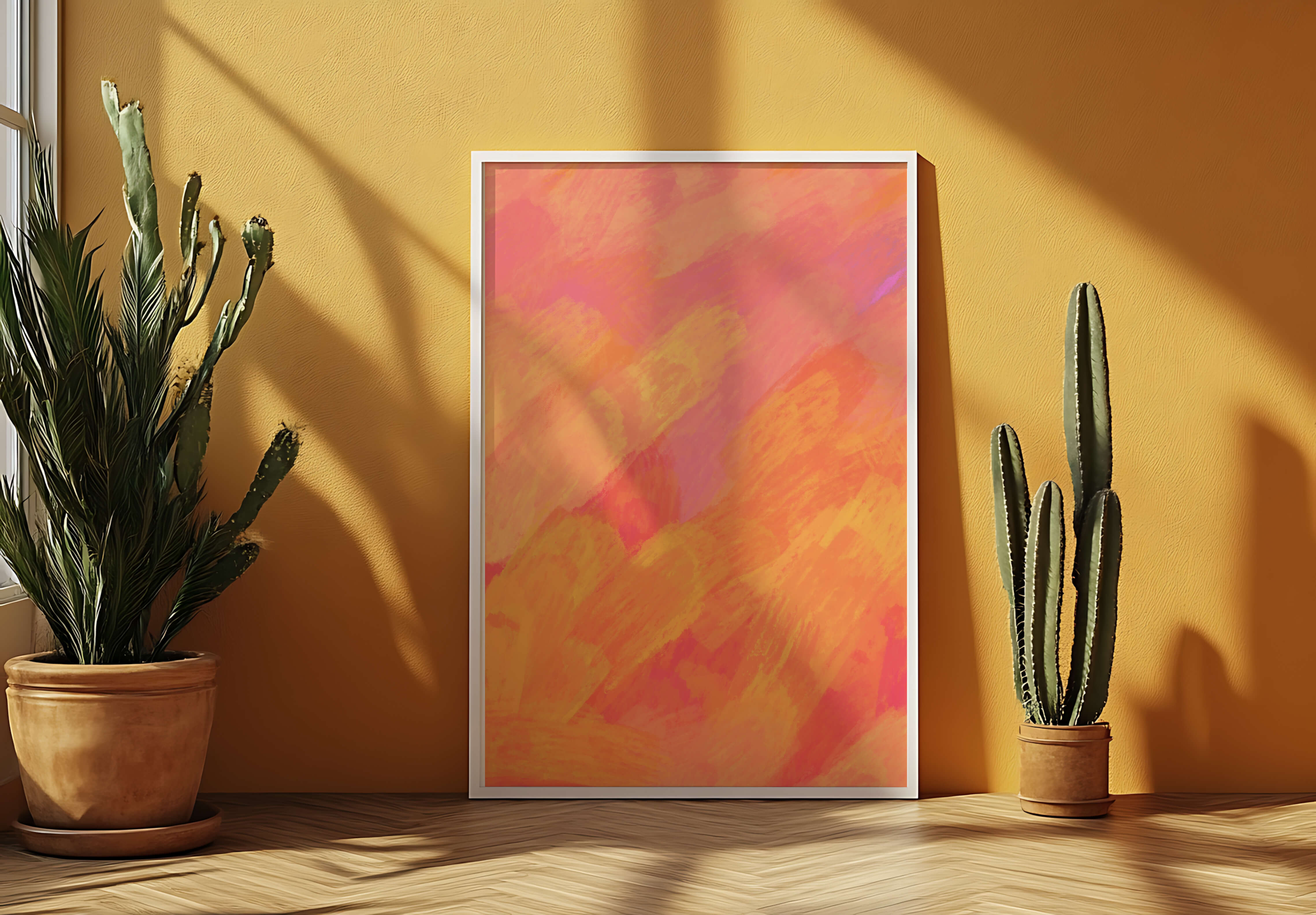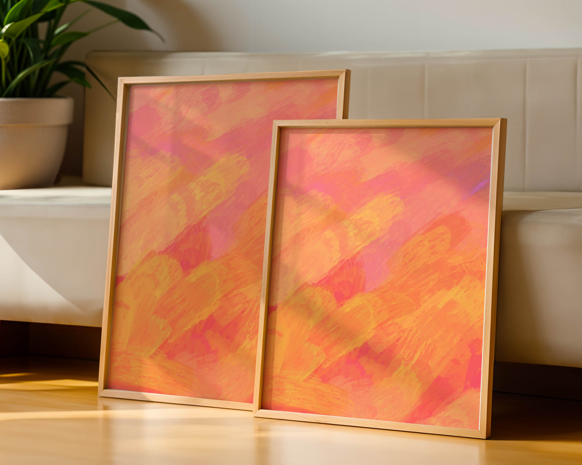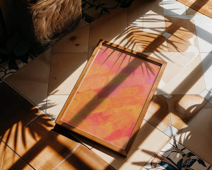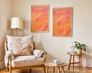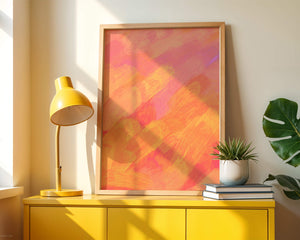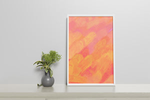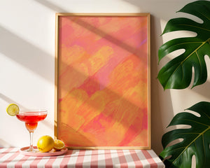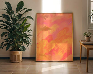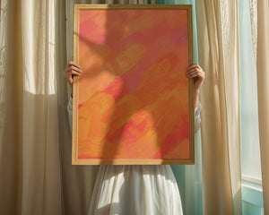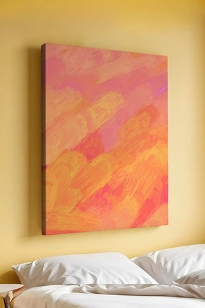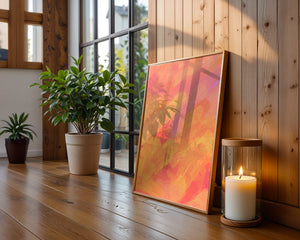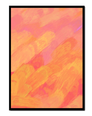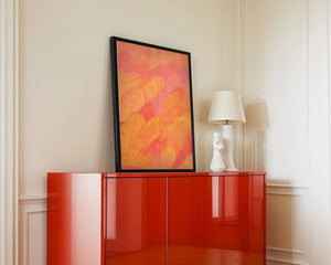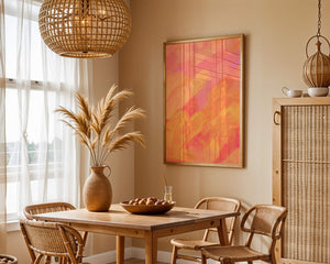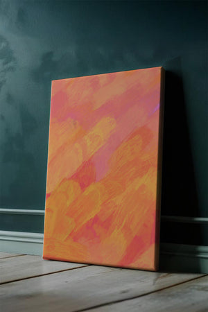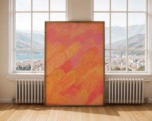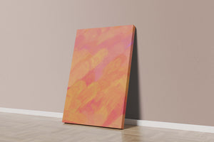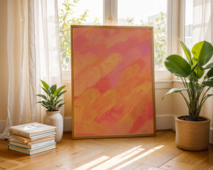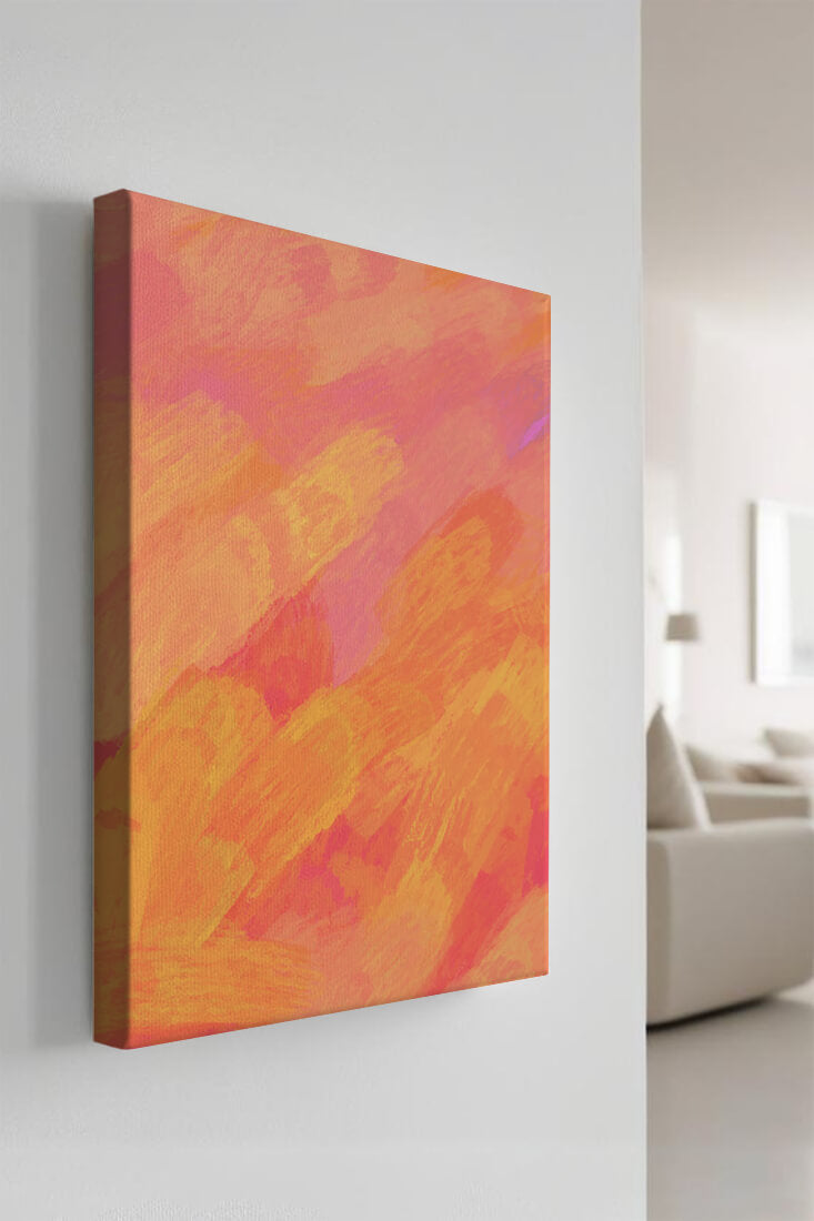 Esta vibrante y dinámica obra de arte presenta una mezcla de tonos cálidos con pinceladas expresivas. La composición utiliza matices de naranja, rosa y amarillo para crear una experiencia visual animada e invitante.