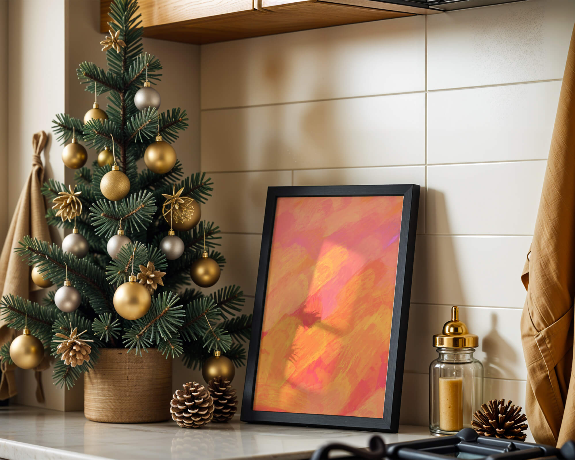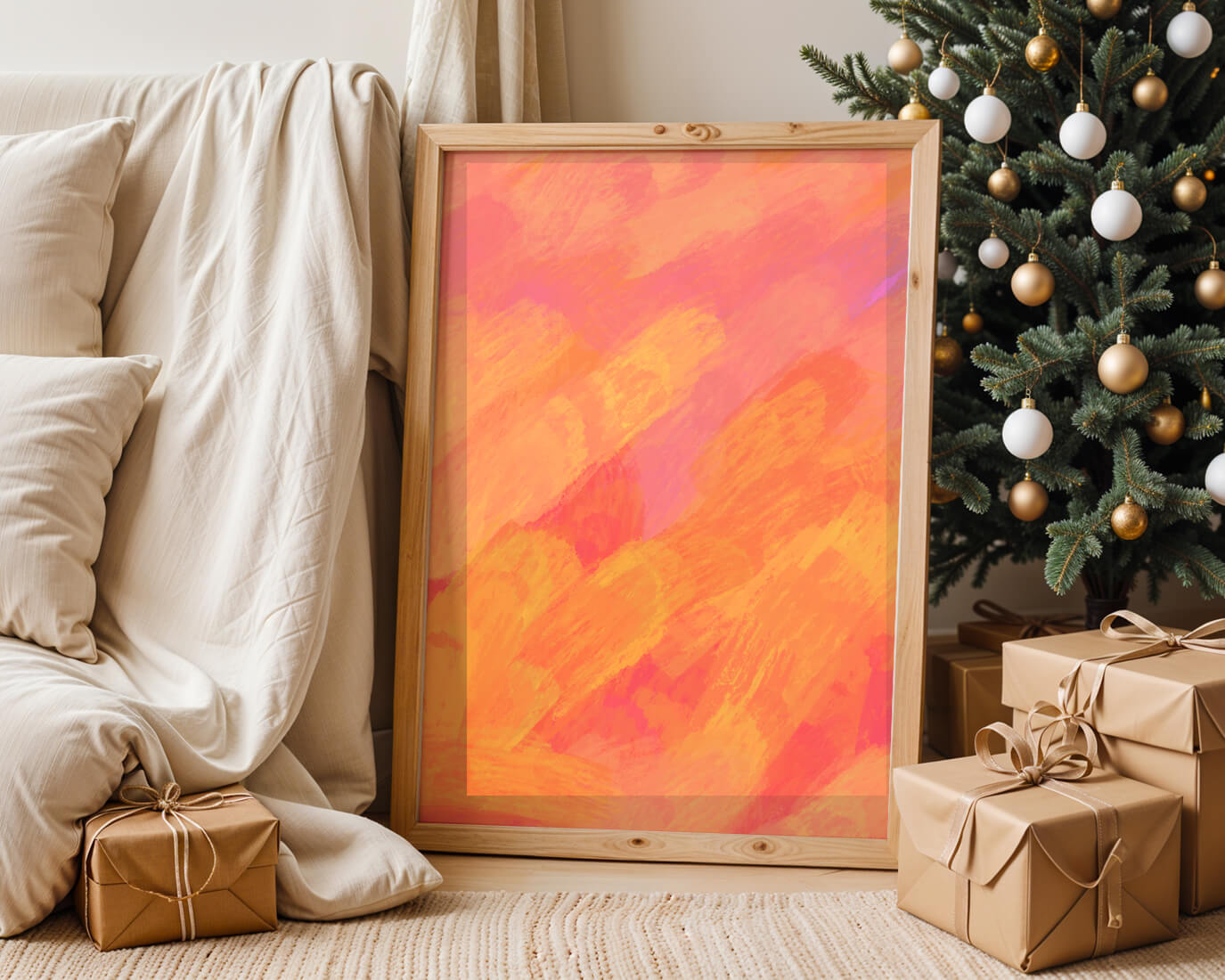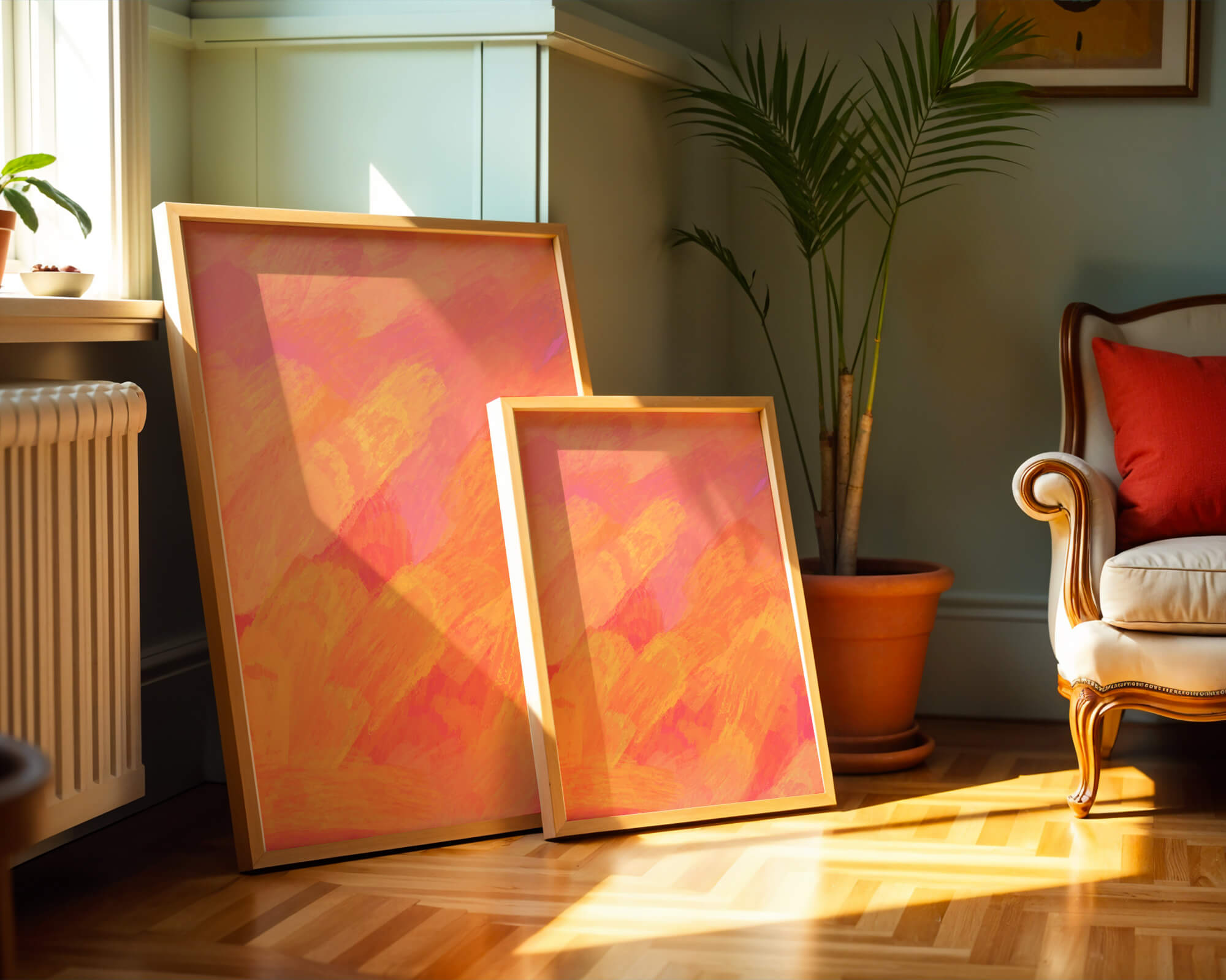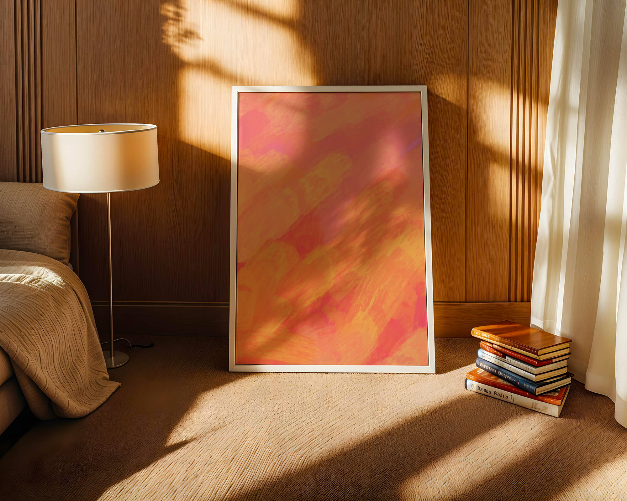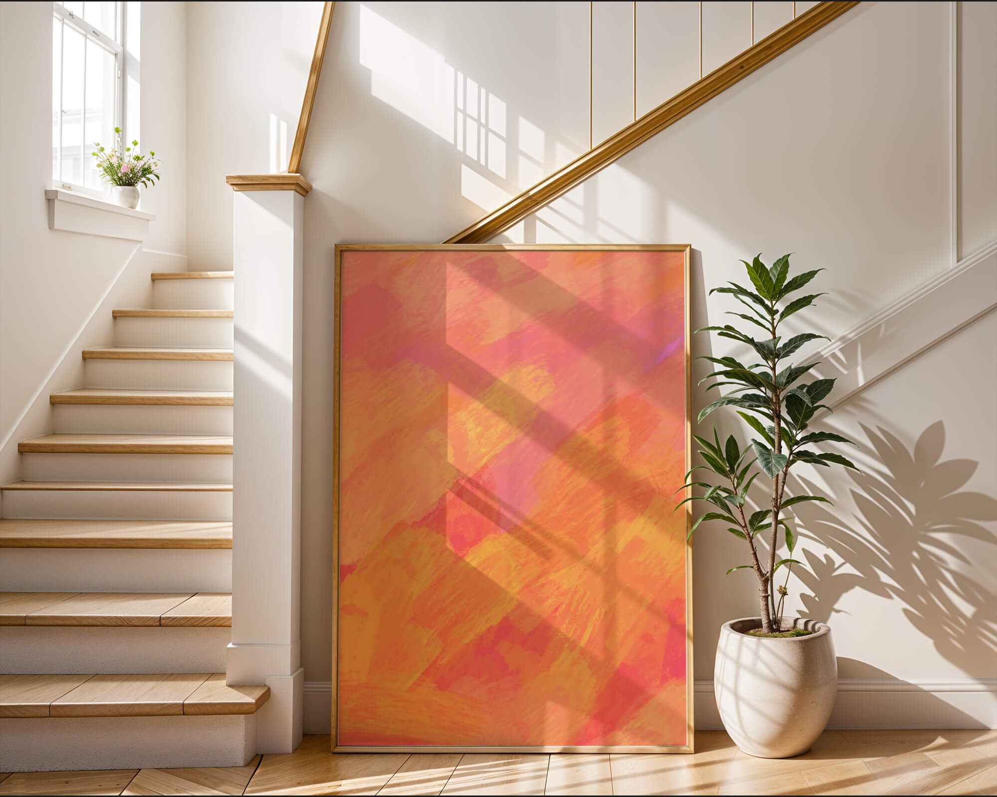 Esta vibrante y dinámica obra de arte presenta una mezcla de tonos cálidos con pinceladas expresivas. La composición utiliza matices de naranja, rosa y amarillo para crear una experiencia visual animada e invitante.