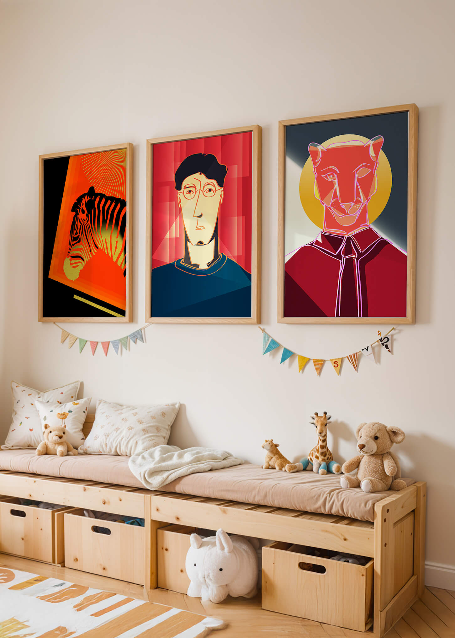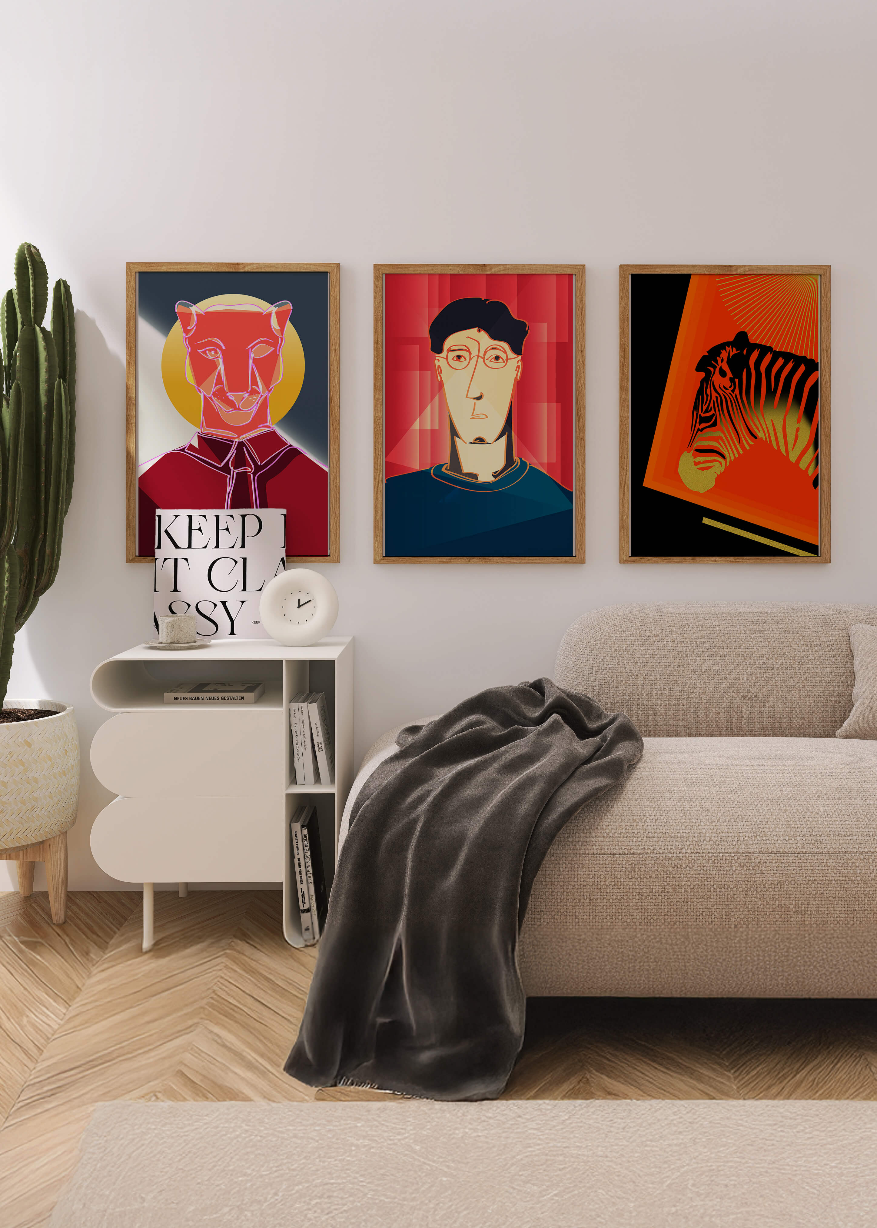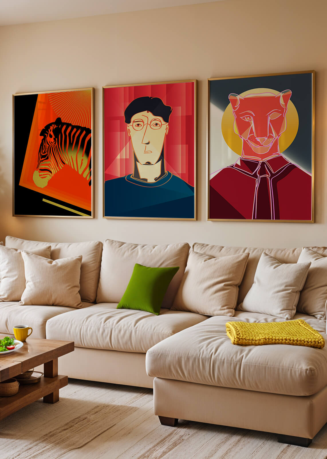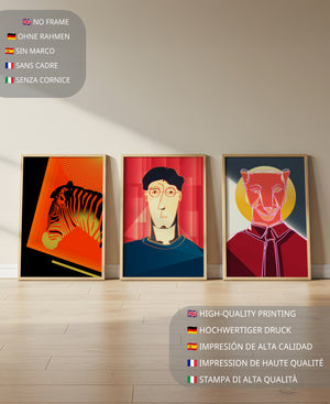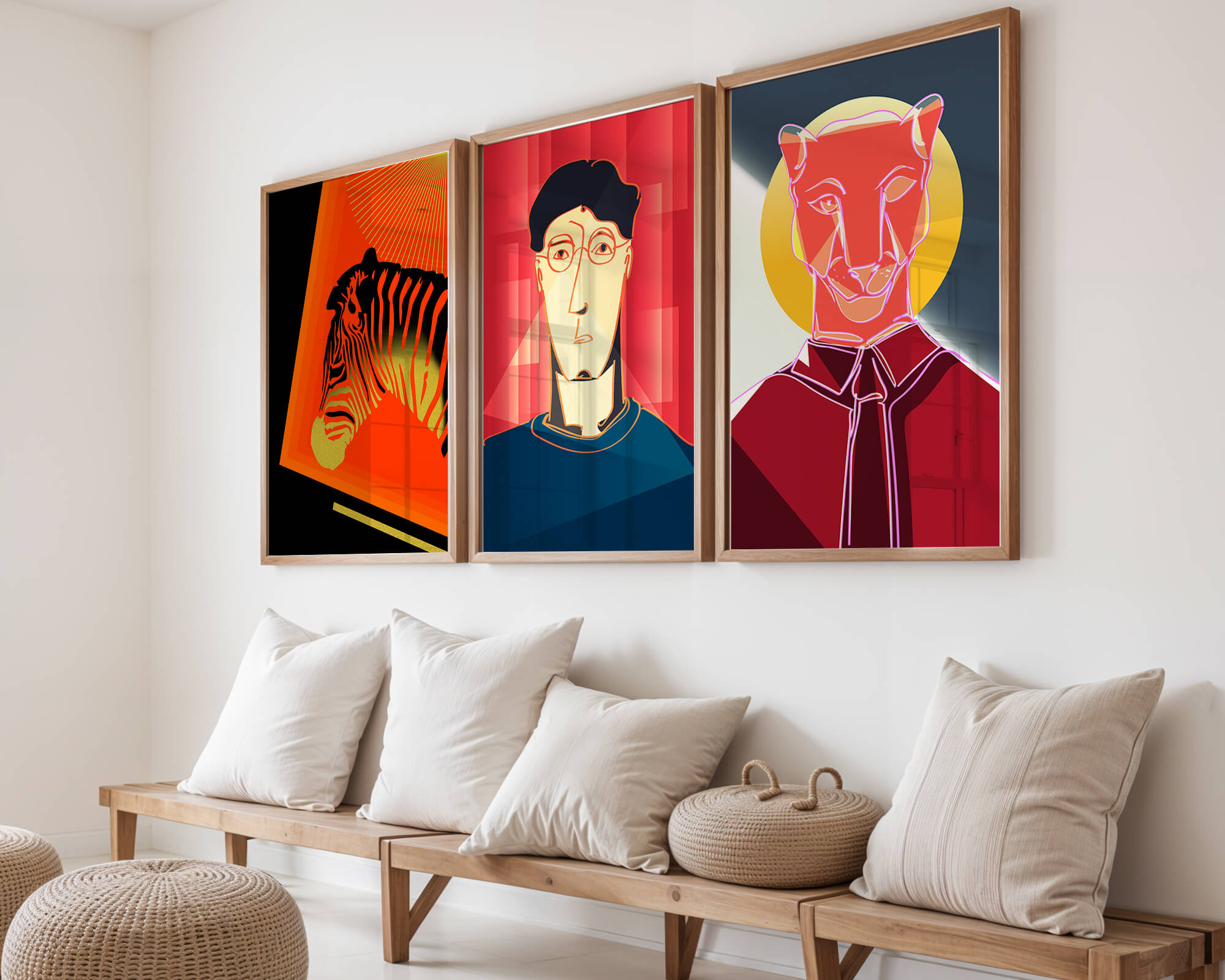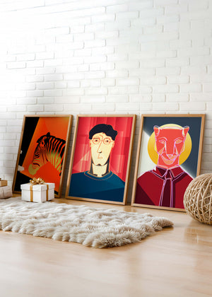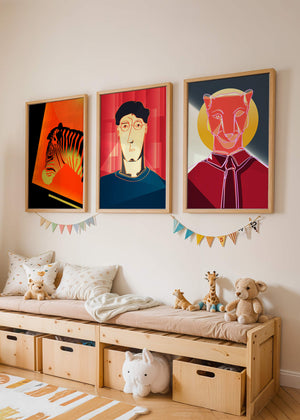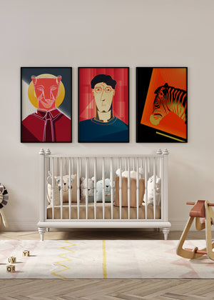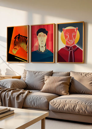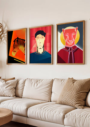 La primera obra en la colección muestra una cebra estilizada en un llamativo fondo naranja y negro, resaltando sus características líneas contrastantes. Esta pieza es un ejemplo sobresaliente de cómo los elementos naturales pueden ser transformados en arte moderno. La segunda impresión es un retrato geométrico de un rostro humano sobre un fondo rojo. Las formas abstractas y los tonos oscuros proporcionan una sensación de misterio y profundidad, haciendo de esta obra una adición intrigante a cualquier habitación. La tercera pieza representa una pantera delineada en un diseño mínimo pero impactante. Con un fondo azul y amarillo, esta obra combina la simplicidad del diseño lineal con un vibrante juego de colores. Esta colección de arte logra fusionar lo abstracto con lo figurativo de manera singular.| Tipo |